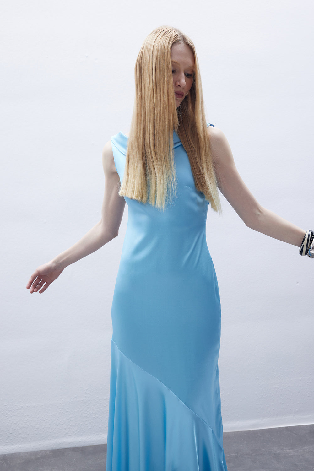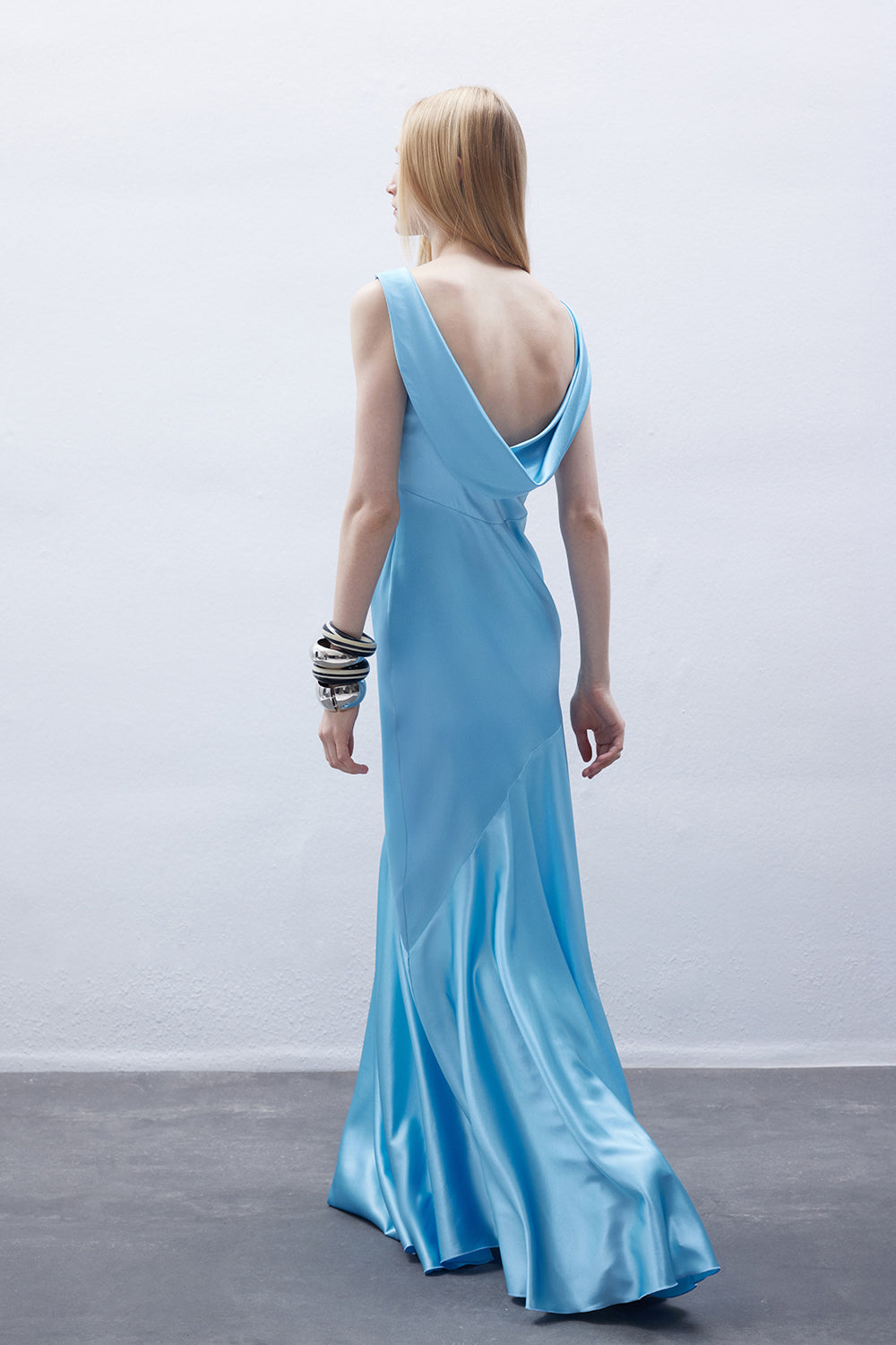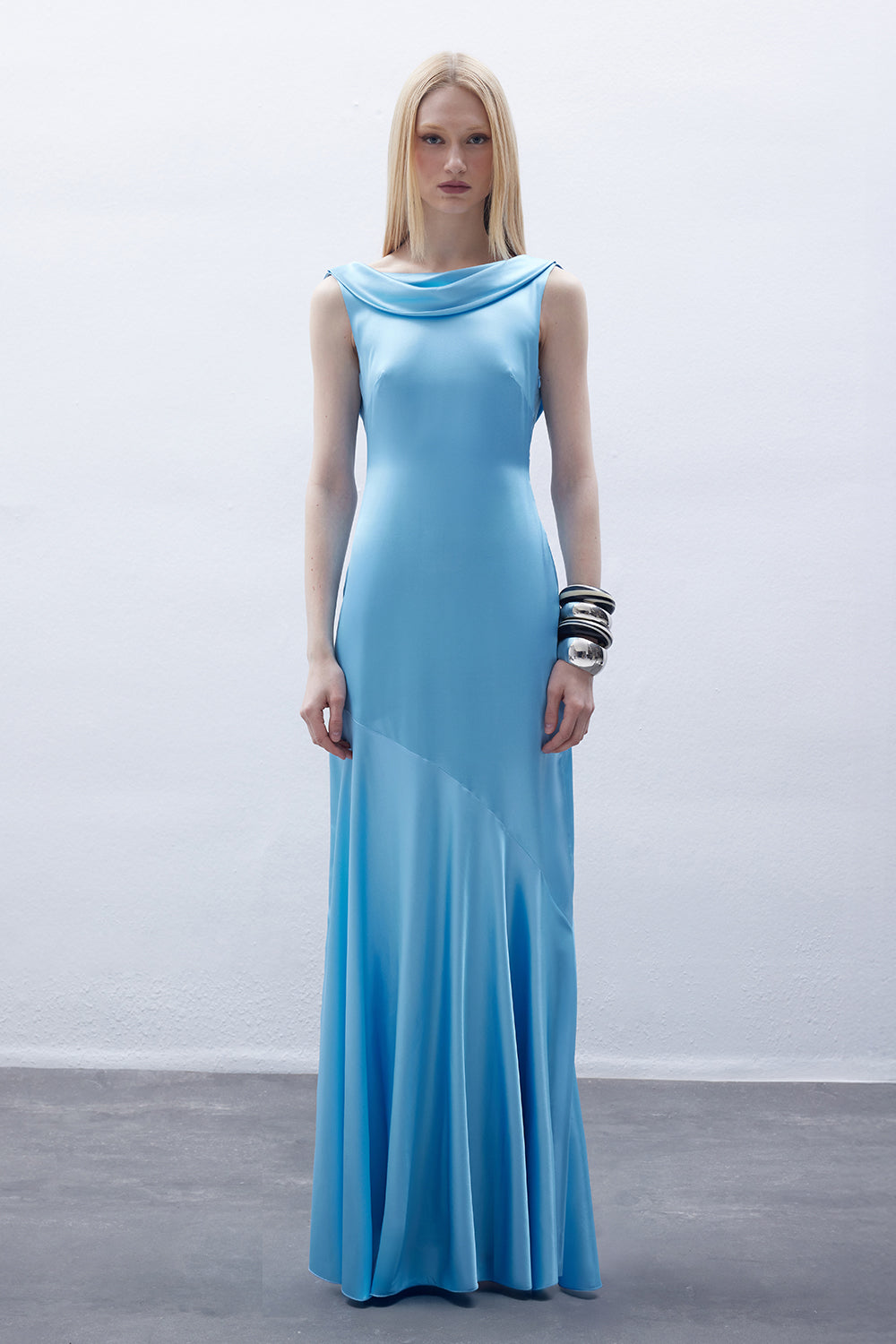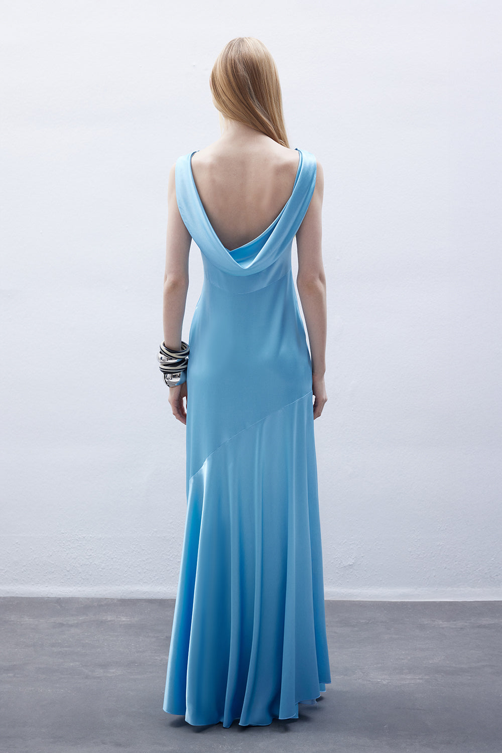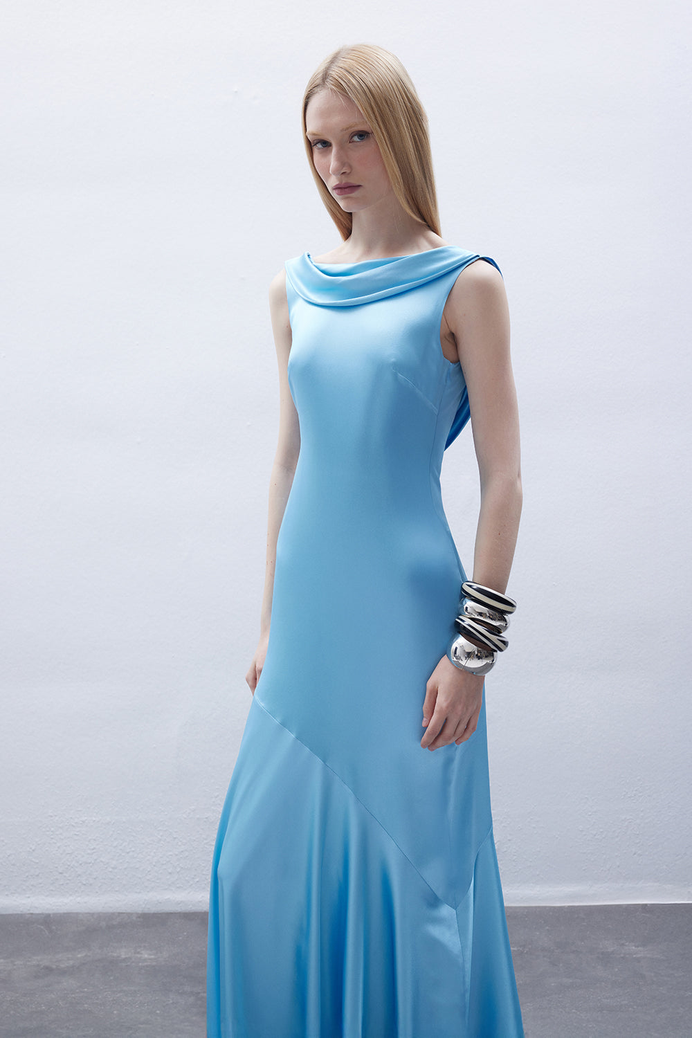 Bu elbise, ten üzerinde yumuşak ve hafif bir his sunar. Zarif kayık yaka kesimi, feminen bir siluet yaratır. Sırt kısmındaki düşük drape detayı ve akışkan ipek kuyruğu ise tasarıma büyüleyici bir dokunuş katar.