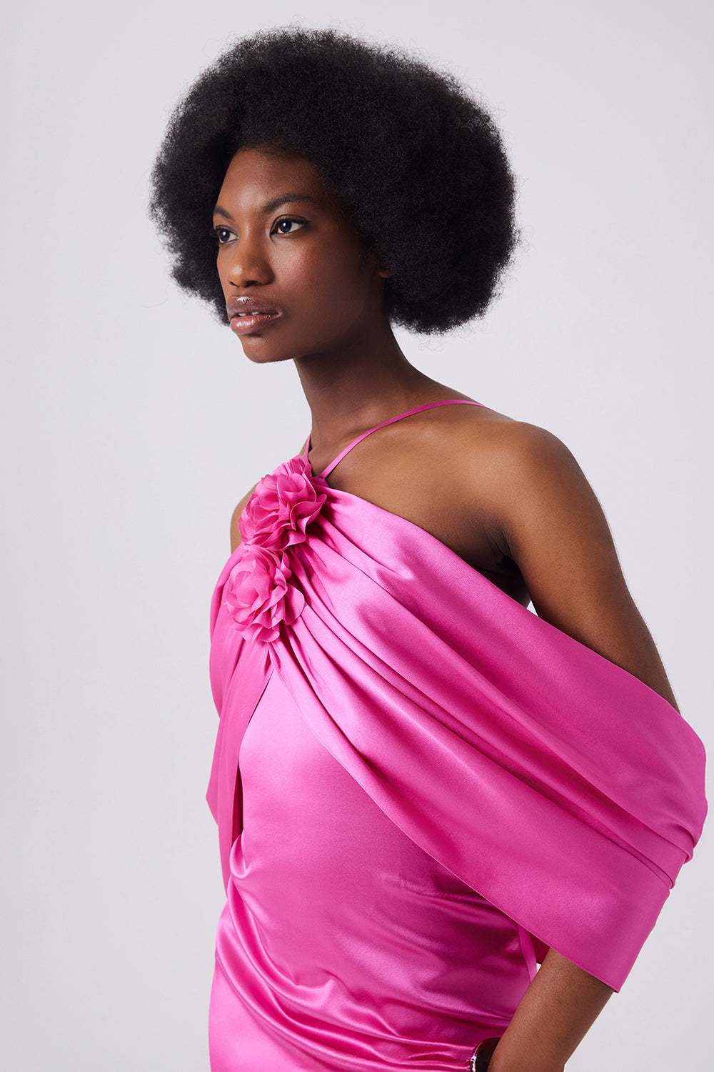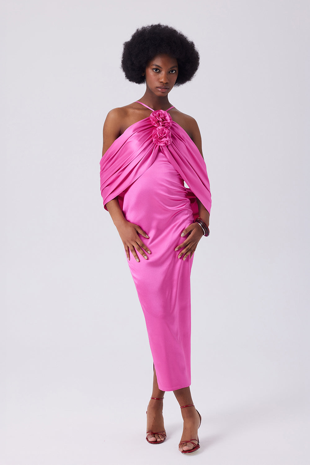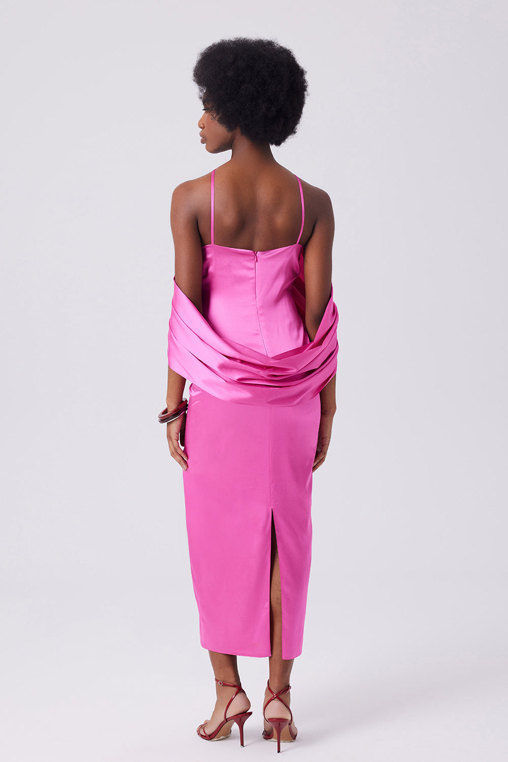 Şal detayı ve arka yırtmaçla tasarlanmış bu midi elbise, vücudu saran kalıbıyla zarif bir siluet sunar. Arka yırtmaç hareket özgürlüğü sağlarken, omuzdan akan şal detayı tasarıma feminen bir dokunuş katar.