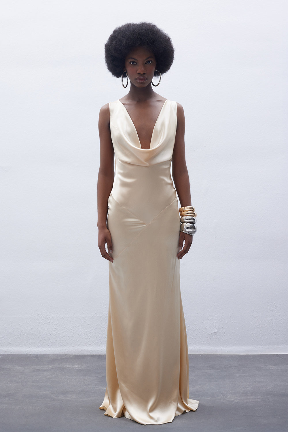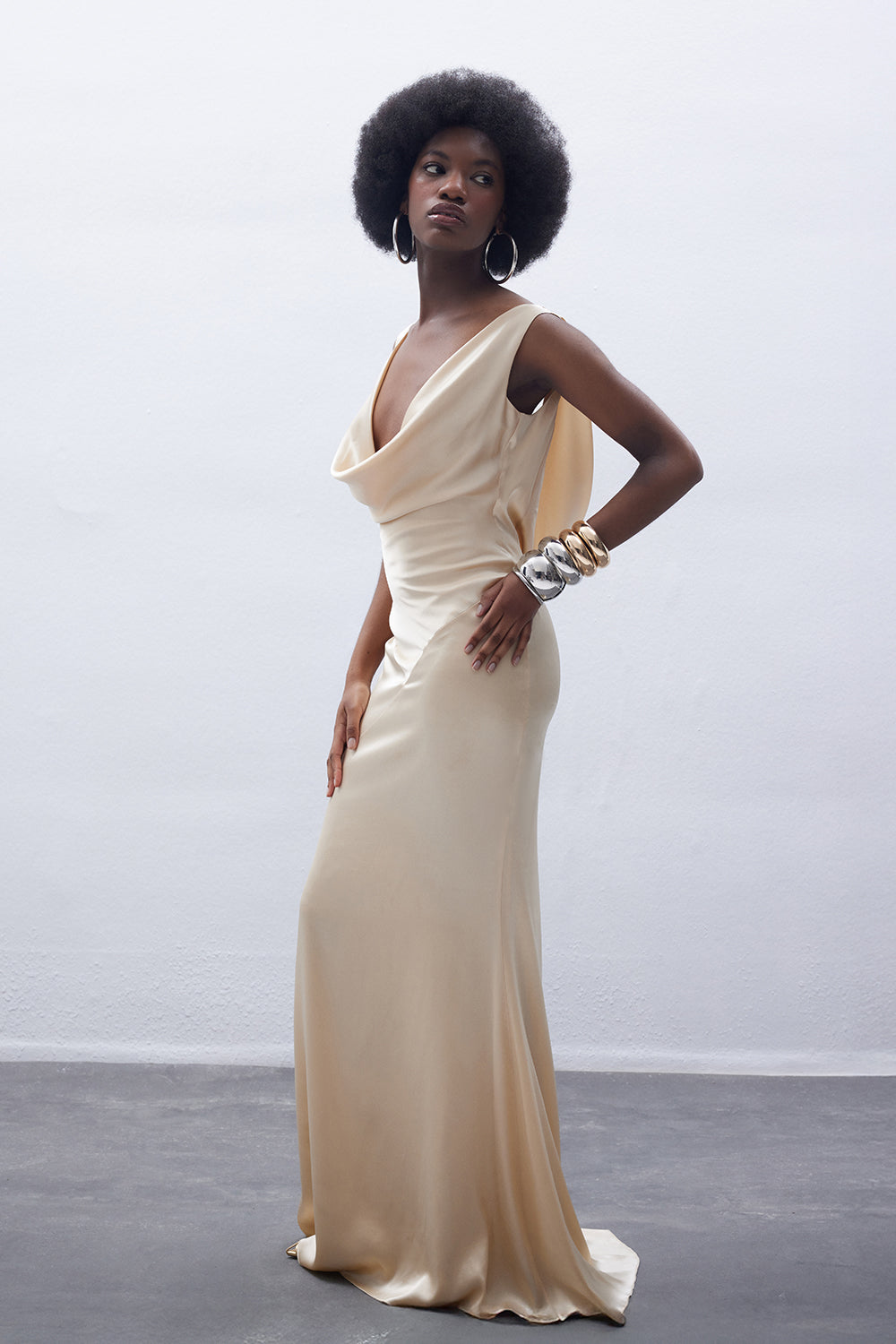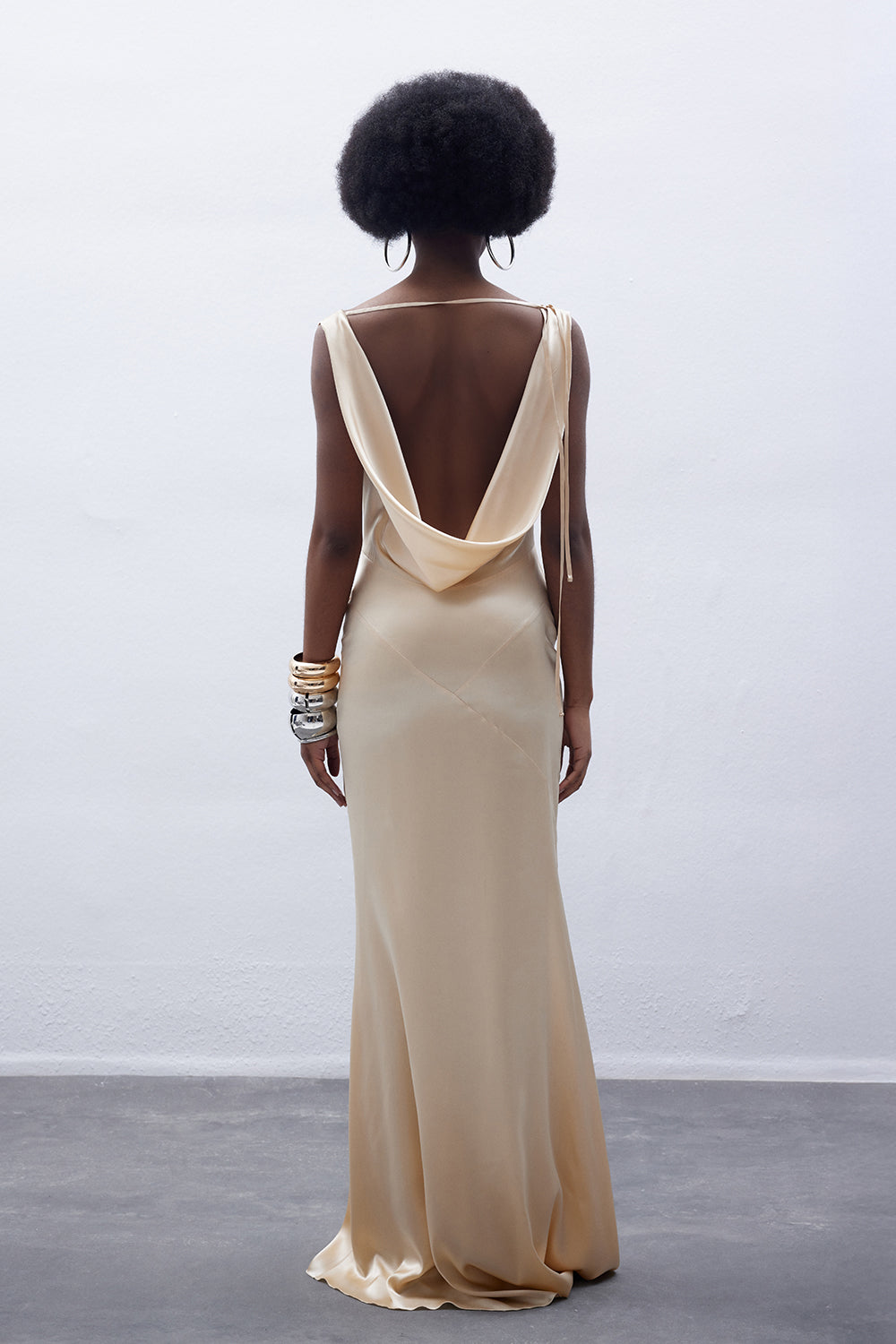 Isabetta Elbise, yumuşak ve akışkan ipek kumaştan özenle tasarlanmıştır. Hafif derinlikteki yaka kesimi zarif bir siluet sunarken, derin sırt dekoltesi sofistike bir dokunuş katar. Asimetrik dikiş detayı ise elbiseye modern ve göz alıcı bir karakter kazandırır.