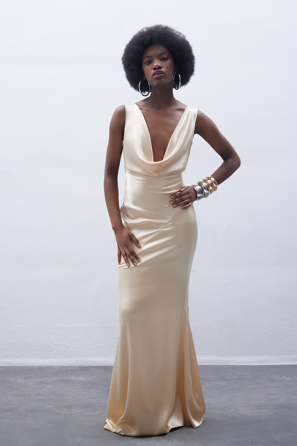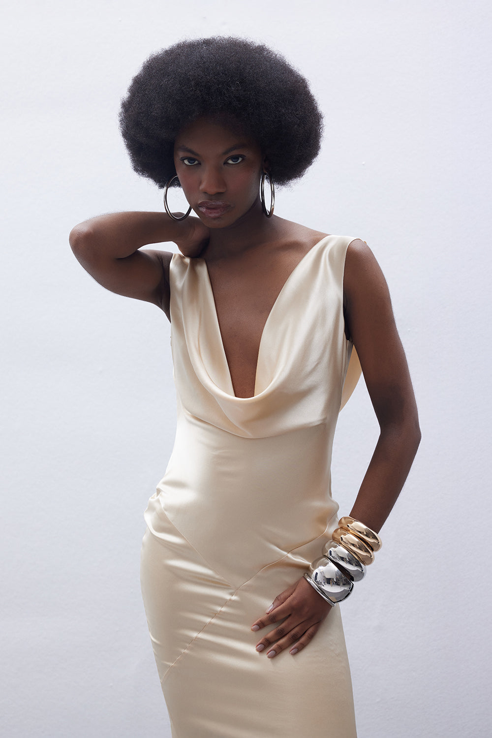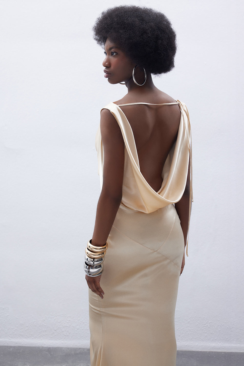 Isabetta Elbise, yumuşak ve akışkan ipek kumaştan özenle tasarlanmıştır. Hafif derinlikteki yaka kesimi zarif bir siluet sunarken, derin sırt dekoltesi sofistike bir dokunuş katar. Asimetrik dikiş detayı ise elbiseye modern ve göz alıcı bir karakter kazandırır.