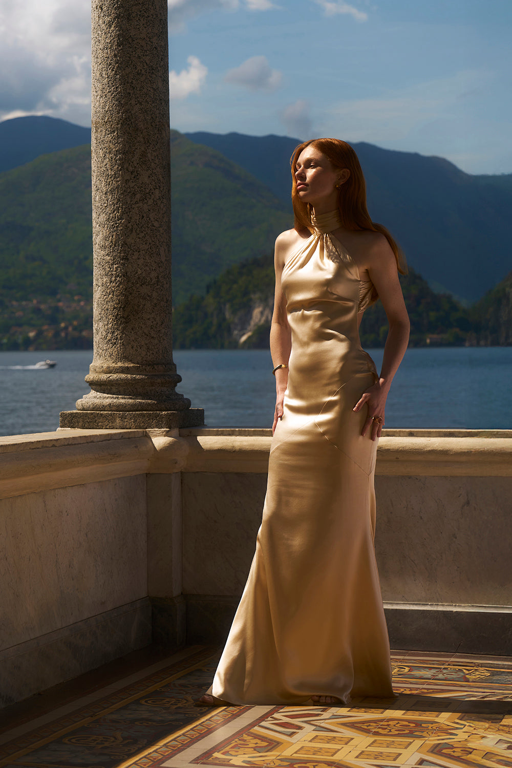 Cesur sırt dekoltesi, modern ve zarif bir dokunuş katarken; yumuşak dokulu ipek kumaş vücudu kusursuzca sarar. Yüksek halter yaka ve vücuda oturan balık formu, feminen hatları zarifçe vurgular.