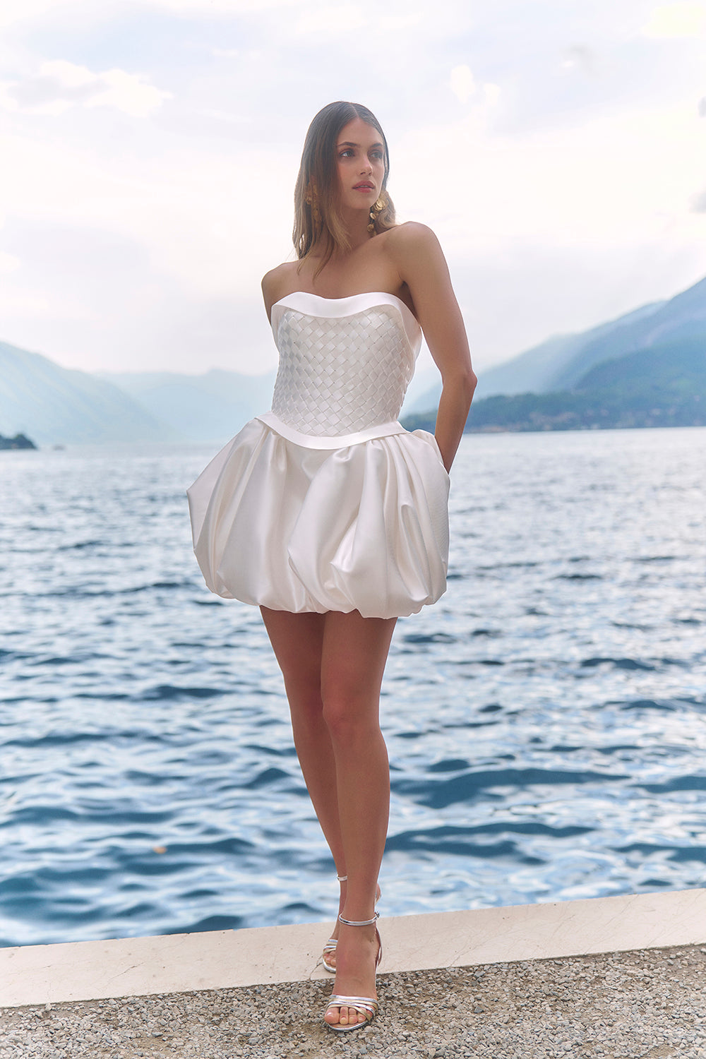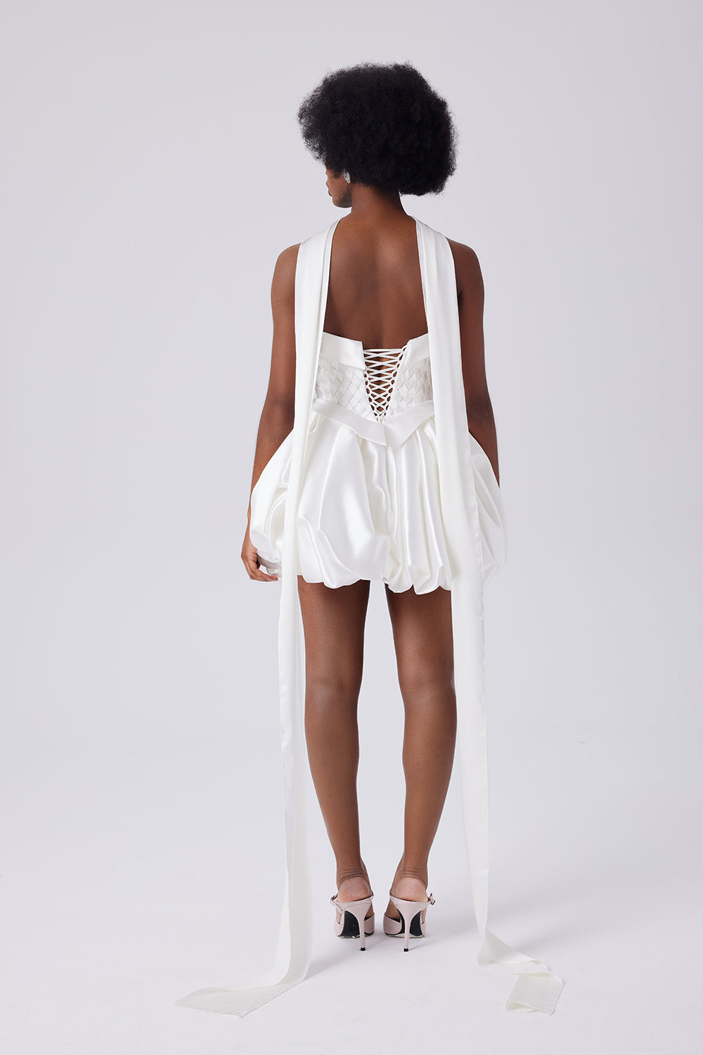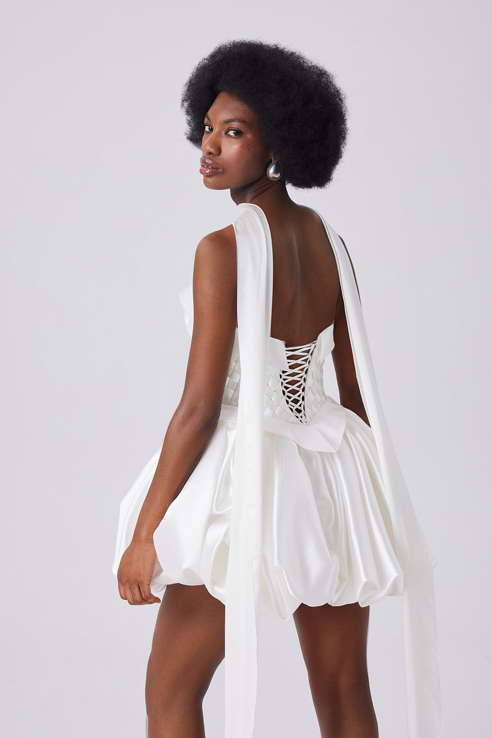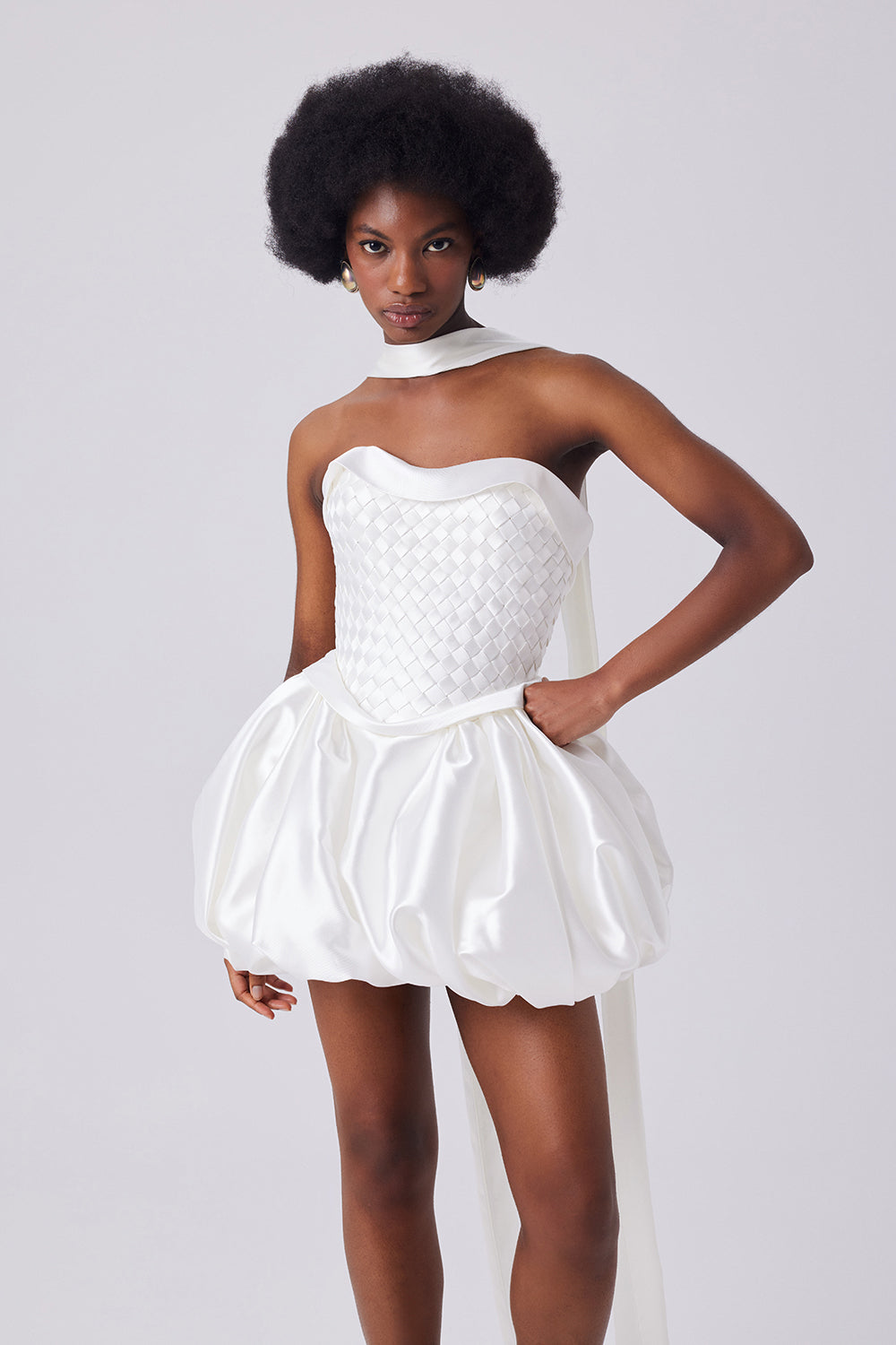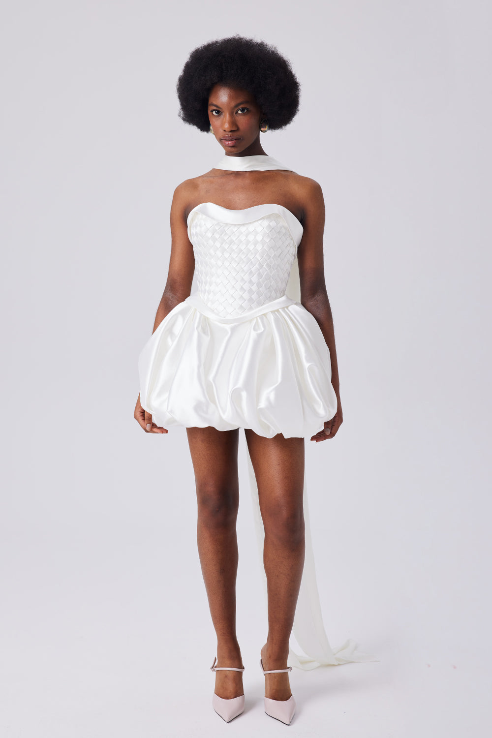 Bu mini elbise, gövde kısmında yer alan hasır dokusunu andıran el örmesi detaylarla zenginleştirilmiştir. Kusursuzca yapılandırılmış balon etek, siluete feminen ve heykelsi bir hacim kazandırır. Arka bölümde bulunan ayarlanabilir bağcıklar ise elbisenin vücuda tam oturmasını sağlar.