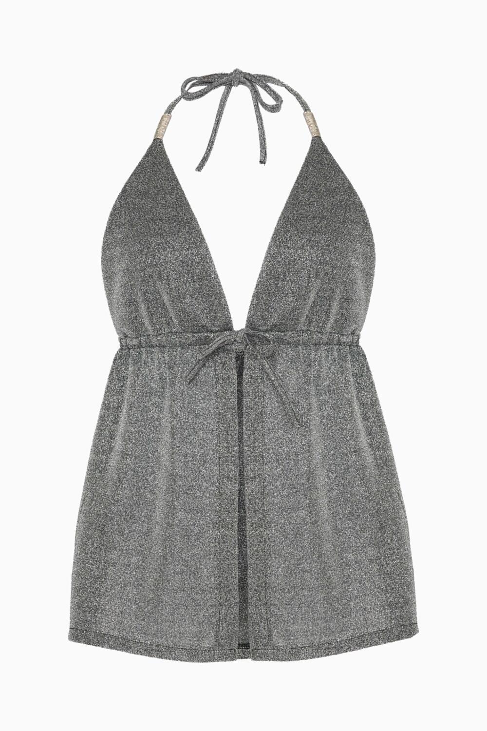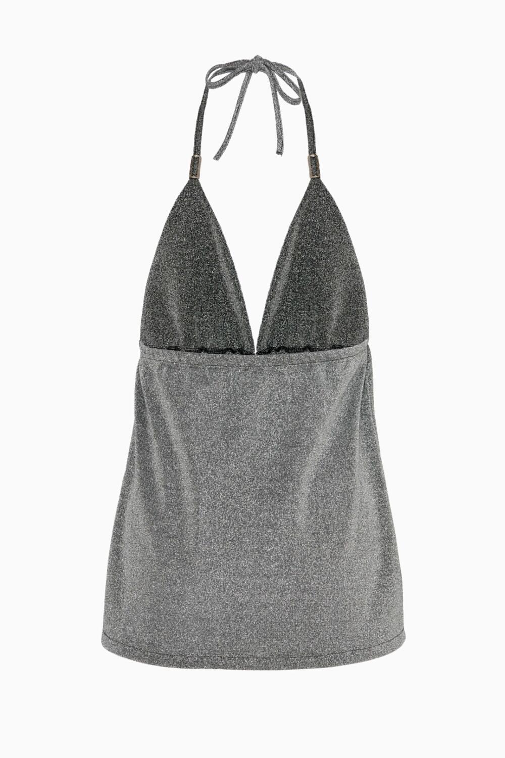 Boyundan ve göğüsten bağlamalı, sırtı açık, üst.