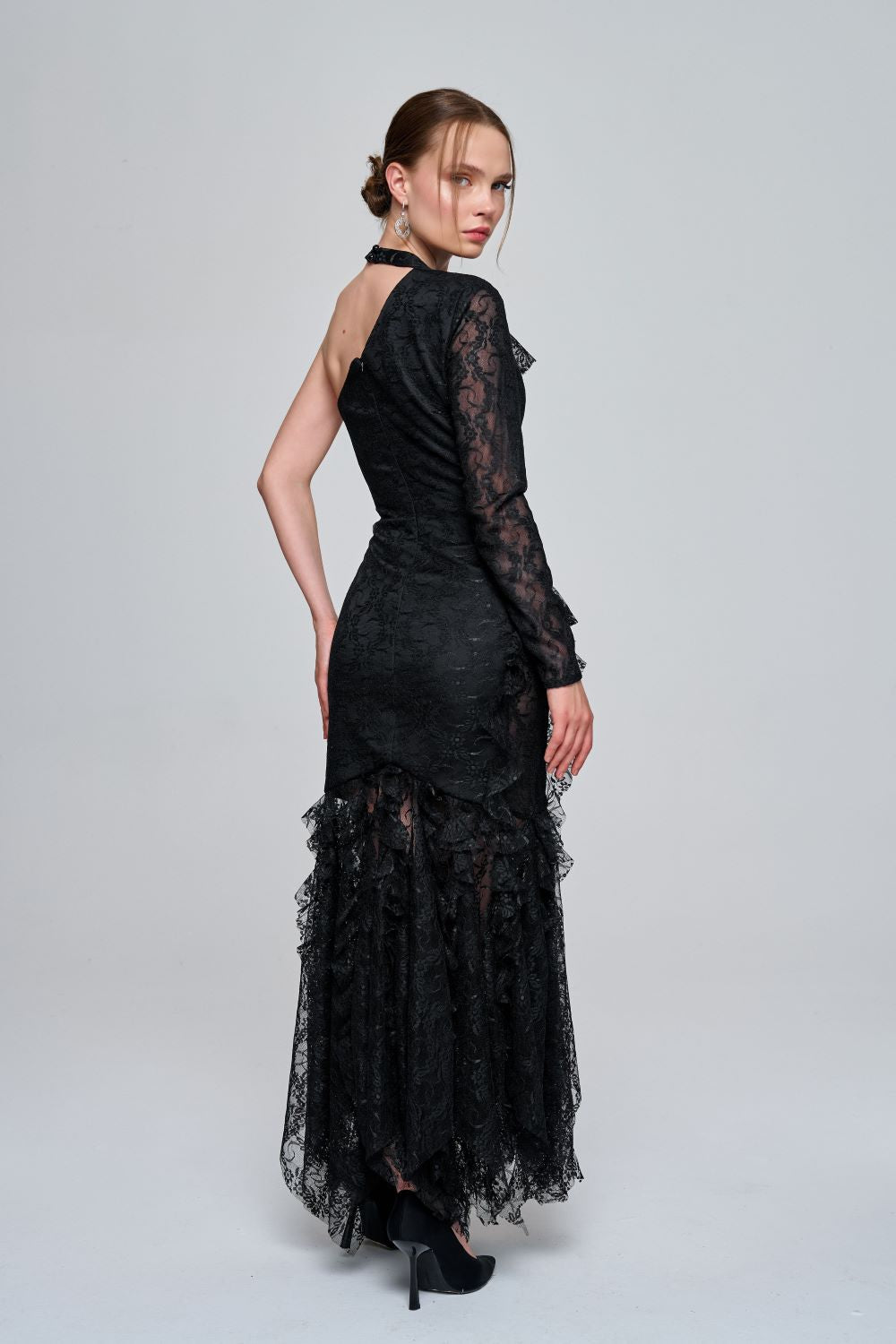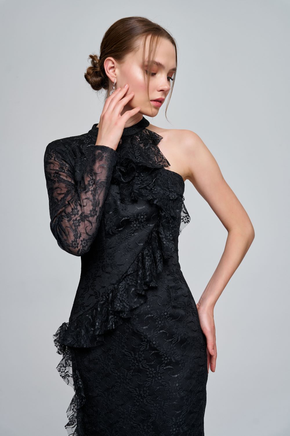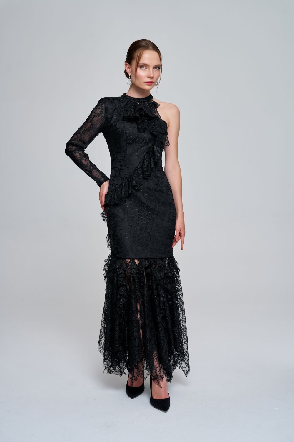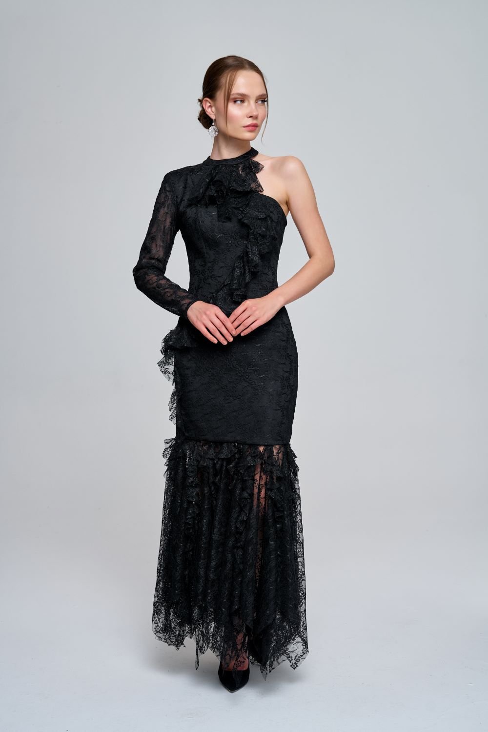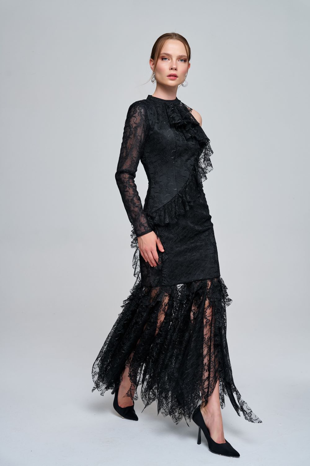 Asimetrik Volanlı Tek Kol Dantel Siyah Elbise