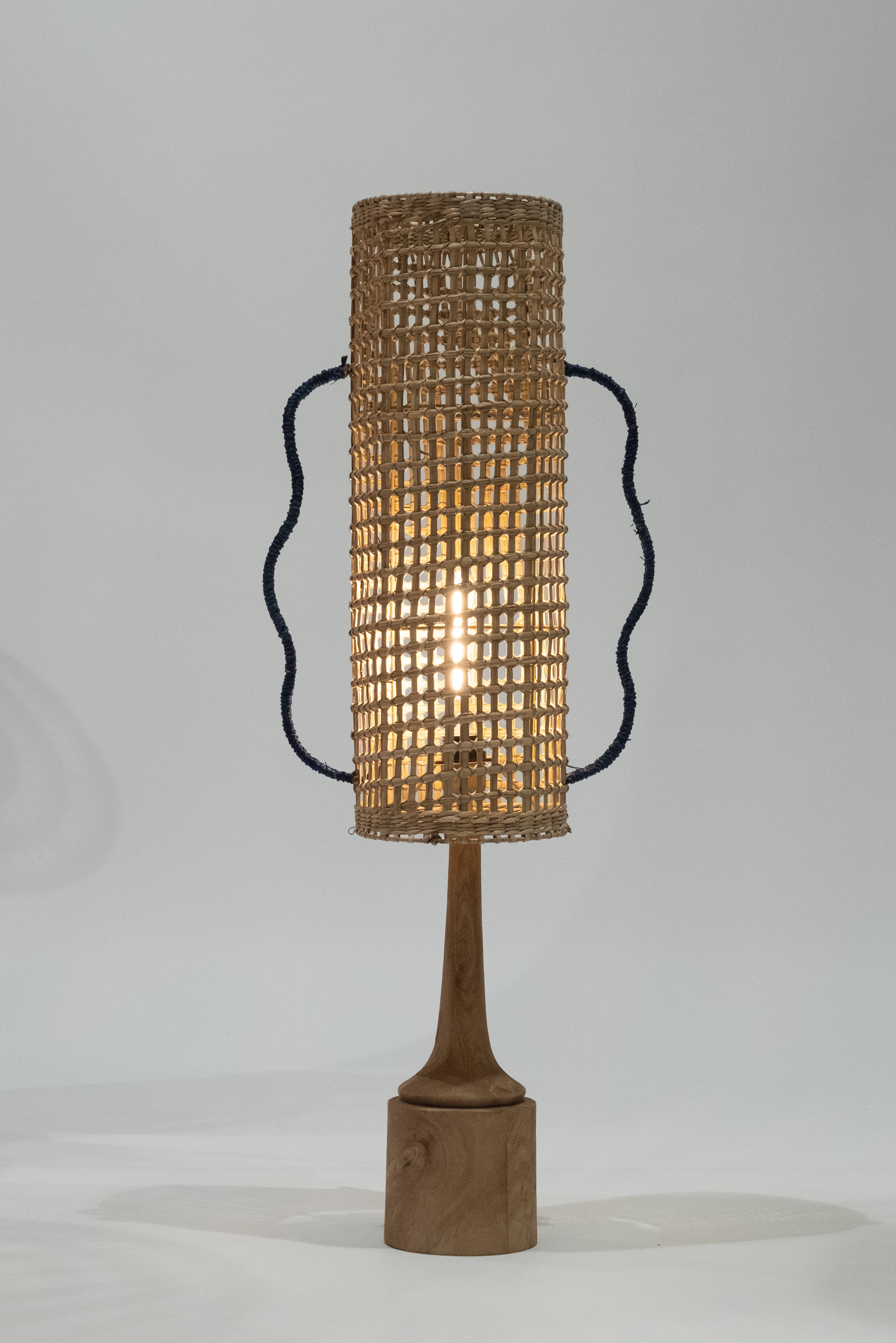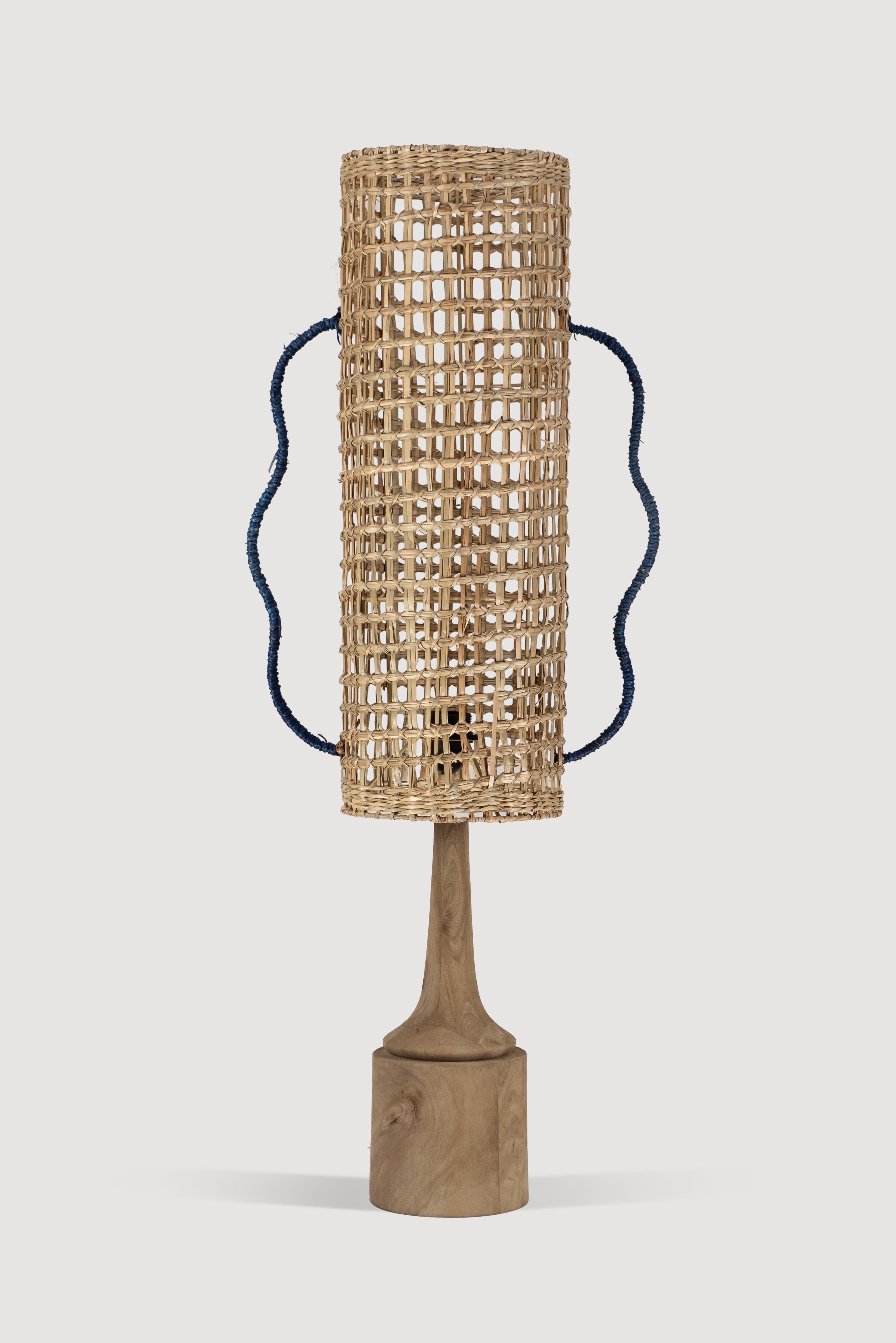 Silindirik örgüye sahip bir abajur ile tasarlanmış şık bir masa lambası görülüyor. Abajurun hasır veya rattan deseni, ışığın aralıklardan geçmesine olanak tanıyarak sıcak ve davetkar bir ambiyans oluşturuyor. Lamba, doğal ahşaptan yapılmış pürüzsüz bir taban ve standa sahip olup, abajurun organik dokusuna zarif bir kontrast sağlıyor. Ayrıca, abajurun her iki tarafına eklenmiş koyu renkli, dalgalı iki tutacak detayı da tasarıma özgün bir dekoratif unsur katıyor. Bu abajur, bohem veya doğal malzemelere odaklanan eco-chic tarzındaki iç mekanlarla mükemmel uyum sağlayabilir.