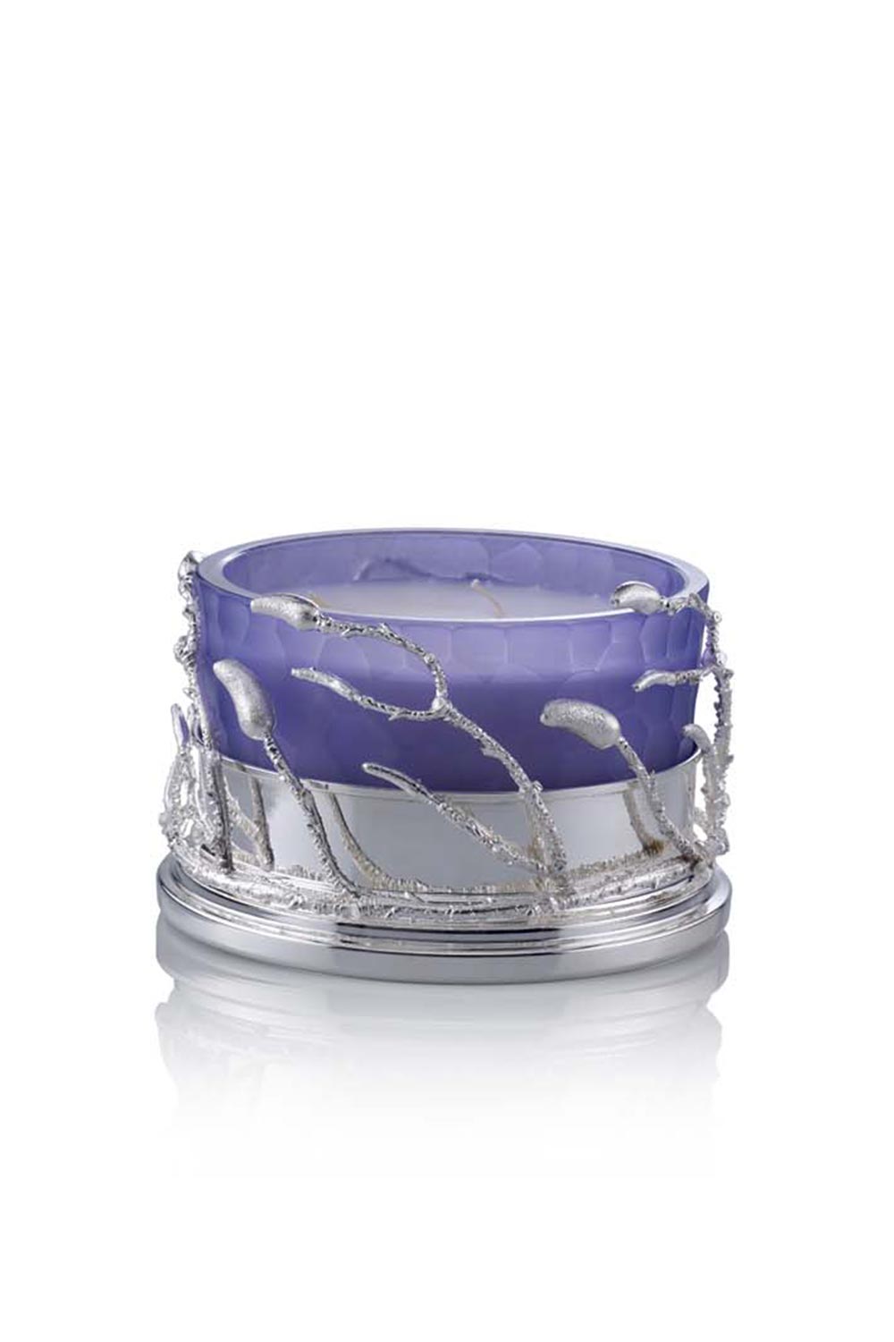 Gümüş kaplama dal detaylı, petek dekorlu mor cam mumluktan oluşan özel tasarım, el yapımı dekoratif mumluk.