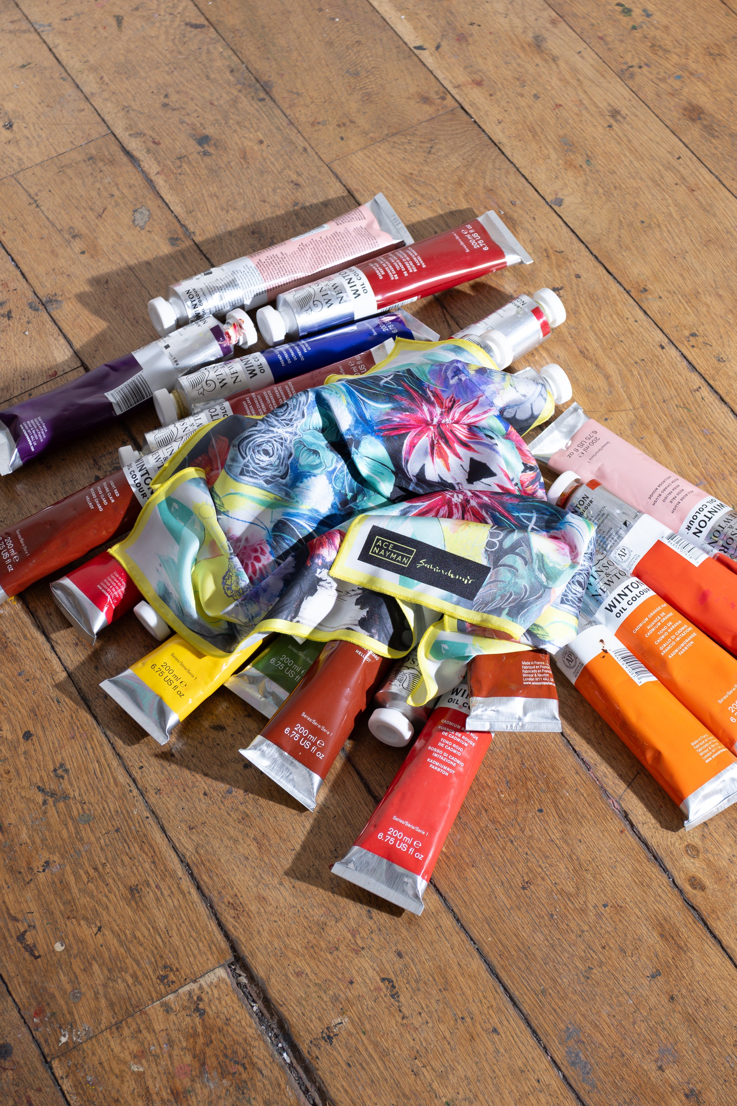 Şahin Demir, known for his abstract compositions and layered use of color, creates works that blend personal emotions with universal themes. Founded in 2019 by Ece Nayman, Ace Nayman is a contemporary fashion brand that combines youth culture with refined sophistication, standing out with bold color palettes, abstract patterns, and luxury production quality. Bloomscape emerged from the meeting of these two distinct worlds, referencing the brand’s Fall/Winter 25–26 collection and bringing art and fashion together within the same framework.