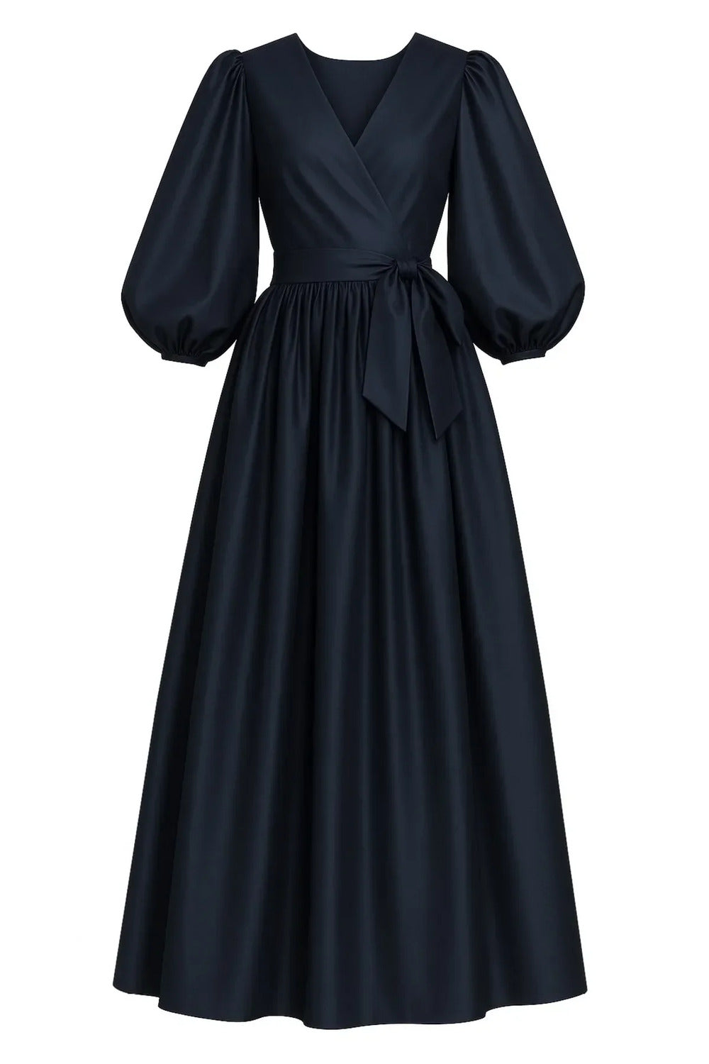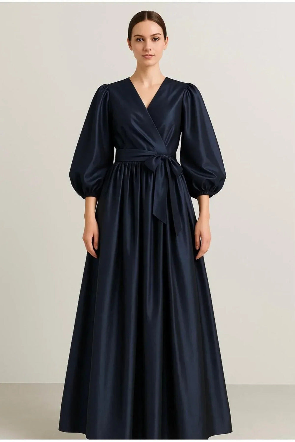 Kruvaze Kapamalı, Kuşaklı & Balon Kollu Gece Mavisi Tafta Maxi Elbise