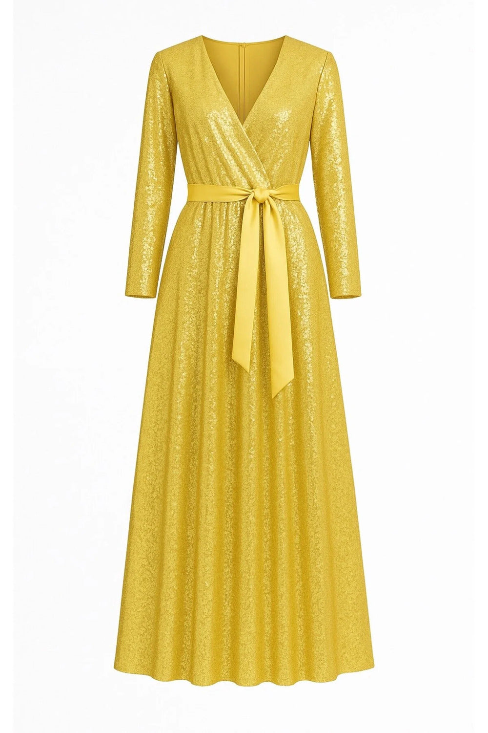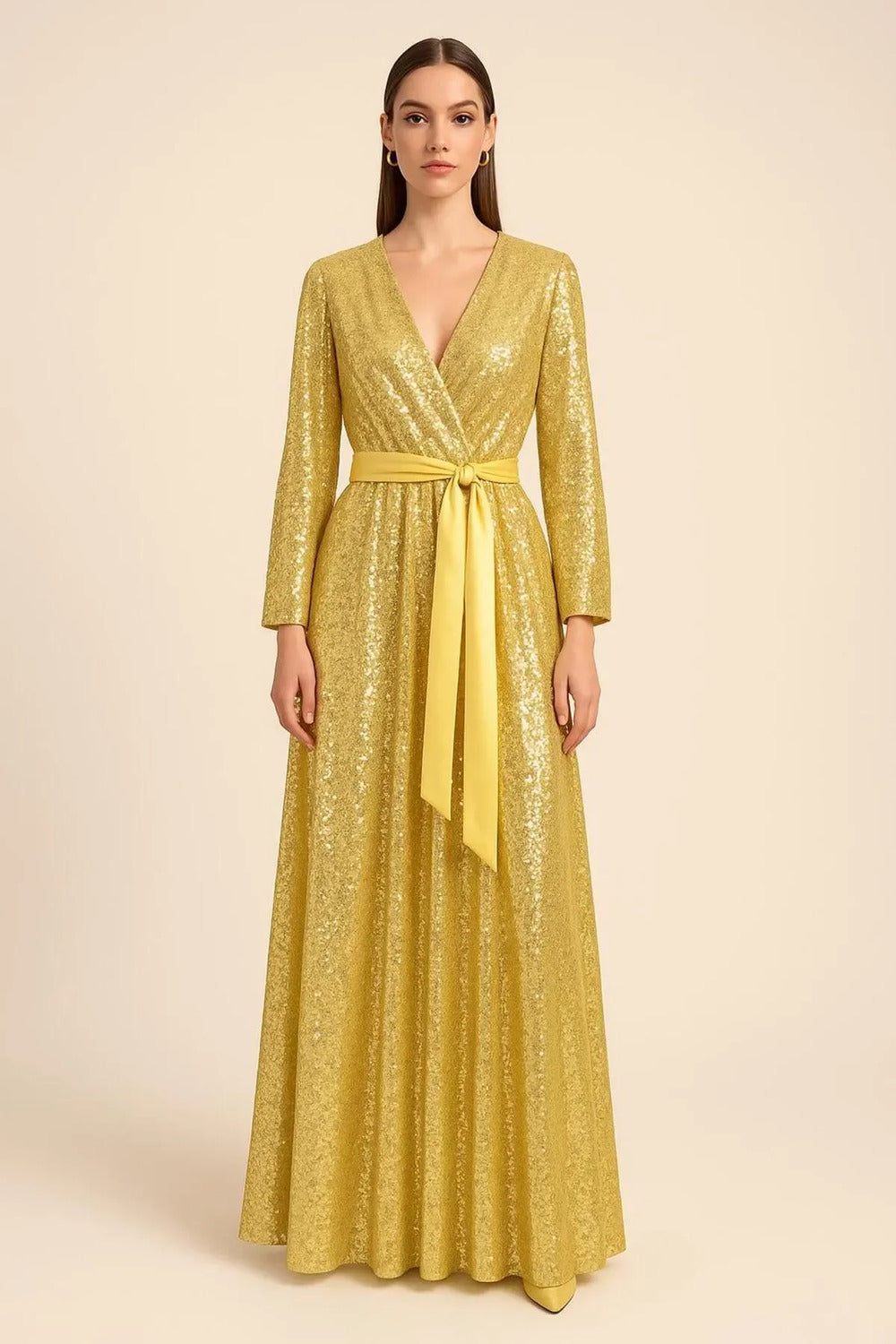Kruvaze Kapamalı & Kuşaklı Gold Sarı Payet Maxi Şık Elbise
