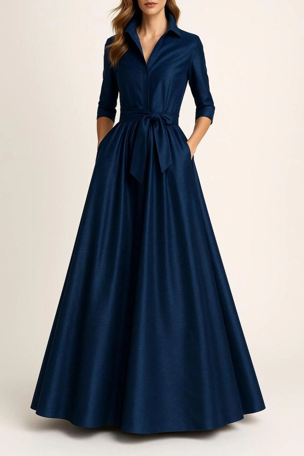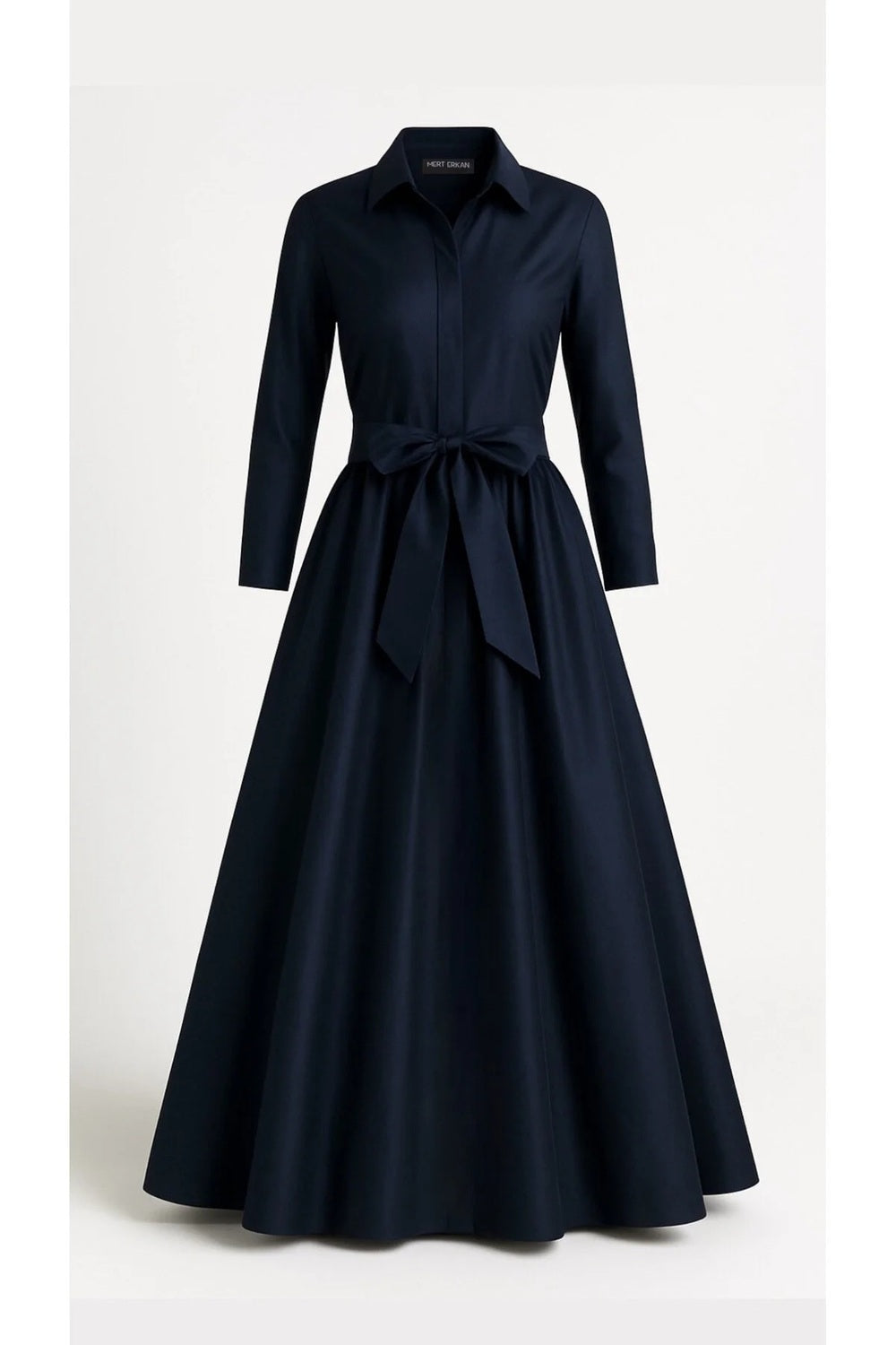 Kuşakla Bağlama Detaylı Gece Mavisi Tafta Uzun Gömlek Elbise