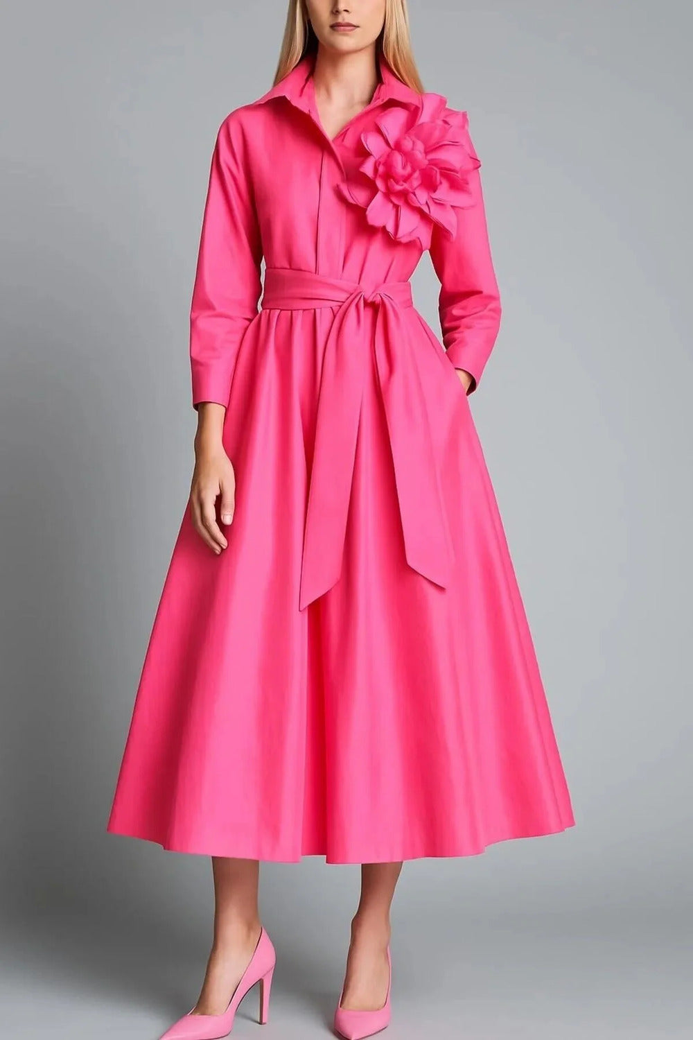 Kuşaklı & Drape Çiçek Detaylı Açık Fuşya Midi Gömlek Elbise