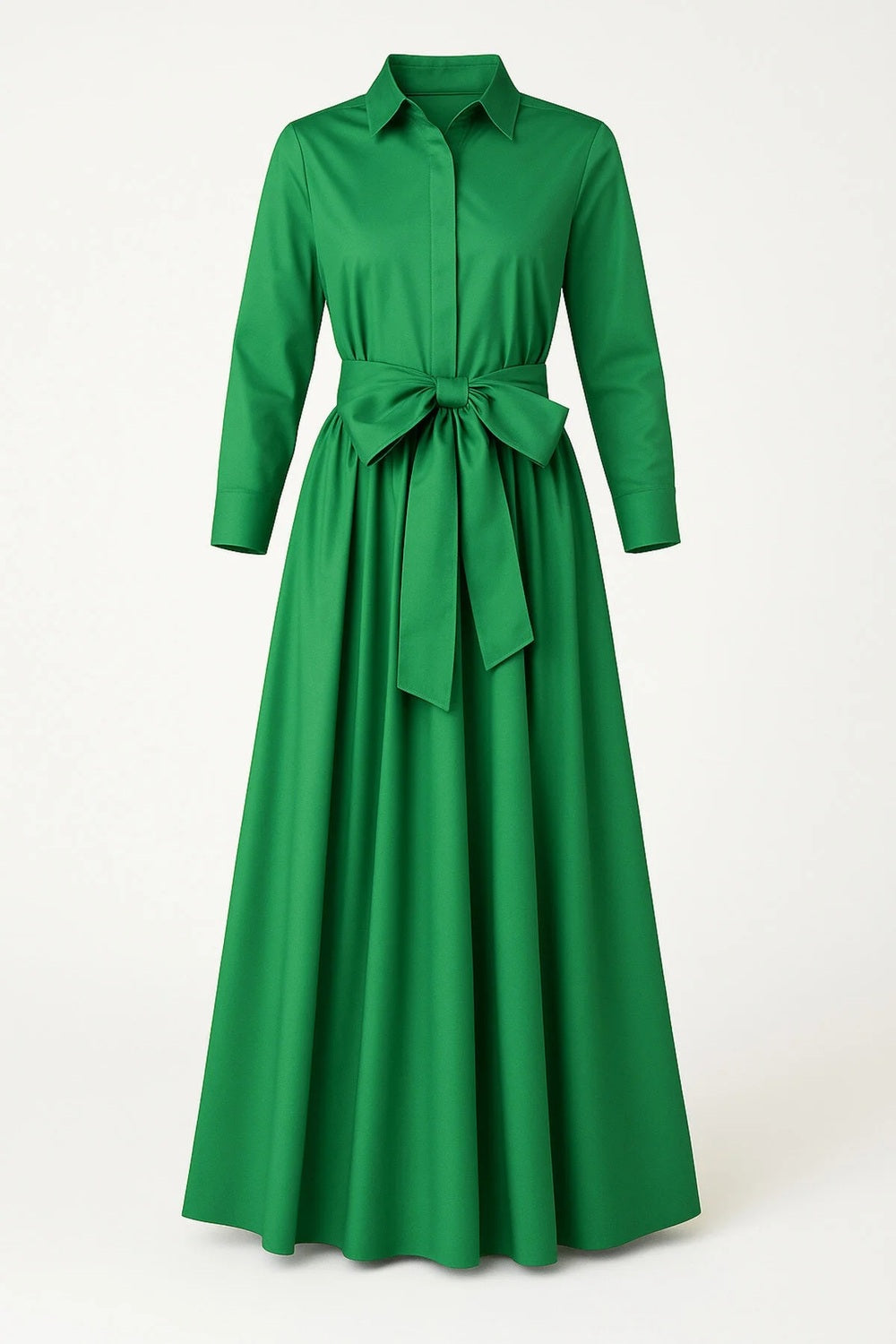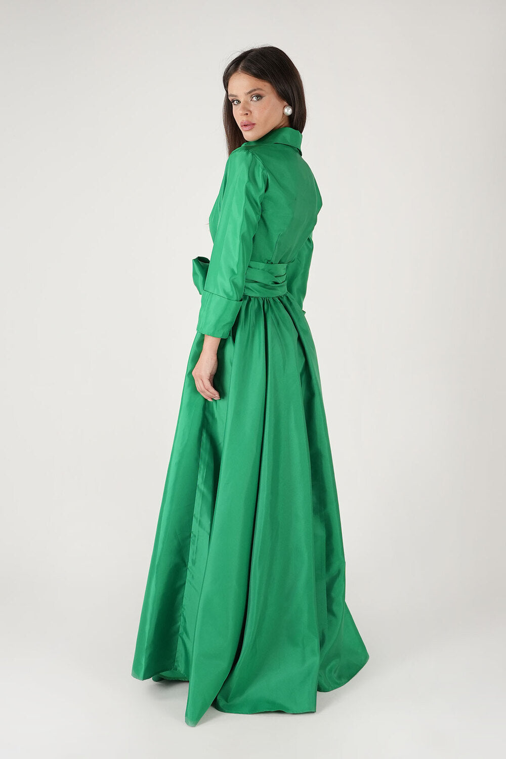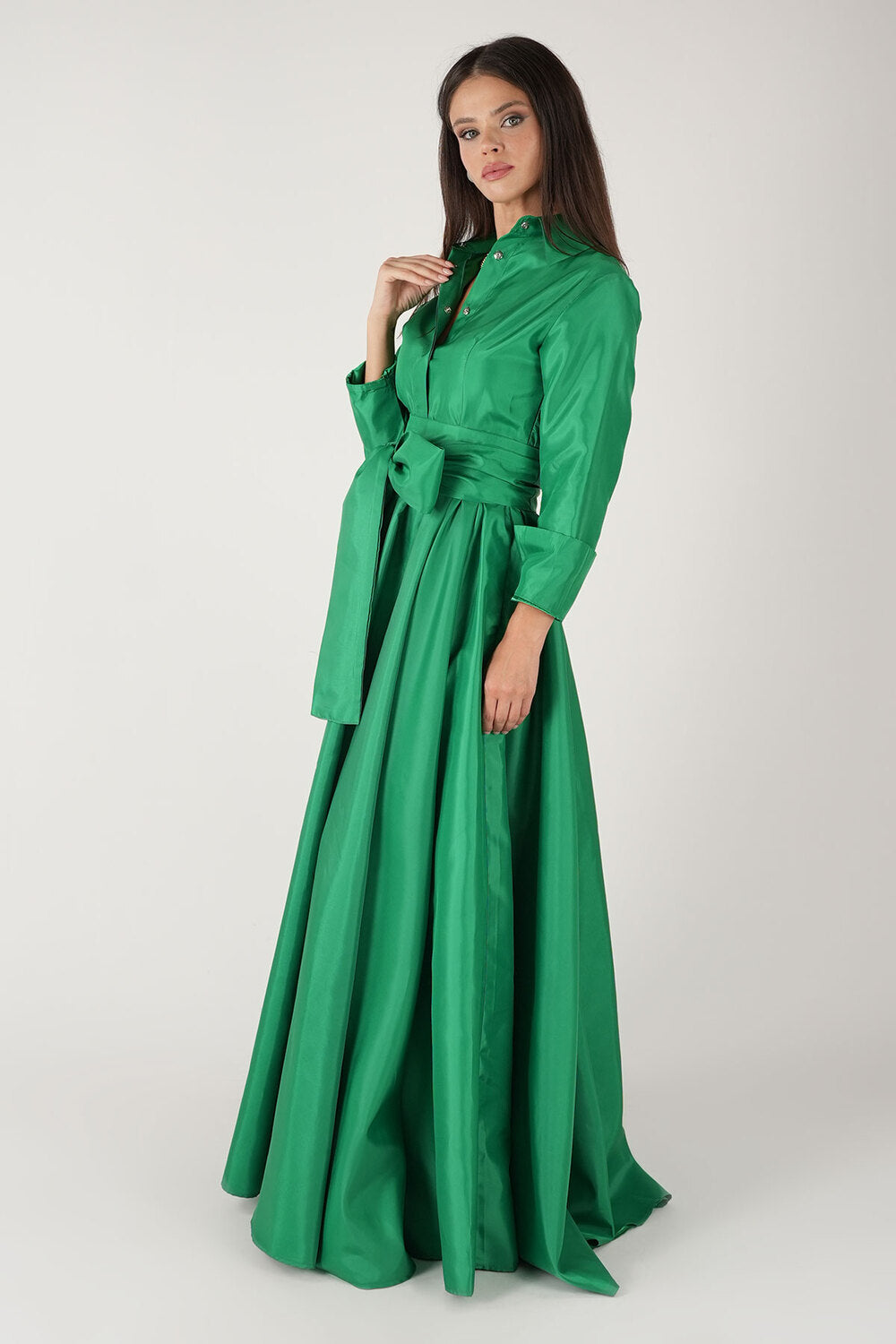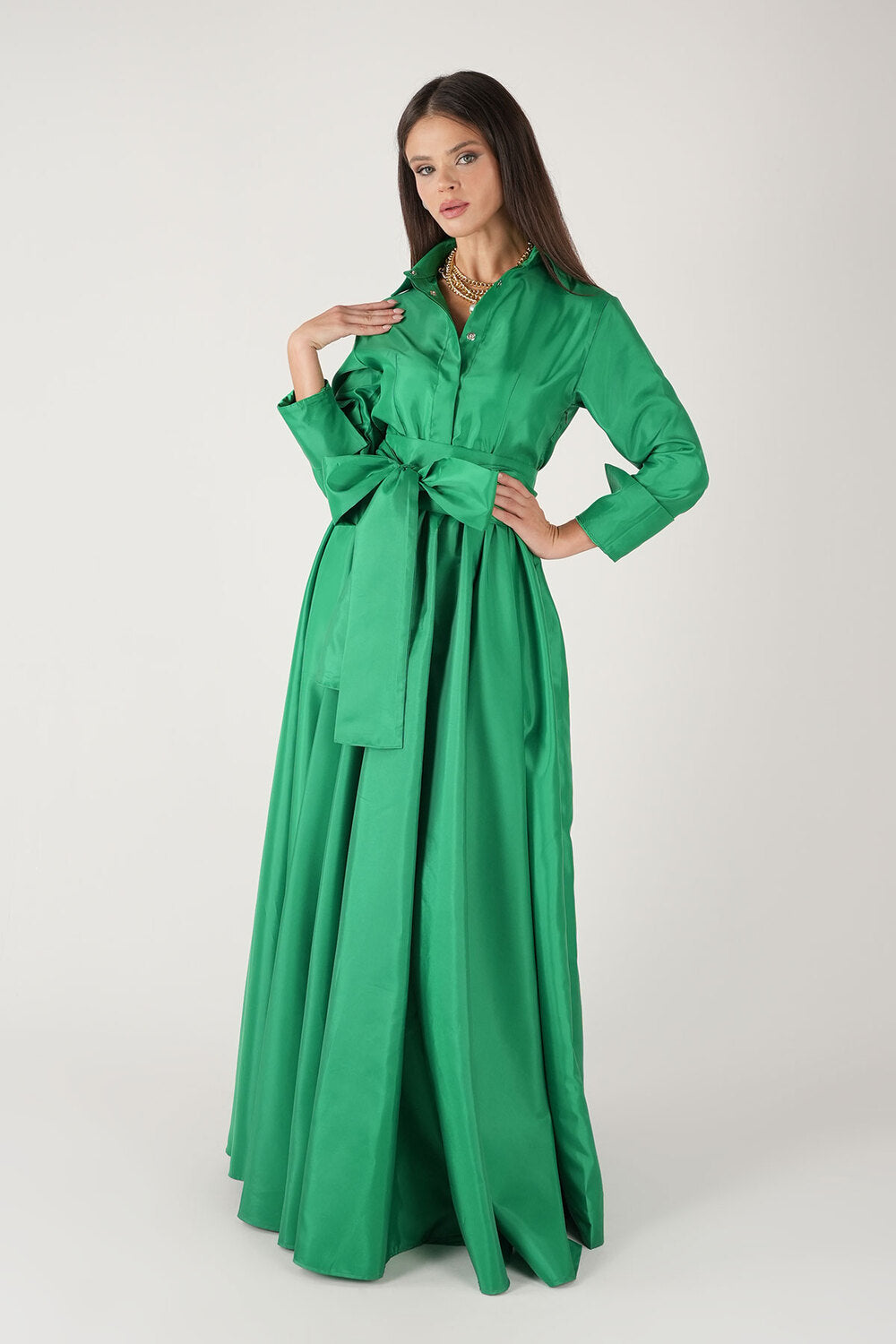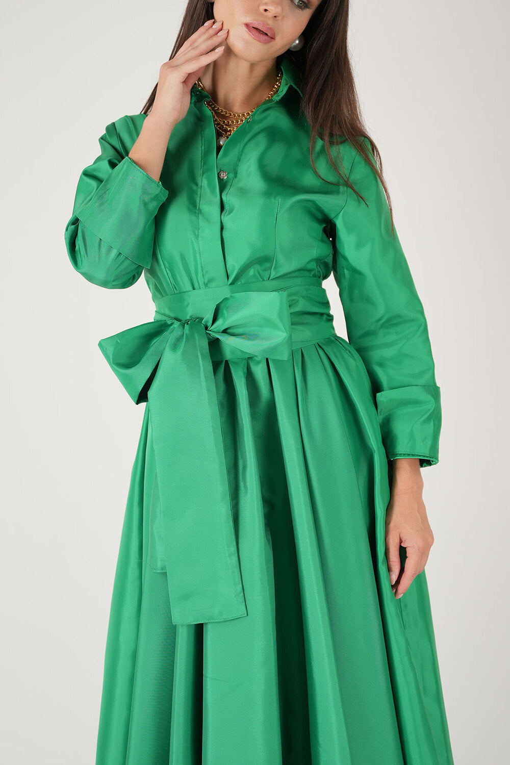 Kuşaklı Yeşil Tafta Uzun Gömlek Elbise