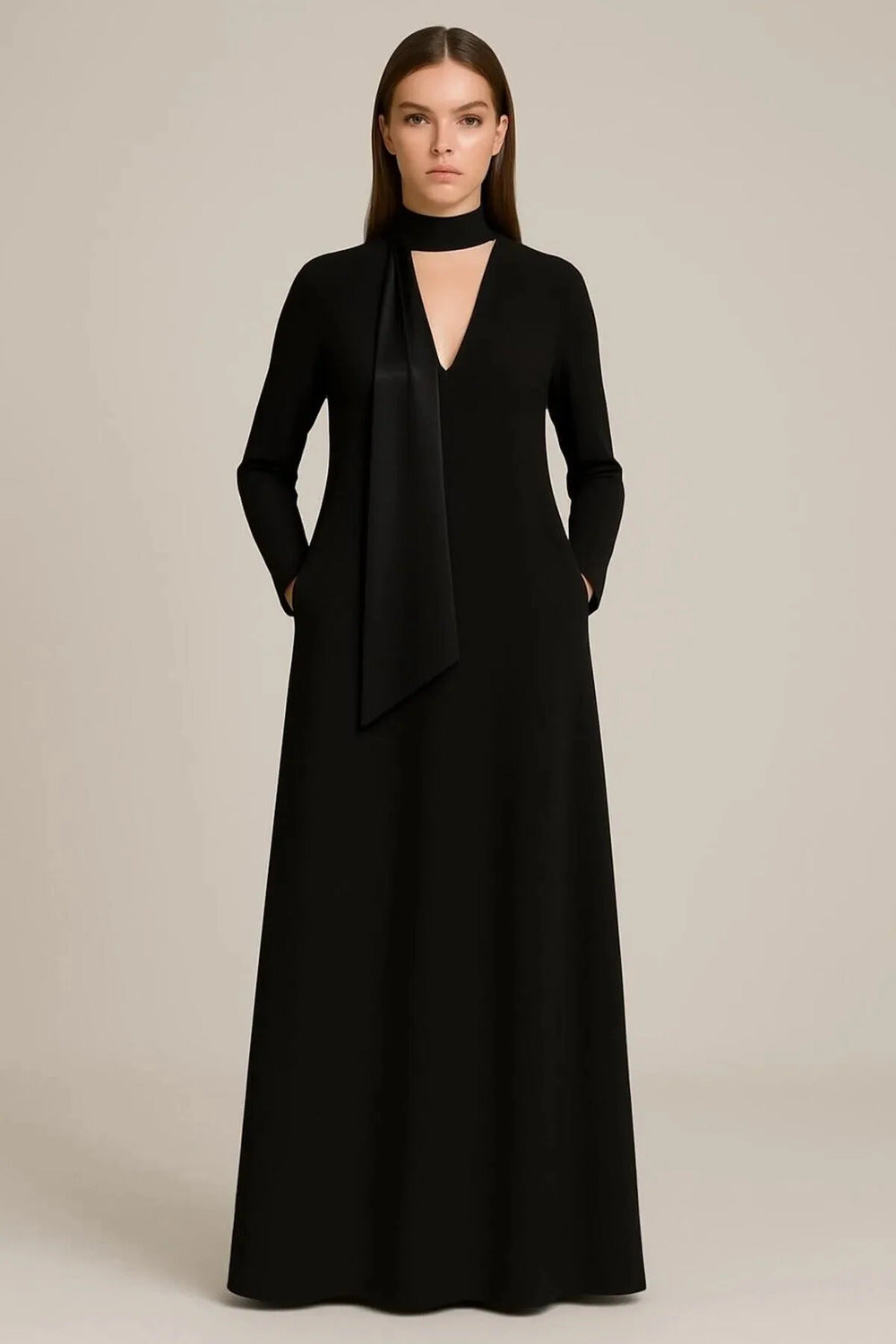 Seyyar Saten Şal Detaylı V-Yaka Maxi Şık A-Form Siyah Krep Elbise