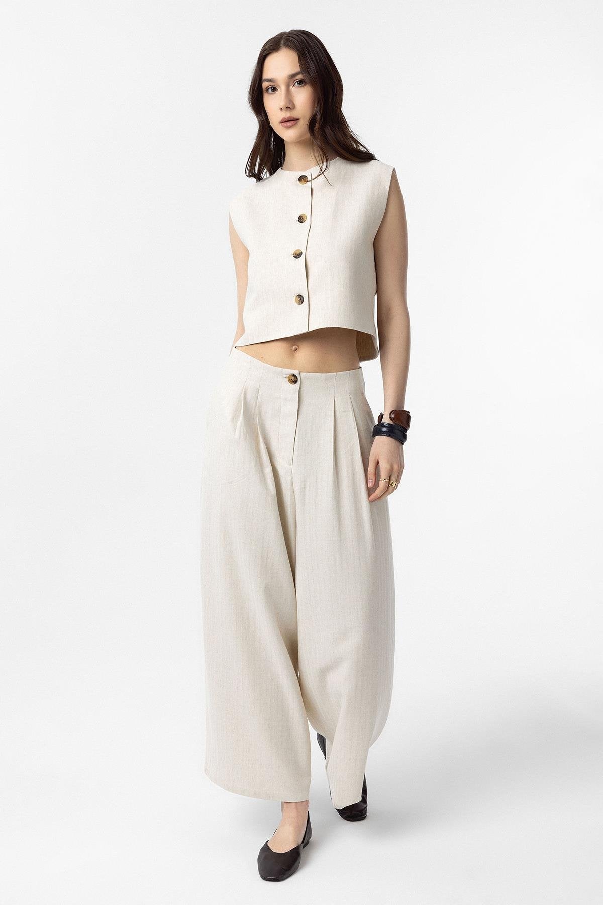 Ekru Keten Karışımlı Kadın Culotte Pantolon