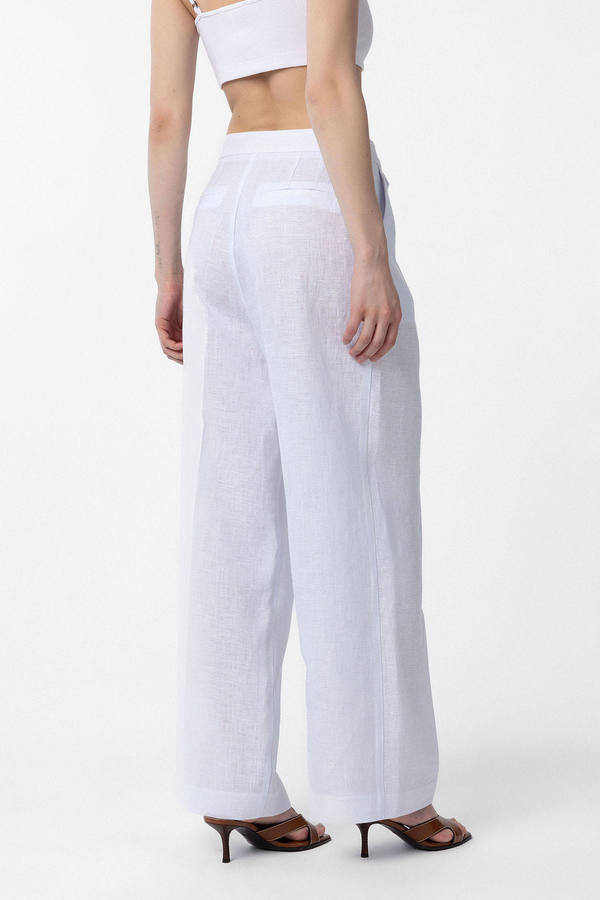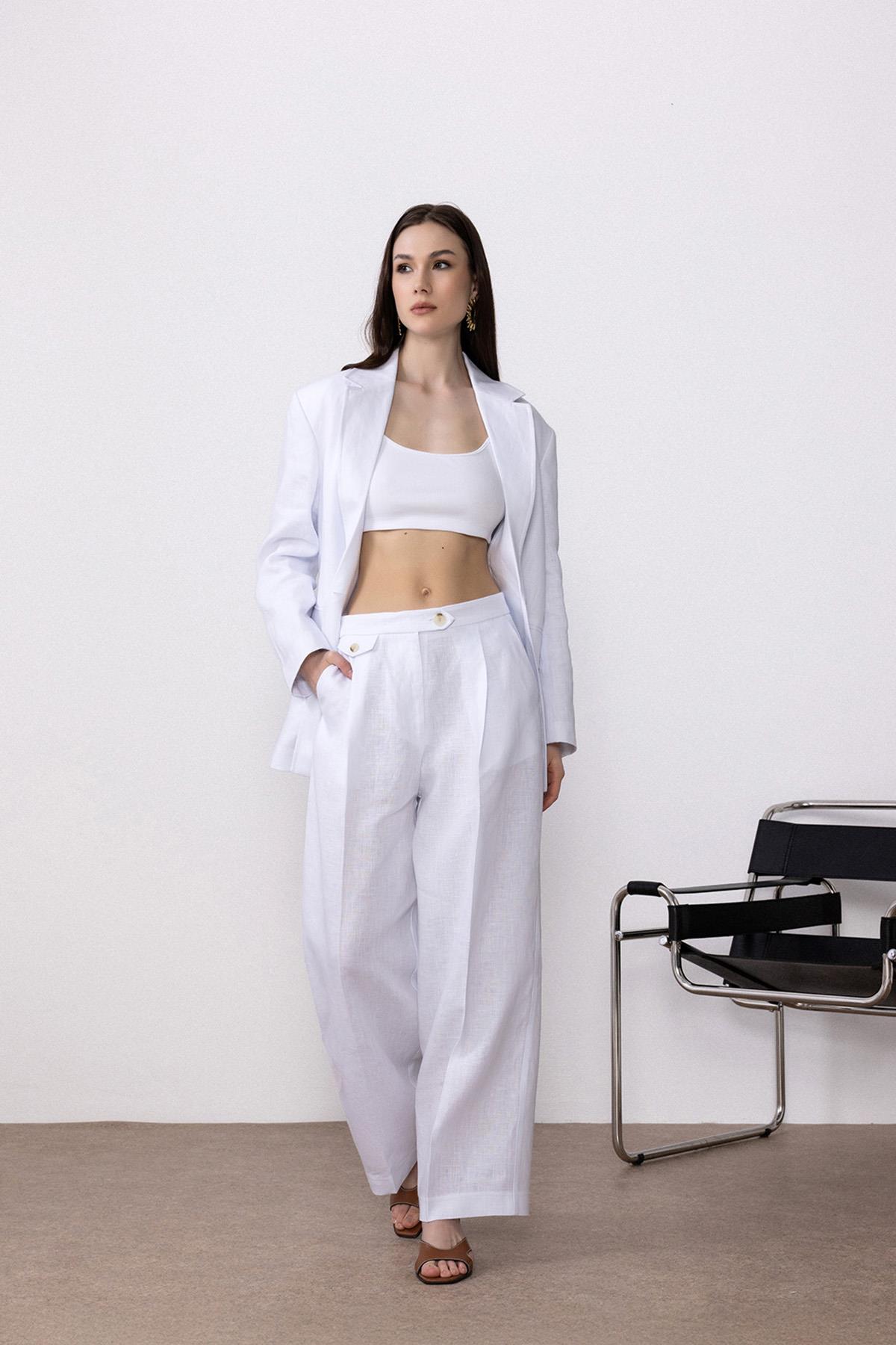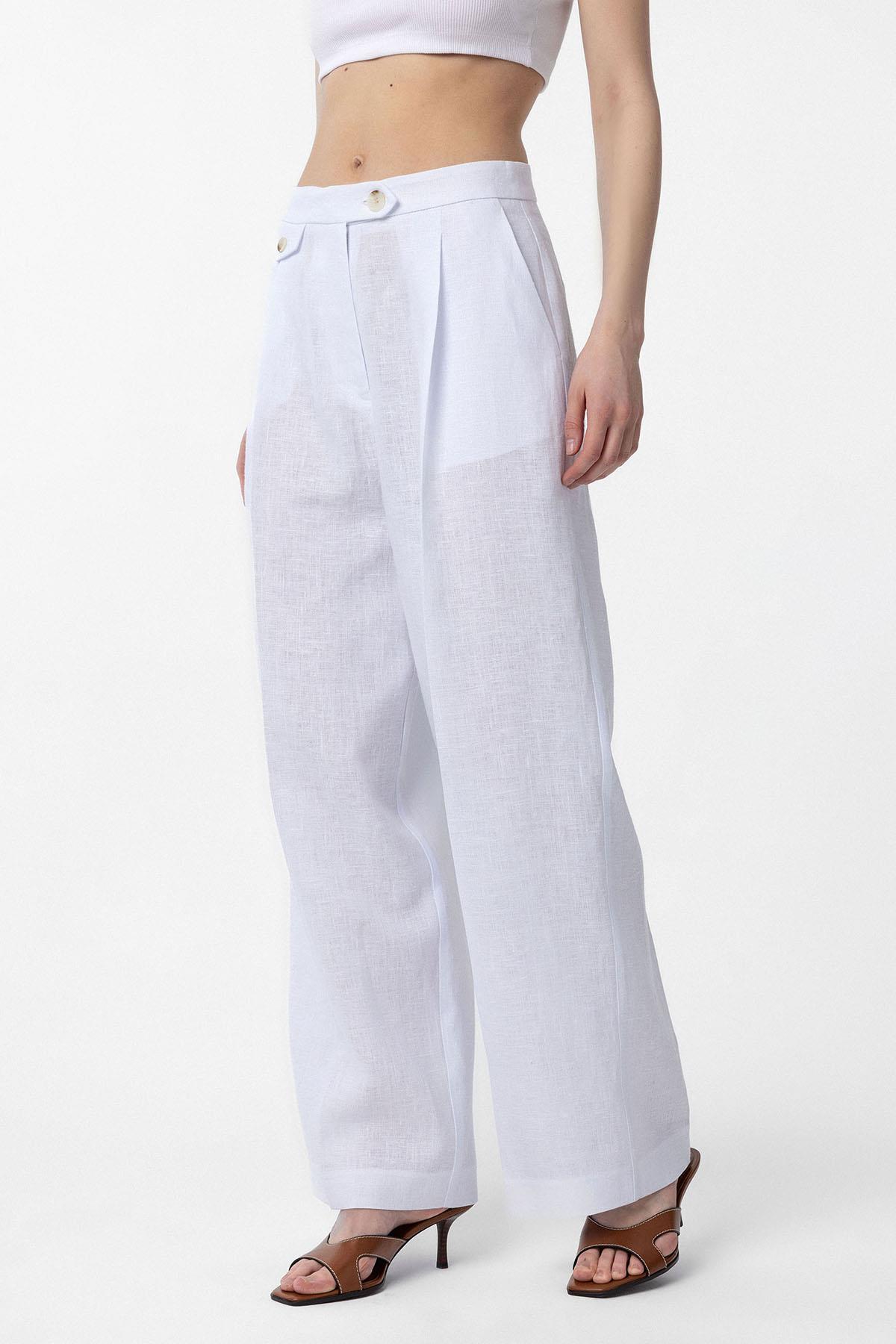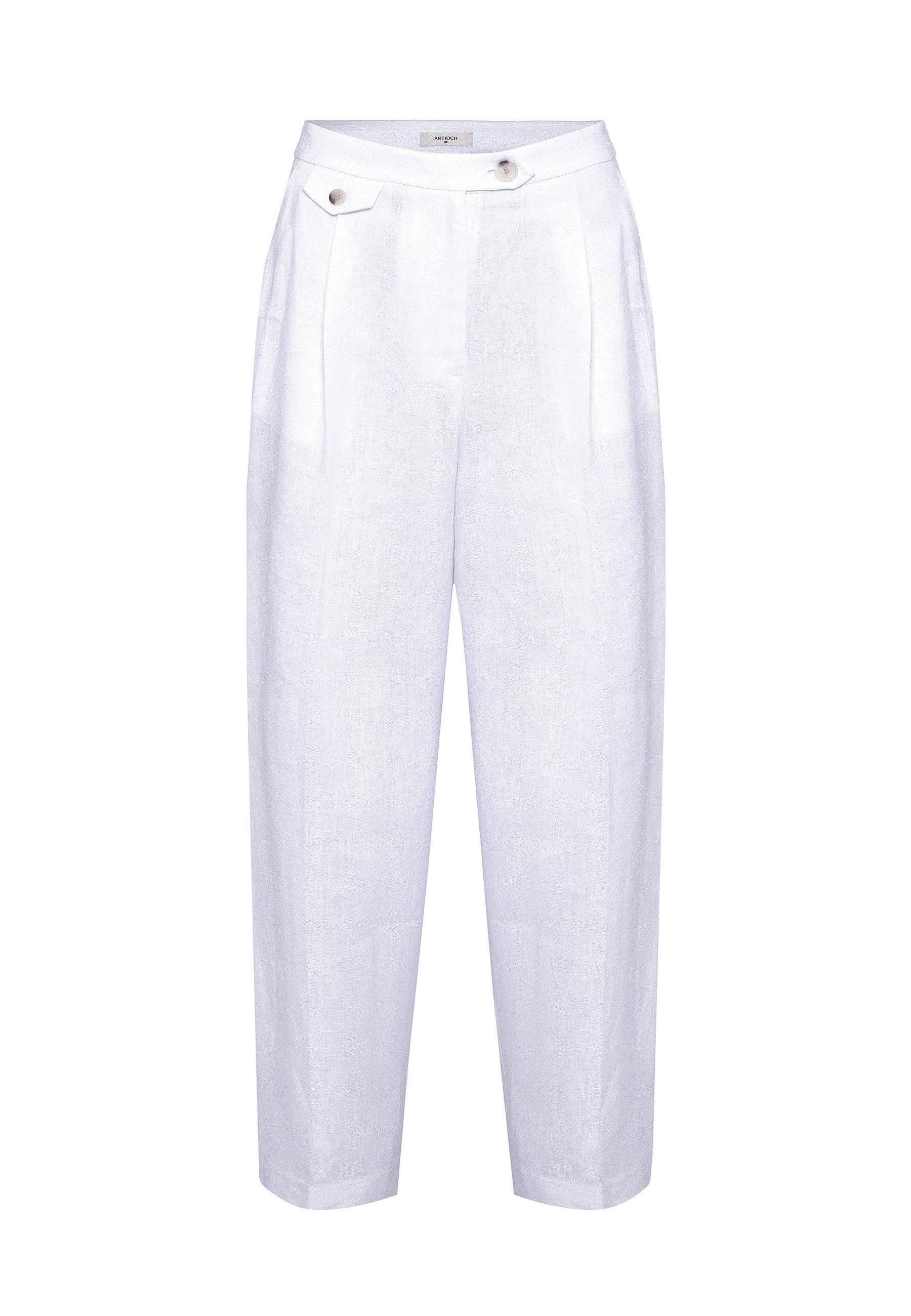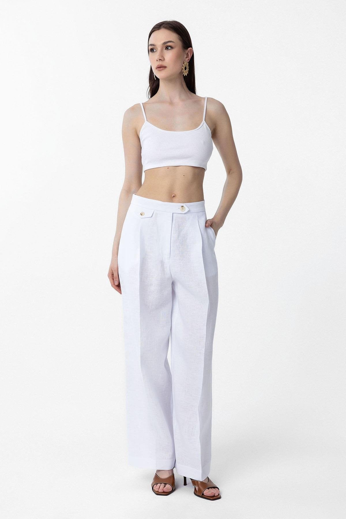 Beyaz 100% Keten Yüksek Bel Pilili Kadın Pantolon