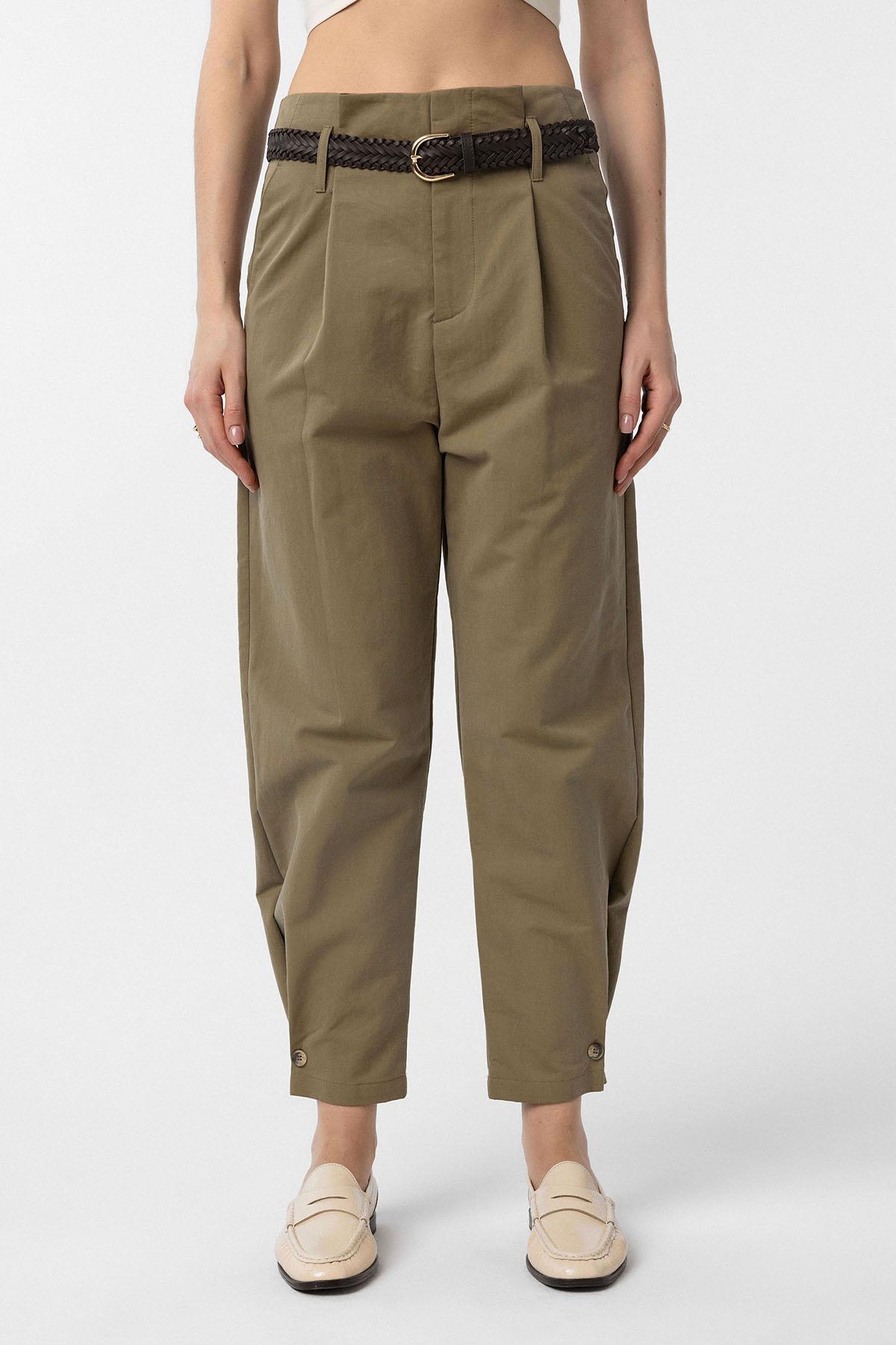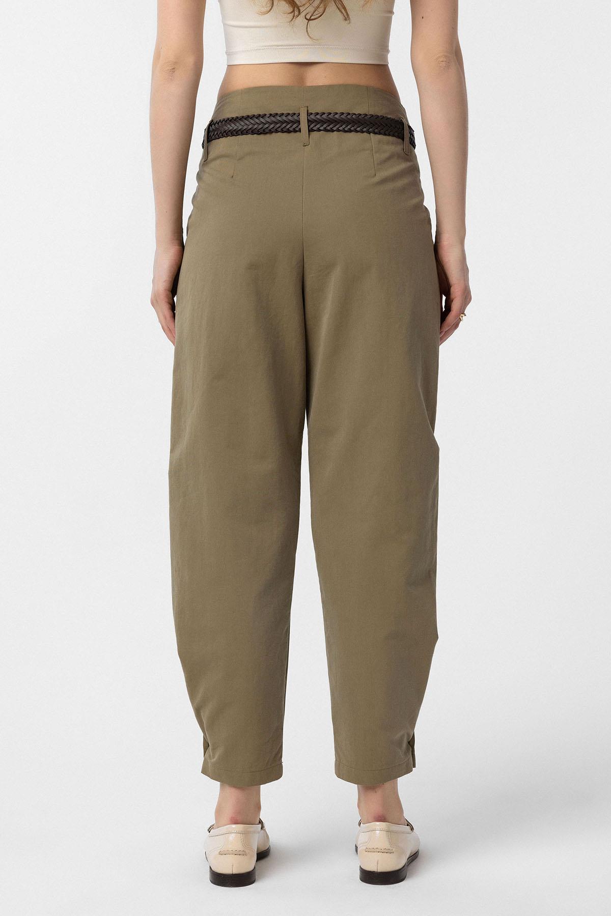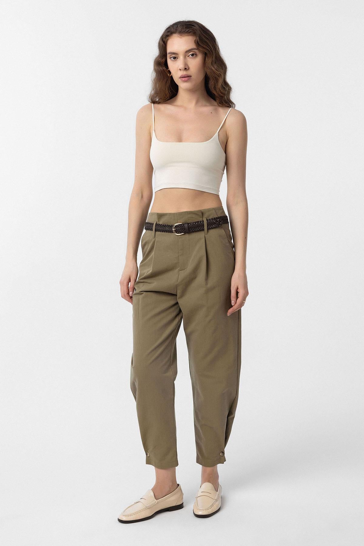 Haki Yüksek Bel Paçası Düğmeli Fit Kadın Pantolon