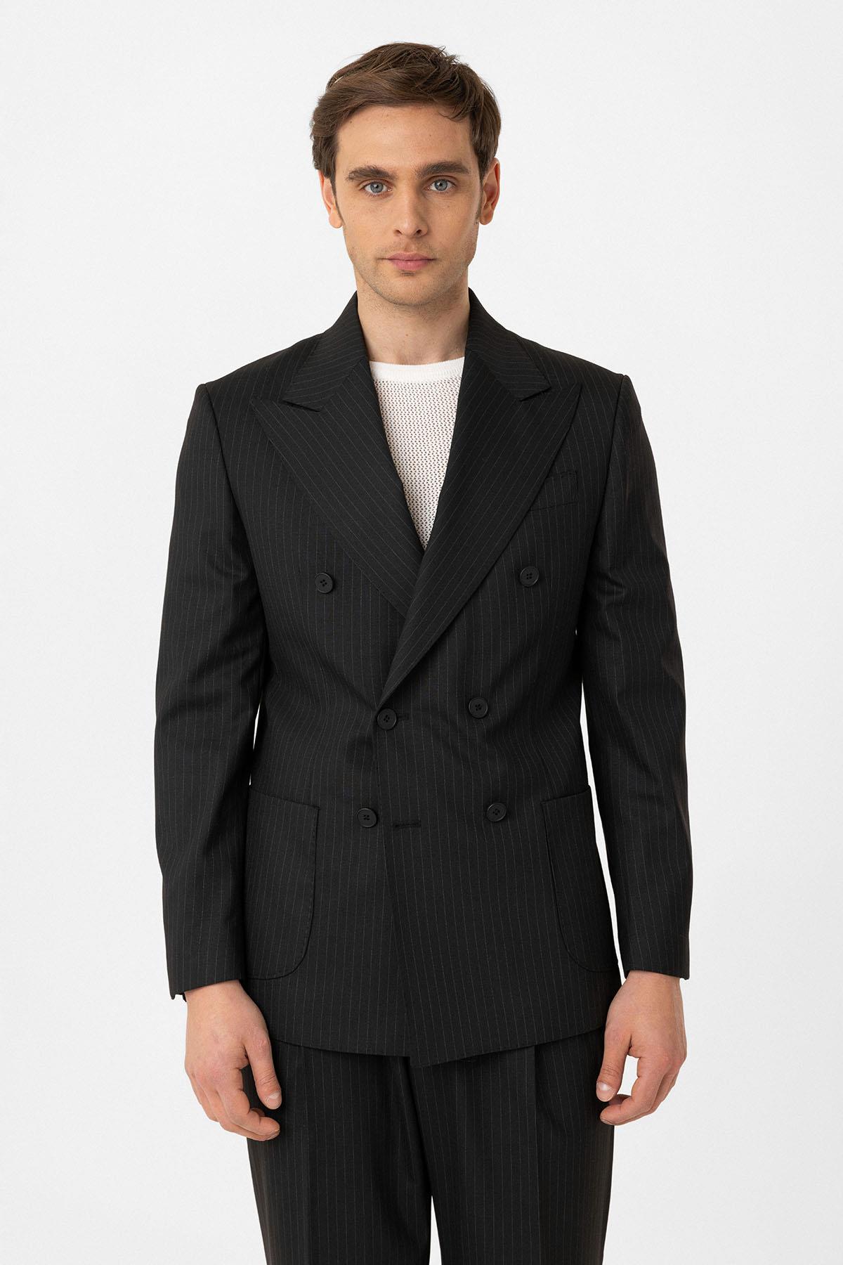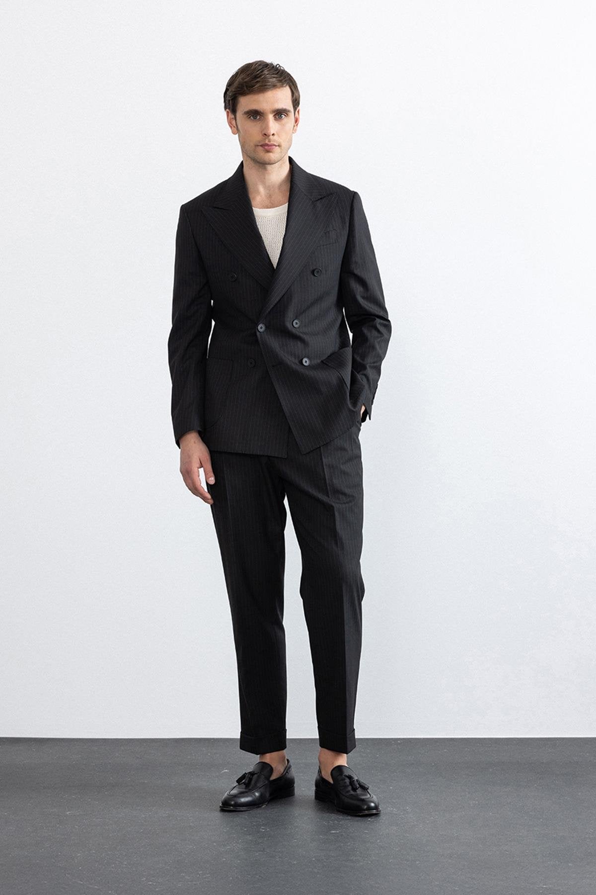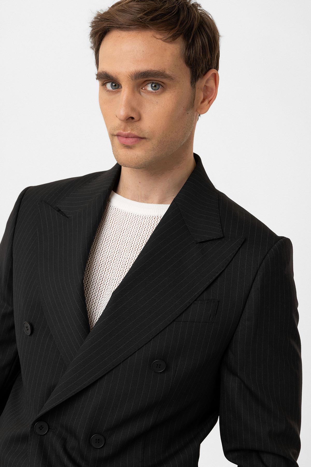 Siyah Kruvaze Kapama İTalyan Kesim Yün Karışımlı Çizgili Erkek Teknik Takım