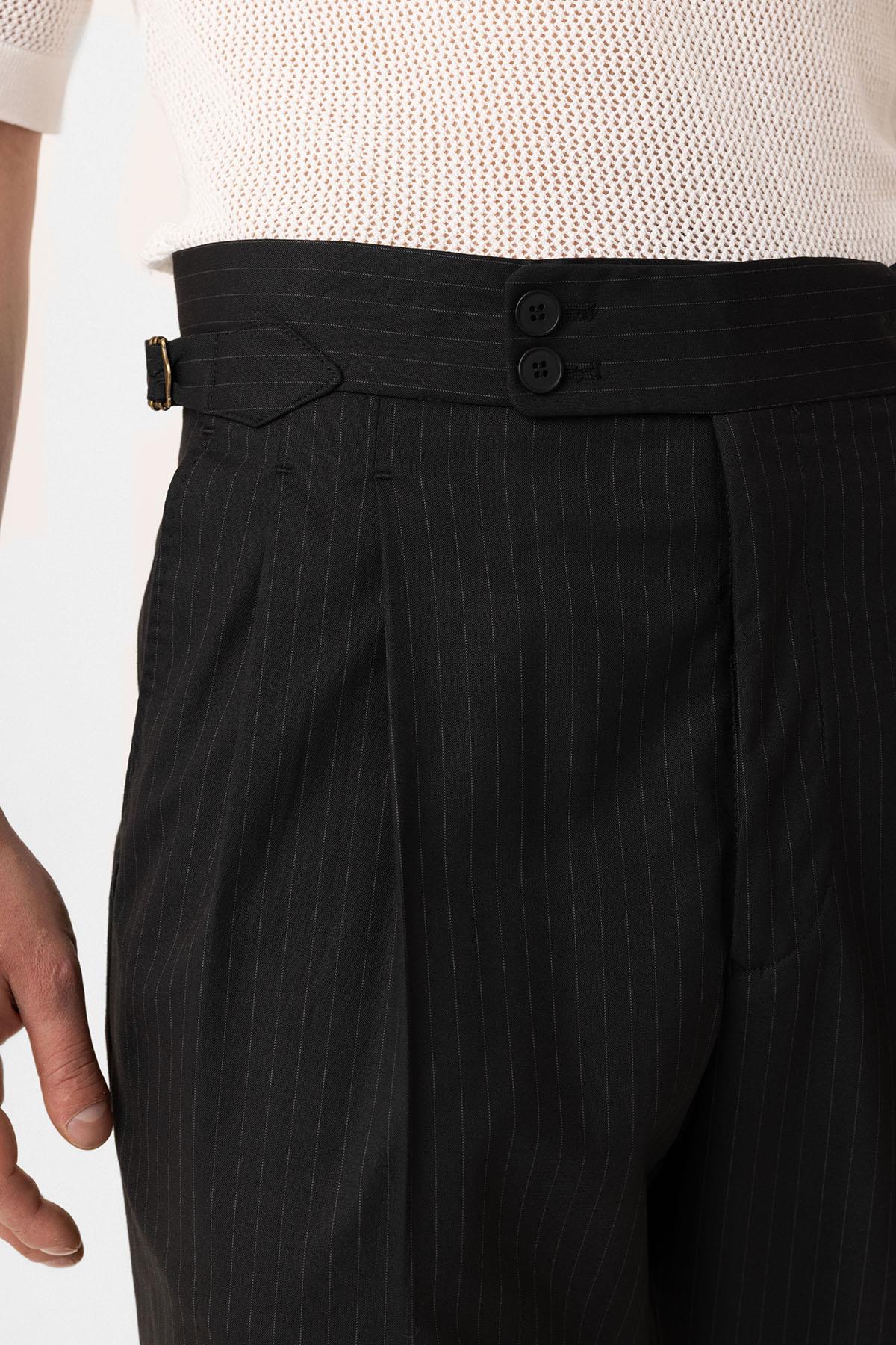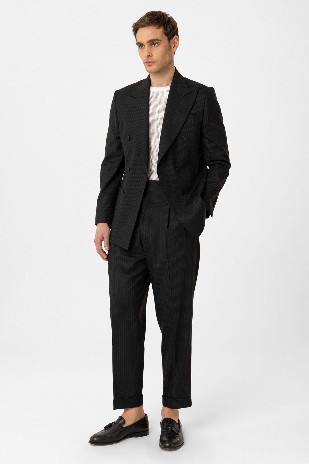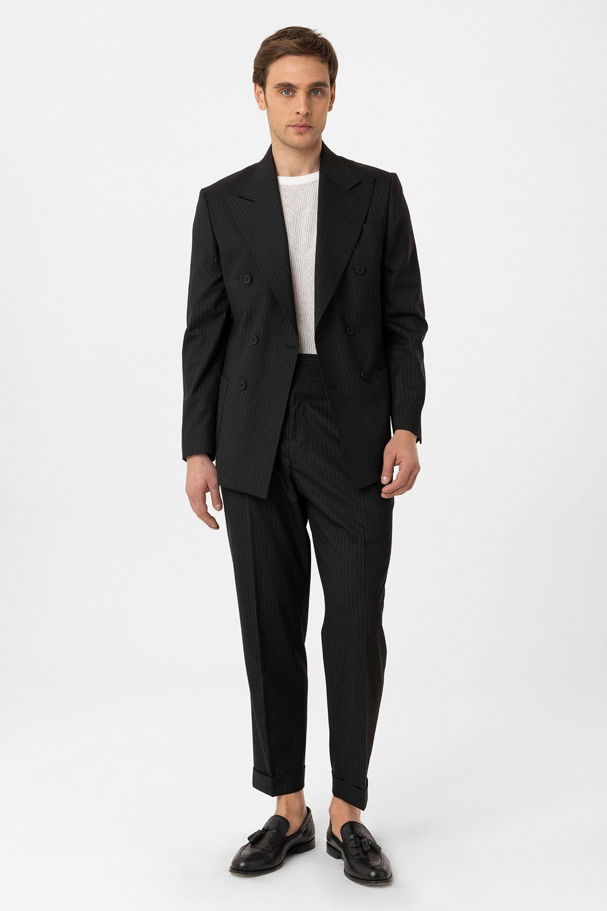 Siyah Kruvaze Kapama İTalyan Kesim Yün Karışımlı Çizgili Erkek Teknik Takım