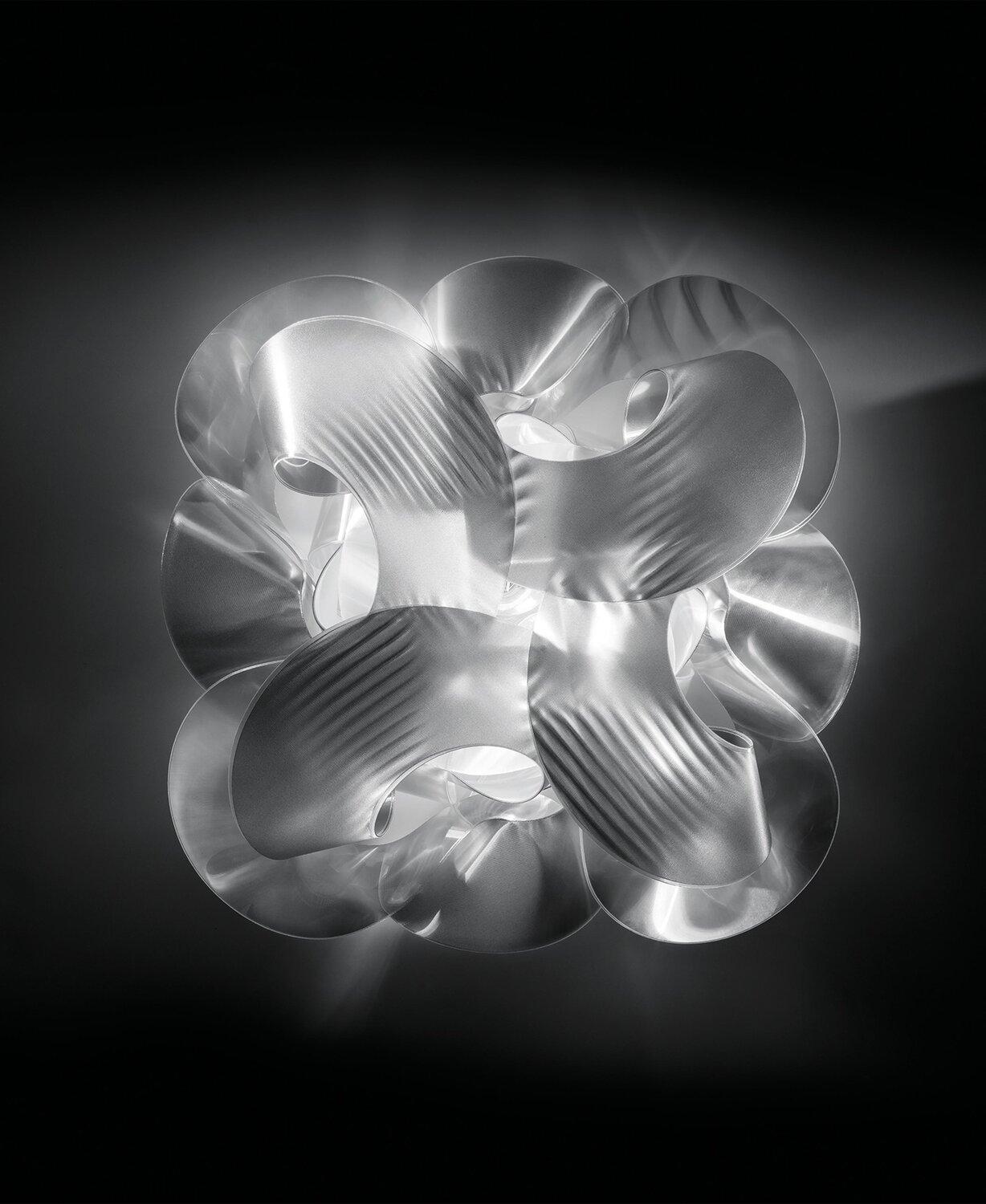 Fabula, kendi etrafına dolanmış uzun, ipeksi bir kumaş parçasını andırır. Tavan ve sarkıt için tasarlanan yeni ışıltılı (iridescent) versiyonları, 60 cm çapında, Lentiflex® malzemeden el yapımı olarak üretilmiştir ve geniş alanları aydınlatmak için ideal hale getiren 5 ışık kaynağına sahiptir. Tavan modeli ve 48 cm’lik sarkıt versiyonu, her mekâna zarif bir dokunuş katar.