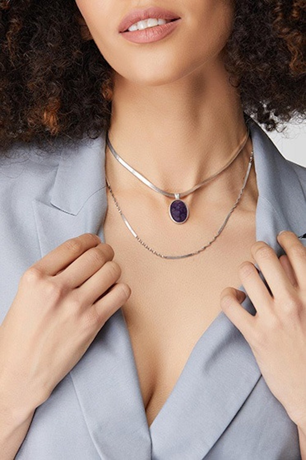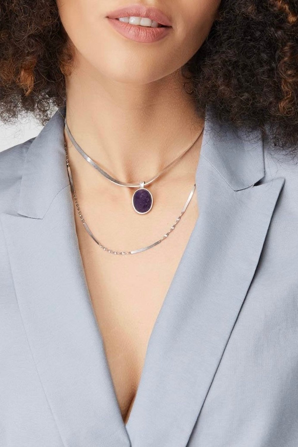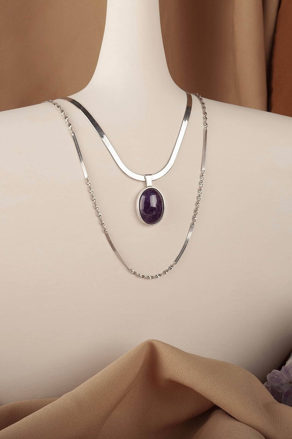 Adagio kolyemizde, farkındalığınızı artıran ametist ile manevi saflığın simgesi gümüşü ikili tasarım olarak birleştirdik. Güçlü, şık ve doğal..