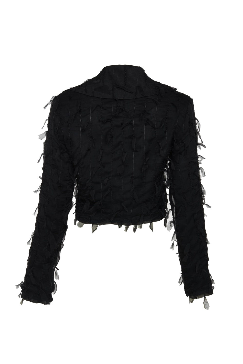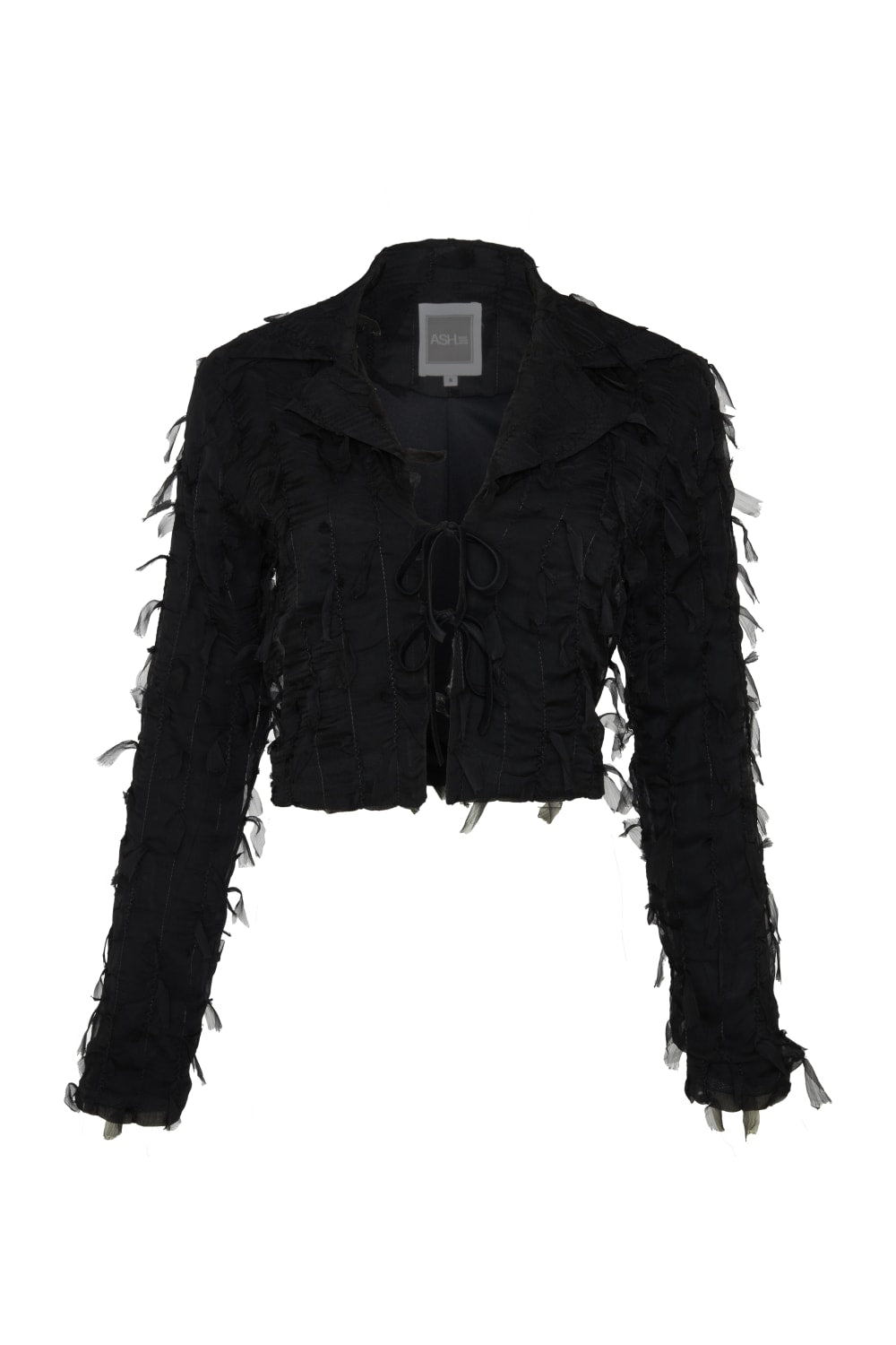 Ürün Bilgisi: Geniş yakalı, önden bağlamalı, içi jarse astarlı, tül saçaklı ceket.