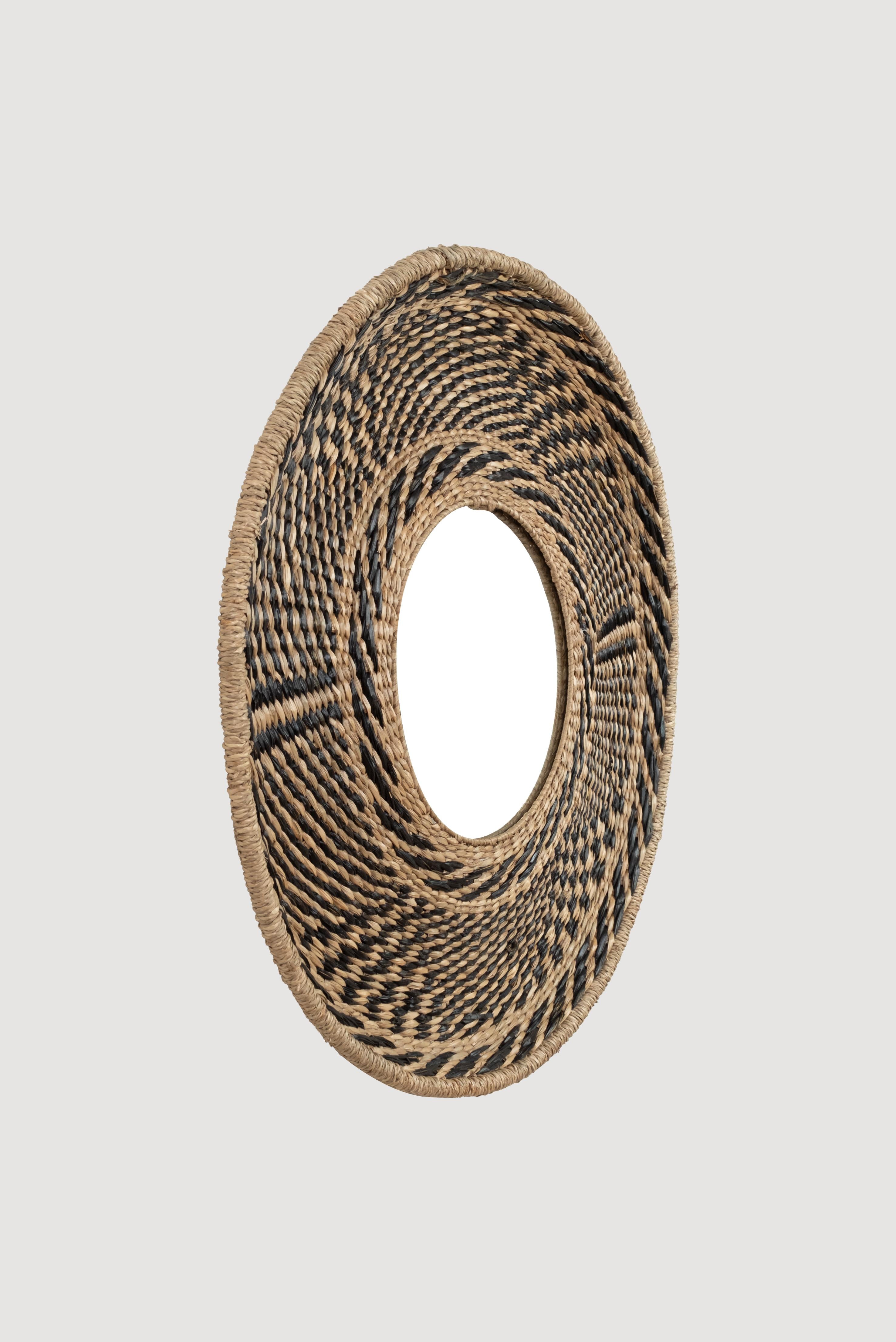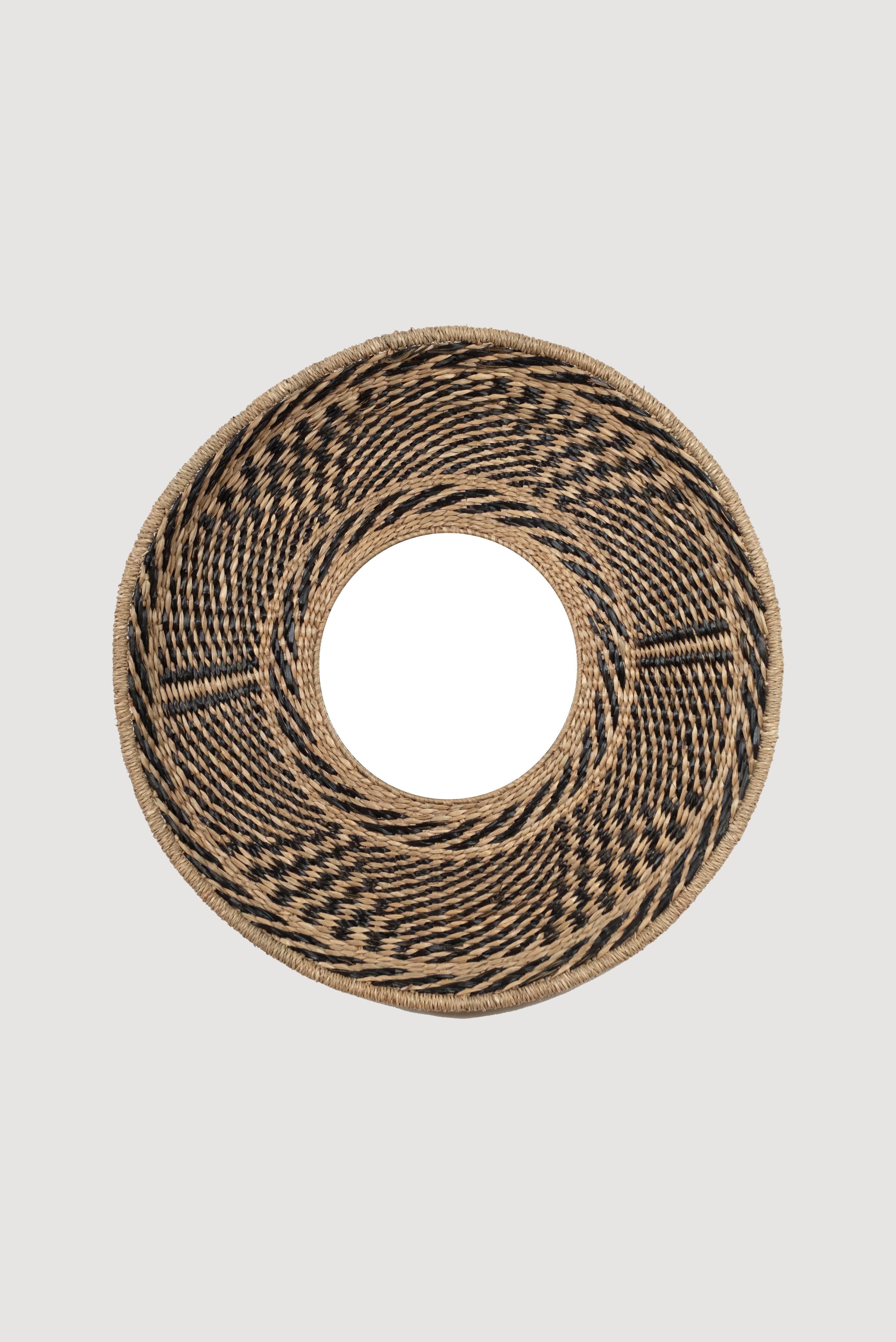 Hasır detaylarla süslenmiş, doğal ve estetik bir duvar aynası yer almaktadır. El yapımı hissi veren bu yuvarlak ayna, dekorasyonda sıcak ve samimi bir atmosfer oluşturmak isteyenler için ideal bir tercihtir. Hasır çerçevesindeki ince işçilik, aynaya bohem ve rustik bir dokunuş katarak, özellikle doğal ve sade dekorasyon stilleriyle uyum sağlar. Giriş, oturma odası veya yatak odası gibi alanlarda kullanılarak ortama ferahlık ve doğallık katan bu ayna, zarif ve şık bir dekorasyon unsuru olarak öne çıkar.