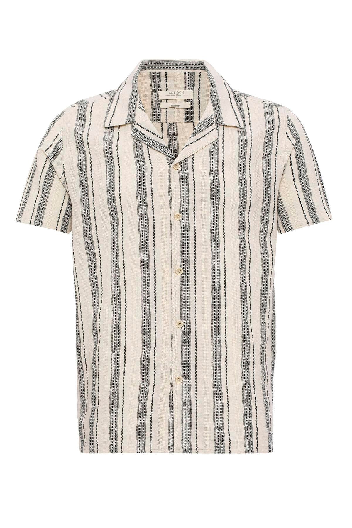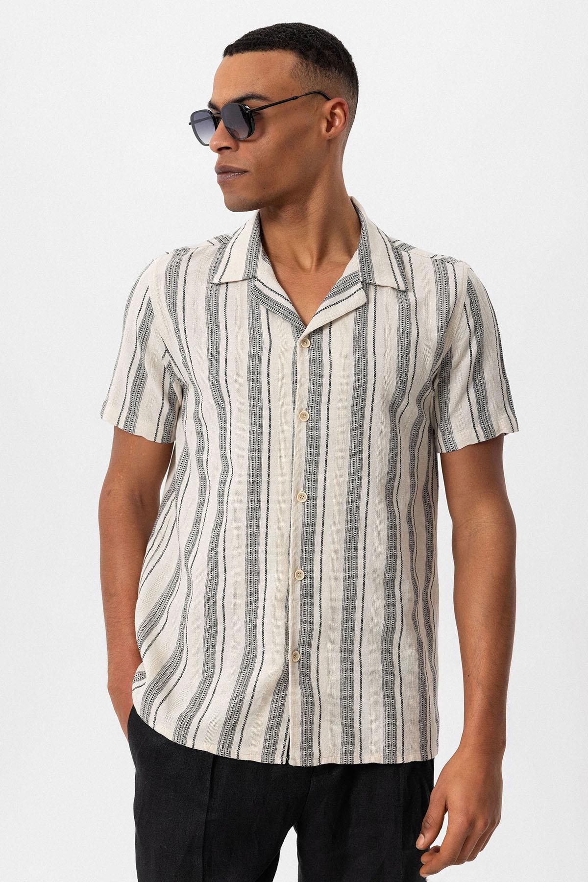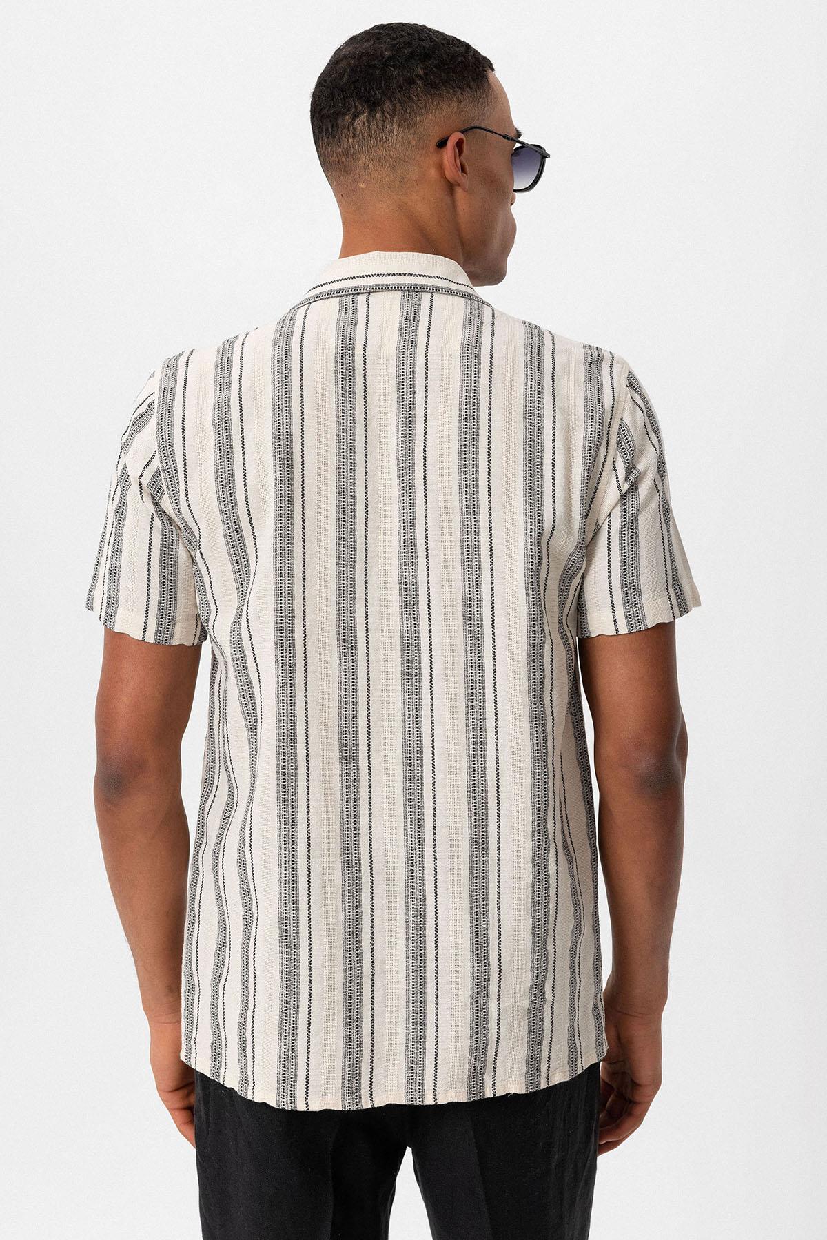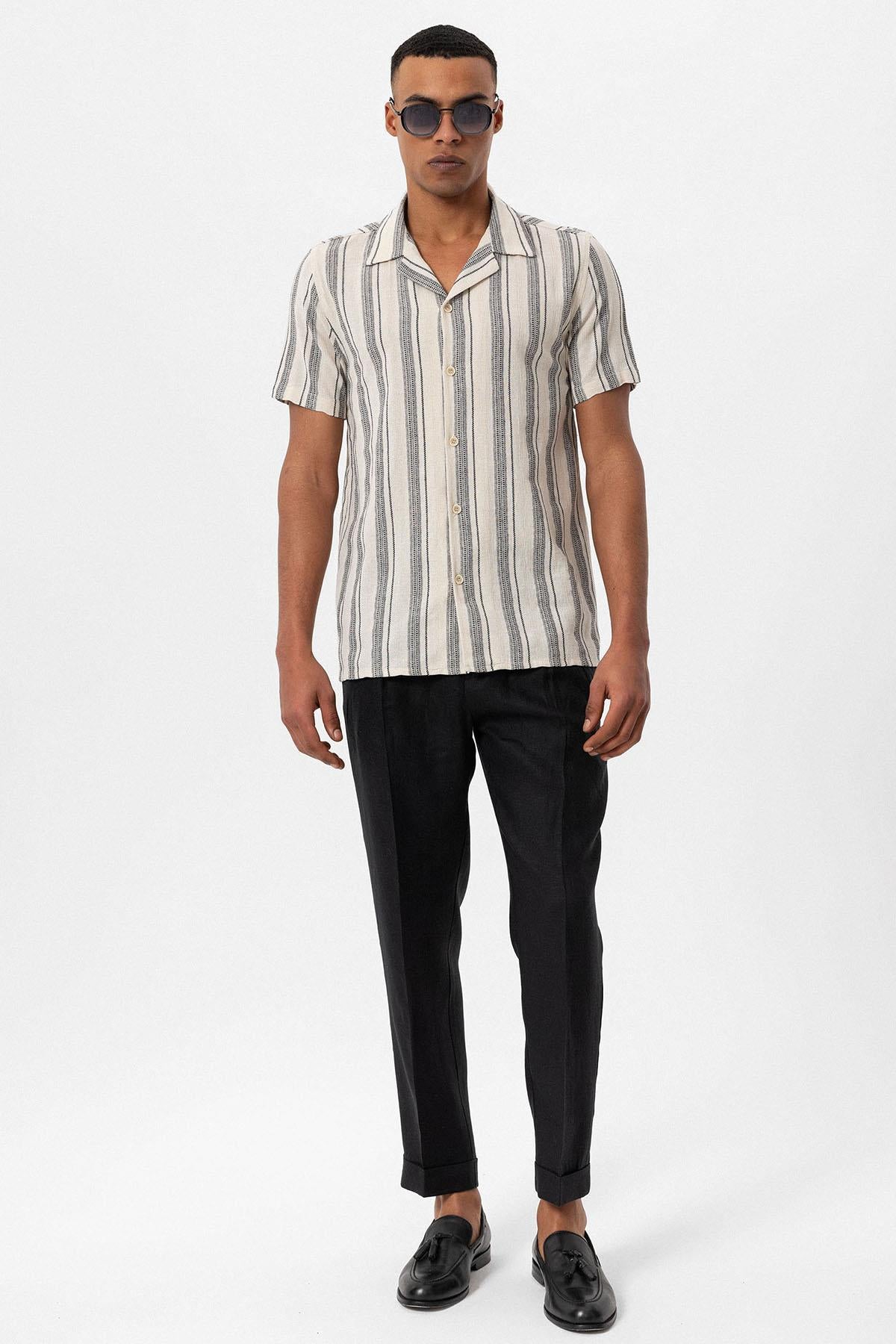 Siyah Apaş Yaka Çizgili Kısa Kollu Erkek Gömlek