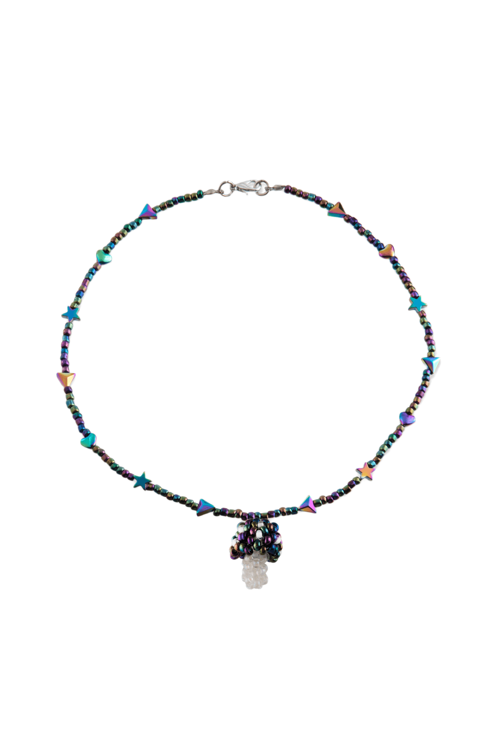 Collar con figura de mini seta mágica, decorado con piedras naturales hematites y tejido con cuentas de arena, con material intermedio de acero que no se deslustra.