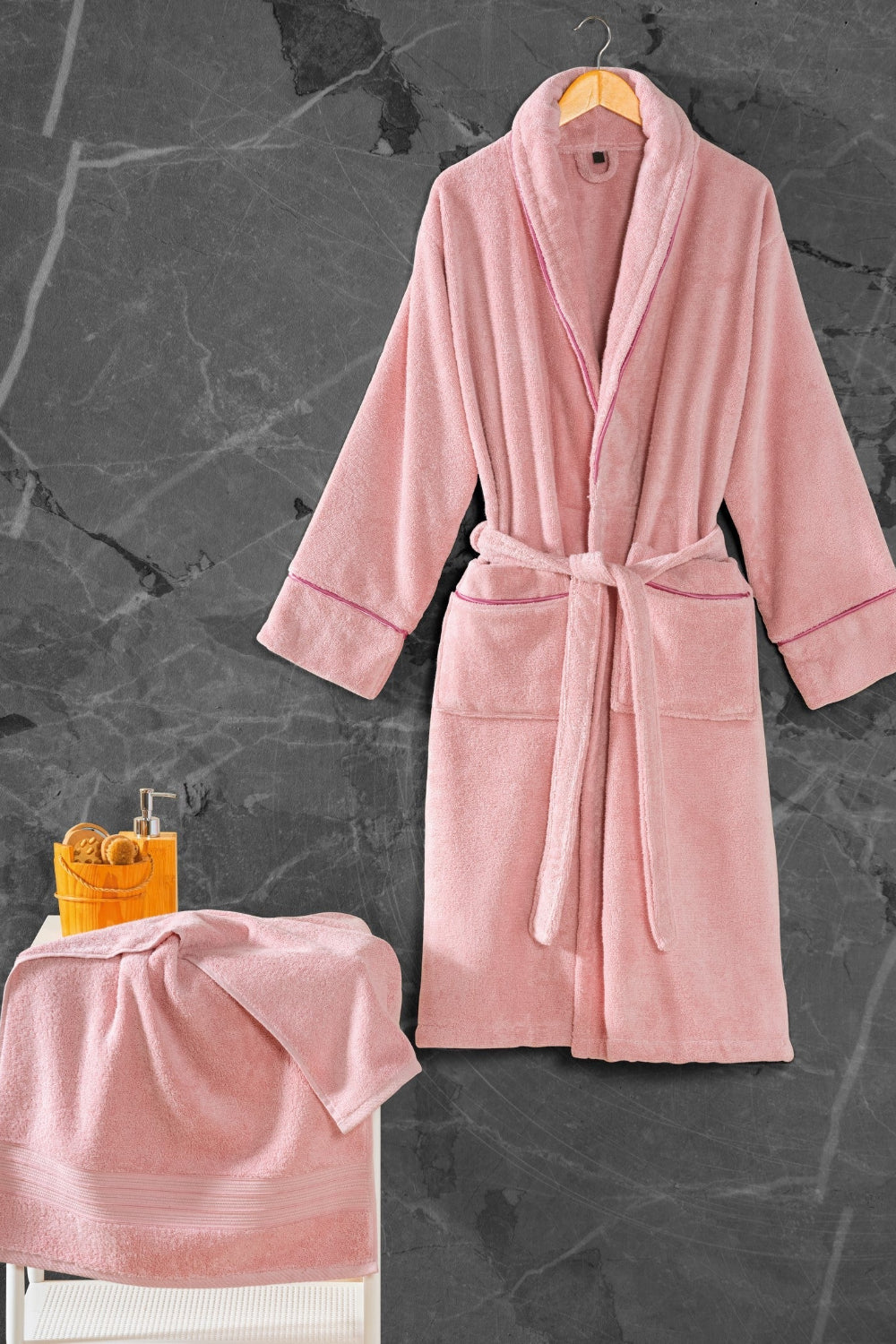 Exclusive Bornoz Seti, %100 saf pamuk dokusu ve zarif saten biyeli detayları ile banyonuzu premium bir deneyim alanına çeviriyor. 50x90 cm boyutundaki kaliteli havlusu ve şal yaka tasarımıyla hem pratik hem de göz alıcı bir kullanım sunar!