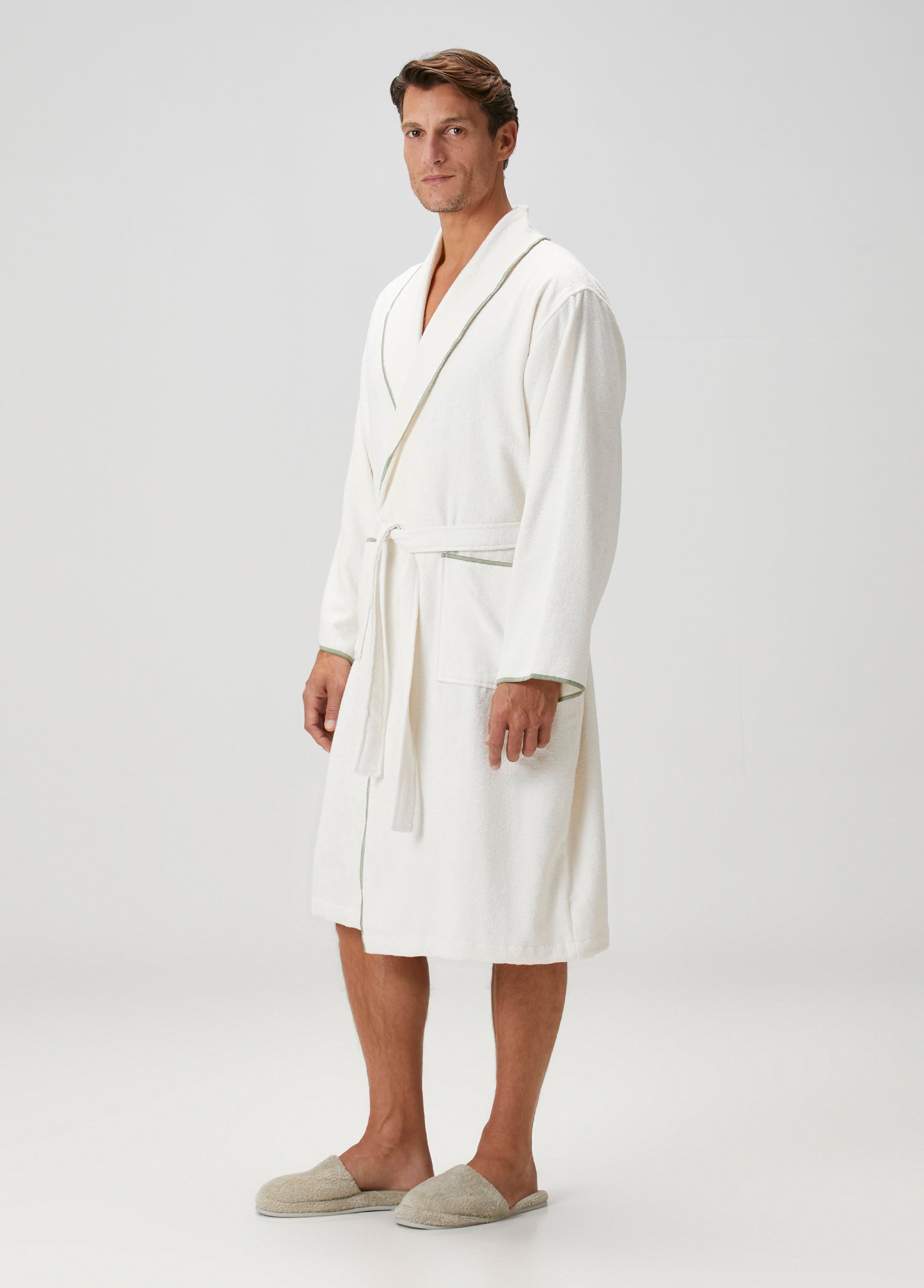 Doğal bambu dokusundan üretilen zarif bornoz, yumuşak yapısı ve yüksek emiciliğiyle gün boyu konfor sağlar. İnce çizgi şerit detaylarıyla şıklığı tamamlayan tasarım, banyodan sonra sıcak ve hafif bir dokunuş hissi sunar.
