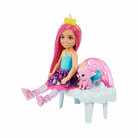 Barbie Dreamtopia Chelsea Oyun Alanı her şey mümkün! Chelsea bebeğin üzerinde yıldız desenli parlak renkli bir eteği, tek boynuzlu tacı ve bir kuyruğu vardır.Çeşit çeşit hikayeye ilham veren üç farklı oyun alanı bulunur: salıncaklı bir çardak, bulut şeklinde ışıltılı bir bank ve kendine ait çok katlı kulesiyle dünya tatlısı 'tek boynuzlu kedi'. Bebek tek başına ayakta duramaz. Renkler ve süslemeler çeşitlilik gösterebilir. Chelsea bebeği, masalsı aksesuarları ve ilginç kedisi olan bu şirin Barbie® setiyle çocuklar bulutların üzerinde oyunlar oynayabilir. Chelsea bebek pembe masalsı saçları, tek boynuzlu tacı ve çıkarılabilen kuyruğuyla büyülü bir enerji yayıyor. Ayrıca camgöbeği renginde bir korse, yıldızlı mor bir etek, pastel tonlu bir tayt ve ipli sandaletler giyiyor. Rüya gibi çardakta sandalyede sallanıp bulutların üzerinde süzülün veya bulut şeklindeki bankta oturup kayan yıldızlara karşı dilek tutun. Çocuklar kedi yavrusuyla ilgilenerek bakım oyunu oynayabilir. Pembe kürkü ve tek boynuzuyla bu fantastik kediciğin pek çok yaratıcı hikayeye ilham olacağından emin olabilirsiniz. Kediciğin bulutlardan esinlenilerek tasarlanmış oyun kulesi iki katlıdır ve ucunda sallanan yıldız olan bir hilal bulunur. Çeşit çeşit yaratıcı hikayeyi teşvik eden bu Barbie oyun seti 3 yaş ve üzeri çocuklar için ideal bir hediyedir. Kutu ölçüsü: 24 x 20 x 9 cm