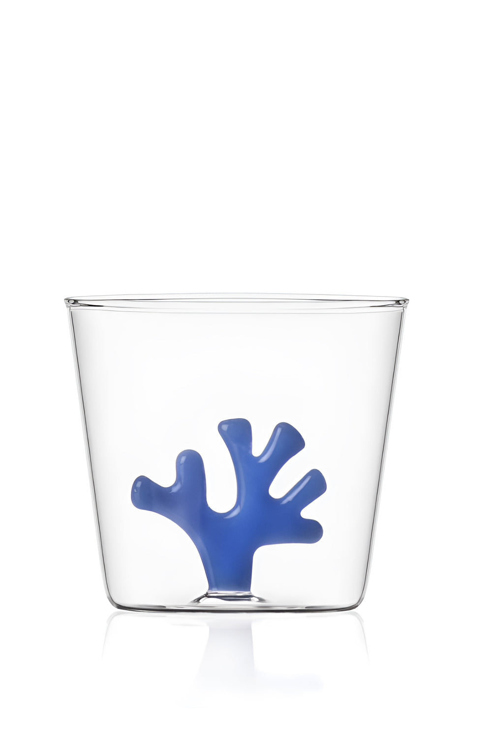 Coral Reef koleksiyonundan mavi renkli mercan figürlü cam su bardağı.