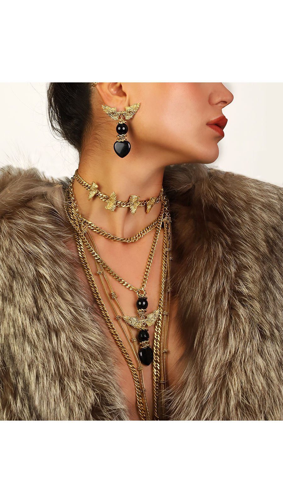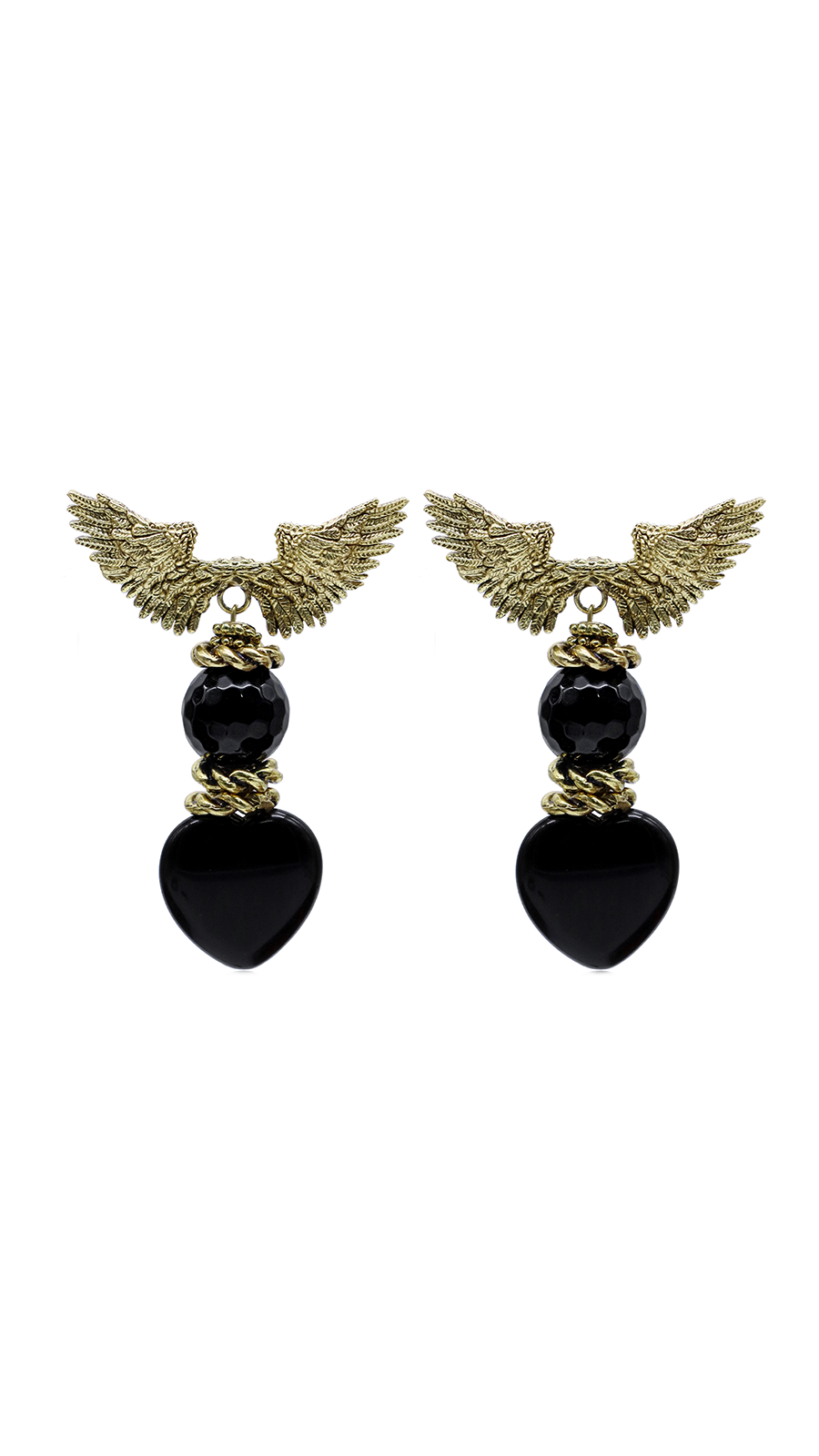 Amore Forte Sallantılı Küpe, cesaretin ve aşkın güçlü bir sembolü olarak öne çıkıyor. 22 ayar altın kaplama pirinç melek kanatları, özgürlük ve zarafetin kanat çırpışını temsil ederken, onyx doğal taşı derinlik ve gizem katıyor. Altın burgu halkaların zarif geçişiyle, küpenin merkezinde yer alan siyah kalp sembolü, güçlü bir aşkın ve tutkunun ifadesi olarak öne çıkıyor. Amore Forte Sallantılı Küpe, hem asi hem de romantik bir duruş sergilerken, her hareketinizde göz alıcı bir zarafet sunar.