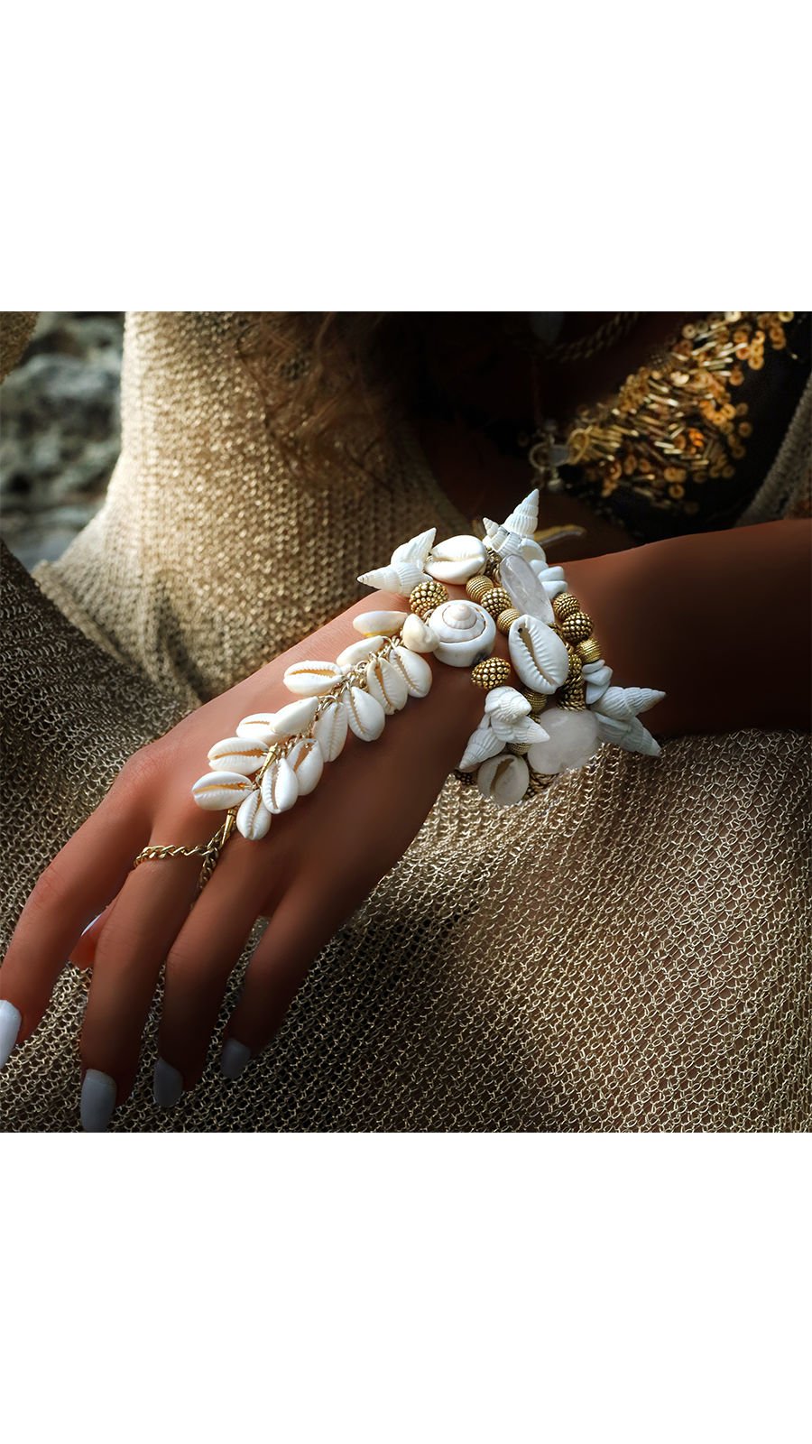 Bu özel FERIADO ŞAHMERAN BİLEKLİK tasarımı, bilekten başlayıp orta parmağa kadar inen zarif bir zincirle tamamlanıyor. Zincirin üzerine yerleştirilen daha küçük deniz kabukları, her adımda okyanusun esintisini ve denizin serinliğini hissettiriyor. Zincir, parmağınıza ince bir halka şeklinde geçerek modern bir görünüm sunuyor. El yapımı olan bu FERIADO ŞAHMERAN BİLEKLİK, ustalıkla işlenmiş ve her detayında zarafet barındıran bir parça.