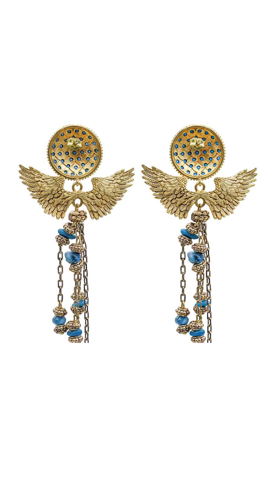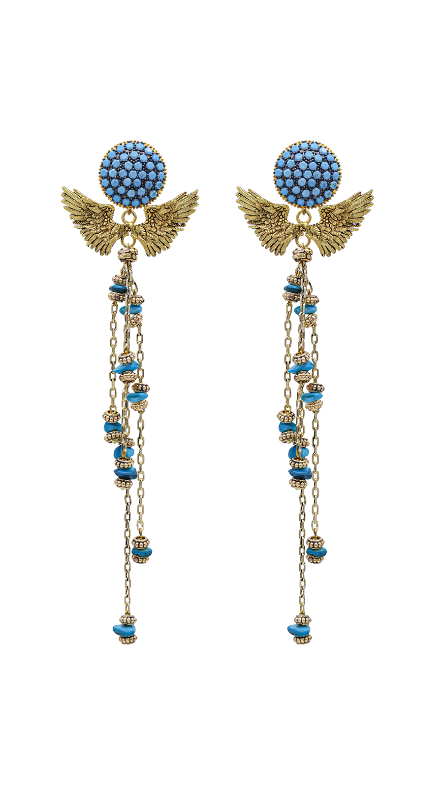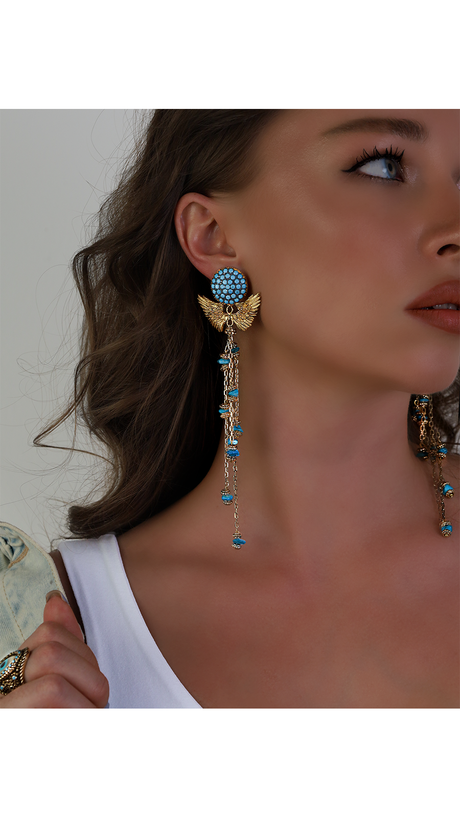 GAIA Sallantılı Küpeler, mitolojik hikayelerden fırlamış gibi duran, efsanevi bir güzelliğe sahiptir. Gökyüzünü andıran mavi taşlarla bezenmiş yuvarlak tepelikler, bu benzersiz tasarımın sadece başlangıcıdır. Tepeliklerden dökülen altın kaplamalı melek kanatları, özgürlüğün ve zarafetin simgesi olarak parlar. Kanatların altından sarkan ince pirinç zincirlerdeki farklı boyutlardaki mavi kırık taşlar, doğanın sınırsız güzelliklerini üzerinizde taşımanıza olanak tanır. Her biri birbirinden farklı uzunluktaki bu zincirler, GAIA Sallantılı Küpe'nin her hareketinde dans eder gibi bir görünüm sergiler. GAIA Sallantılı Küpeler, doğanın ve gökyüzünün sınırsızlık hissini şehir hayatının ortasına taşır. Her bir taşın kırık kenarları, kusursuzluğun sadece doğanın elinden çıkabileceğinin altını çizer. Bu küpeler, doğanın ve göklerin büyüsünü stilinizle buluşturmanın en etkileyici yoludur.