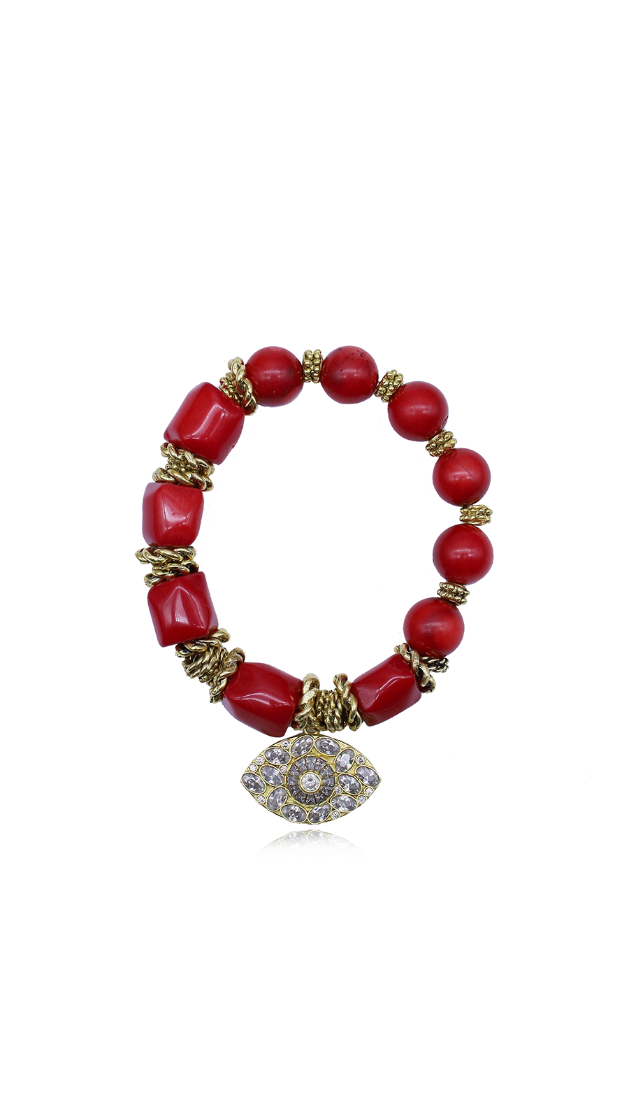 LUCEROSSA DOĞAL TAŞ BİLEKLİK, enerjisiyle ilk bakışta etkileyen, dikkat çekici bir bileklik. Bordo mercan taşlarının güçlü ve canlı tonları, 22 ayar altın kaplama burgularla zenginleşiyor. Merkezde yer alan kristal taşlı göz charm, bilekliğe modern bir dokunuş ve odak kazandırıyor.