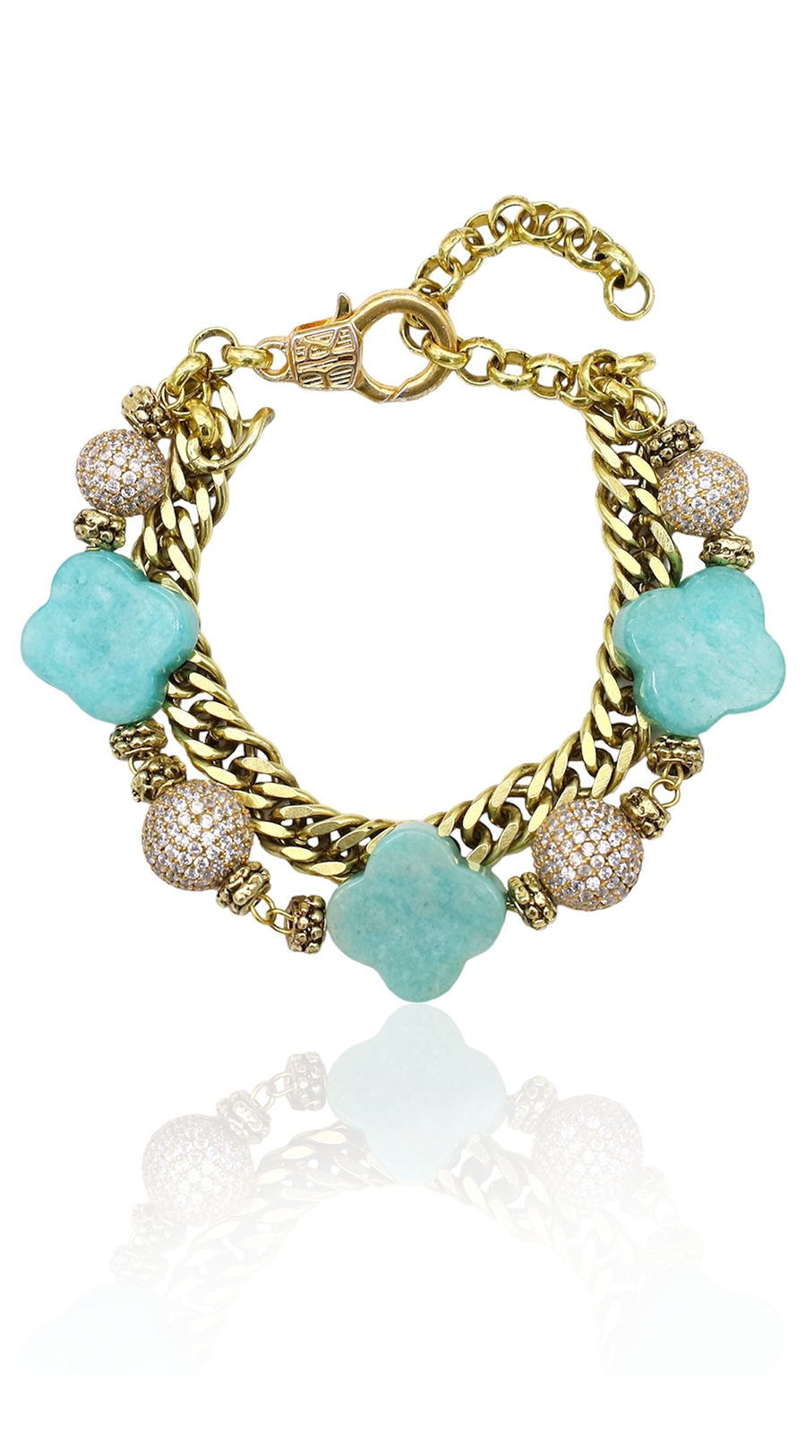 Işıltılı ve sofistike bir tarz arayanlar için tasarlanmış MILAGRO Altın Kaplama Bileklik ile tanışın. Bu benzersiz bileklik, hem zarafeti hem de modernliği bir araya getiriyor. 22 ayar altın kaplama pirinç zincir, bileğinize zarif bir dokunuş katarken, detaylarıyla göz kamaştırıyor. MILAGRO Altın Kaplama Bileklik, iki sıra halinde tasarlanmıştır. İlk sıra, 22 ayar altın kaplama pirinç zincirden oluşur ve klasik şıklığı simgeler. İkinci sıra ise, zarif yonca şeklinde amazonit taşları, küçük ve büyük markazit toplar ve 22 ayar altın kaplama ara materyallerle süslenmiştir. Bu detaylar, bilekliğe eşsiz bir derinlik ve zenginlik katmaktadır. MILAGRO Altın Kaplama Bileklik tasarımındaki yonca şeklindeki amazonit taşları, doğanın huzurunu bileğinize taşırken, markazit toplar ile altın kaplama ara materyaller bilekliğinize ışıltı katıyor.