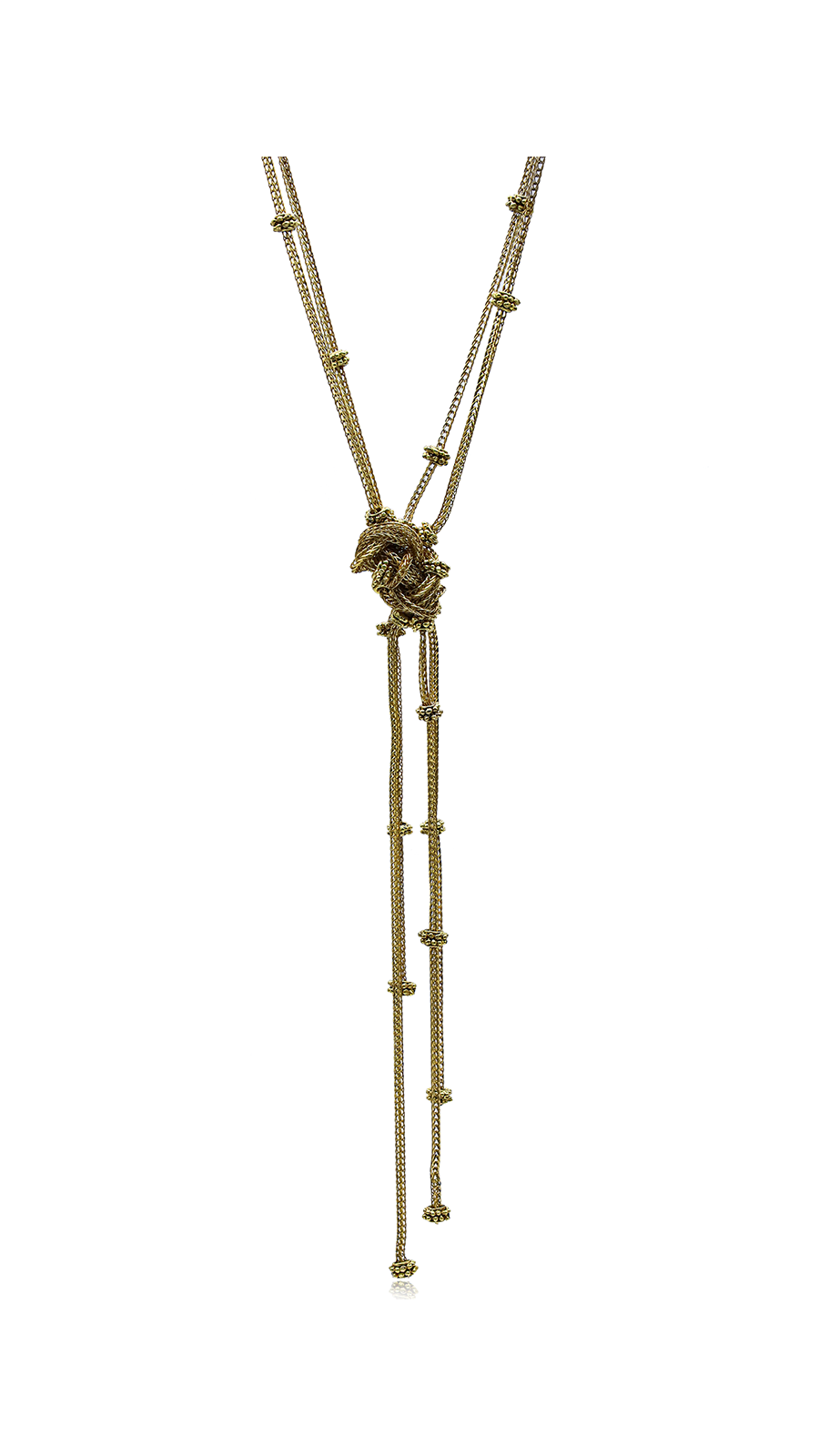 Düğümden aşağı doğru sarkan zincirler, kolyeye hem dinamik bir dokunuş hem de zarif bir akış kazandırıyor. PEITHO, zamansız şıklığı modern detaylarla birleştiren kadınlar için tasarlandı.