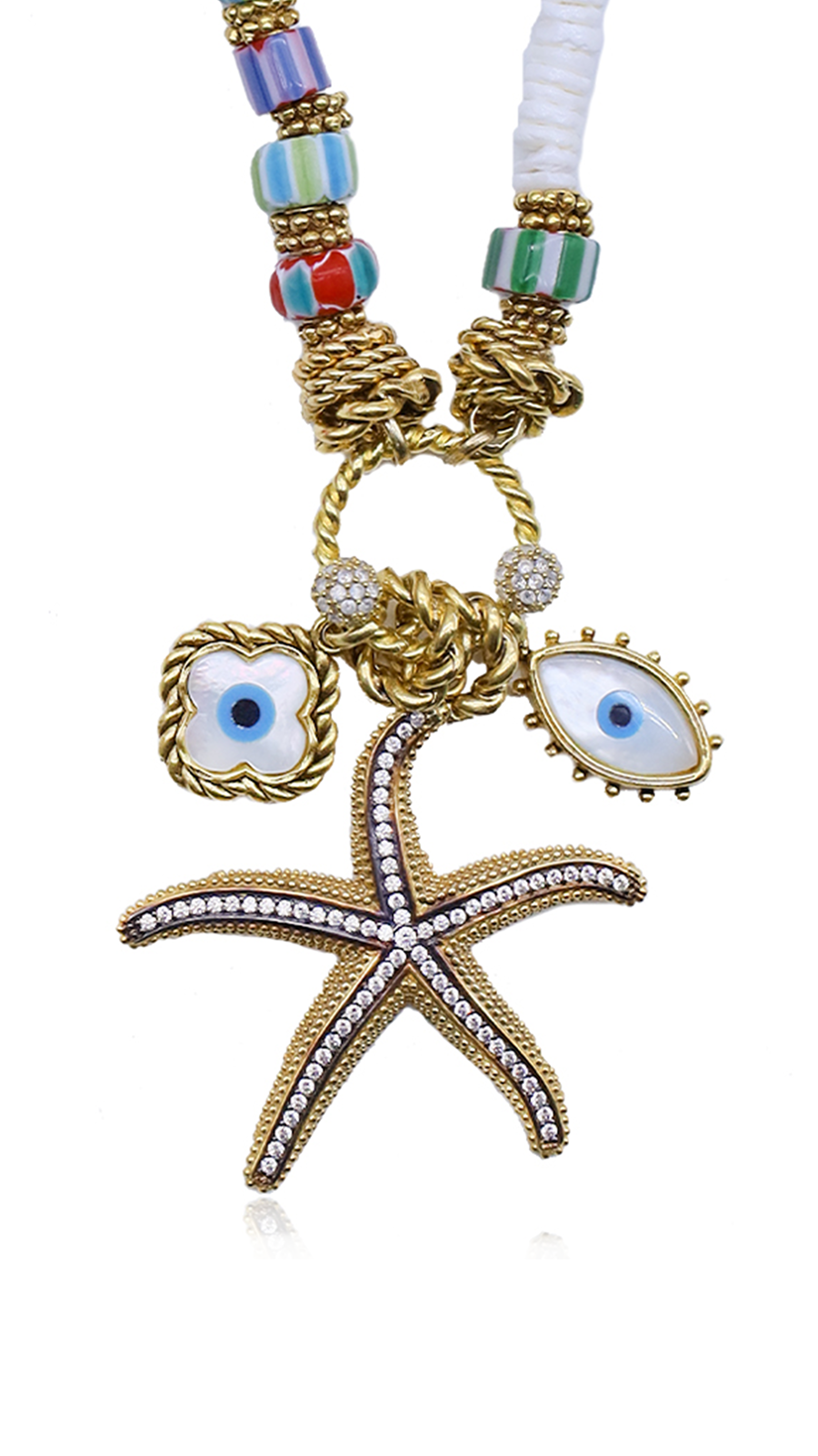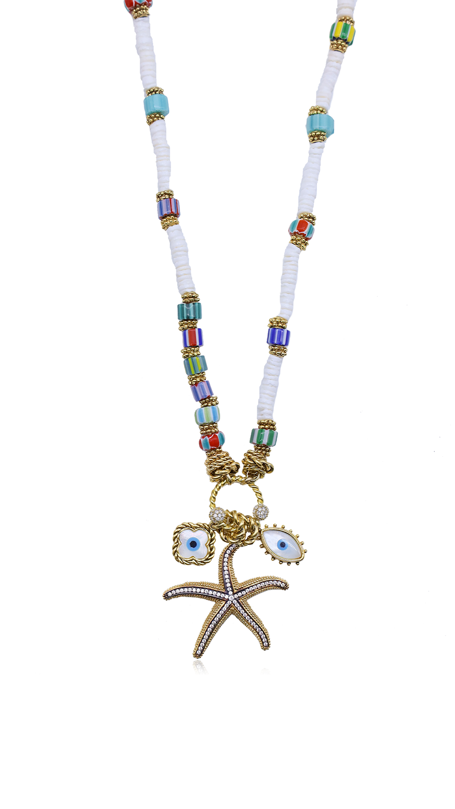 Tasarımın merkezindeki kristal taşlarla süslenmiş deniz yıldızı charmı, maceraperest bir ruhun ve yazın sınırsız özgürlüğünün simgesi. Ona eşlik eden göz motifli charmlar ise kolyeye koruyucu bir anlam ve sıra dışı bir karakter kazandırıyor.