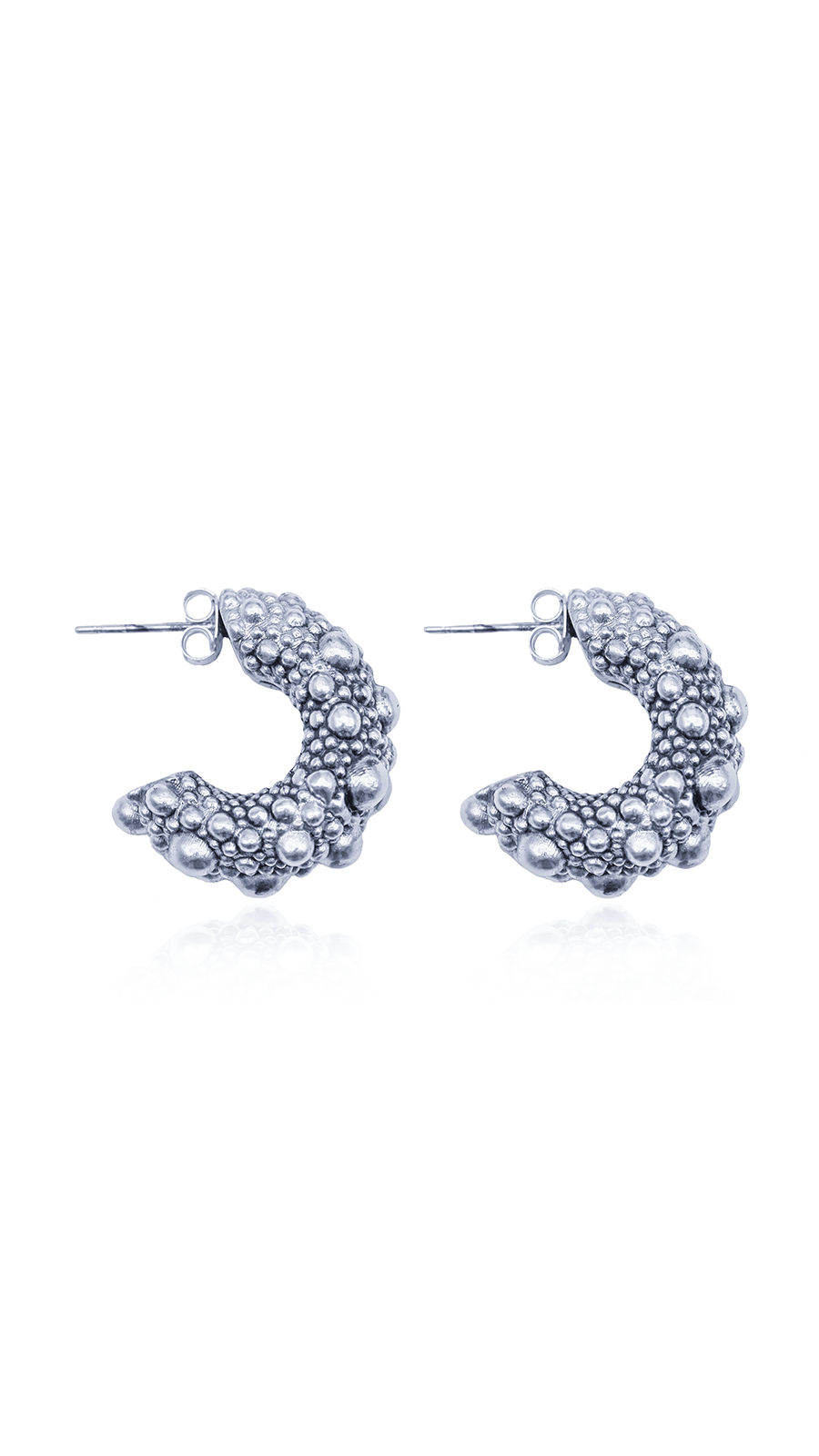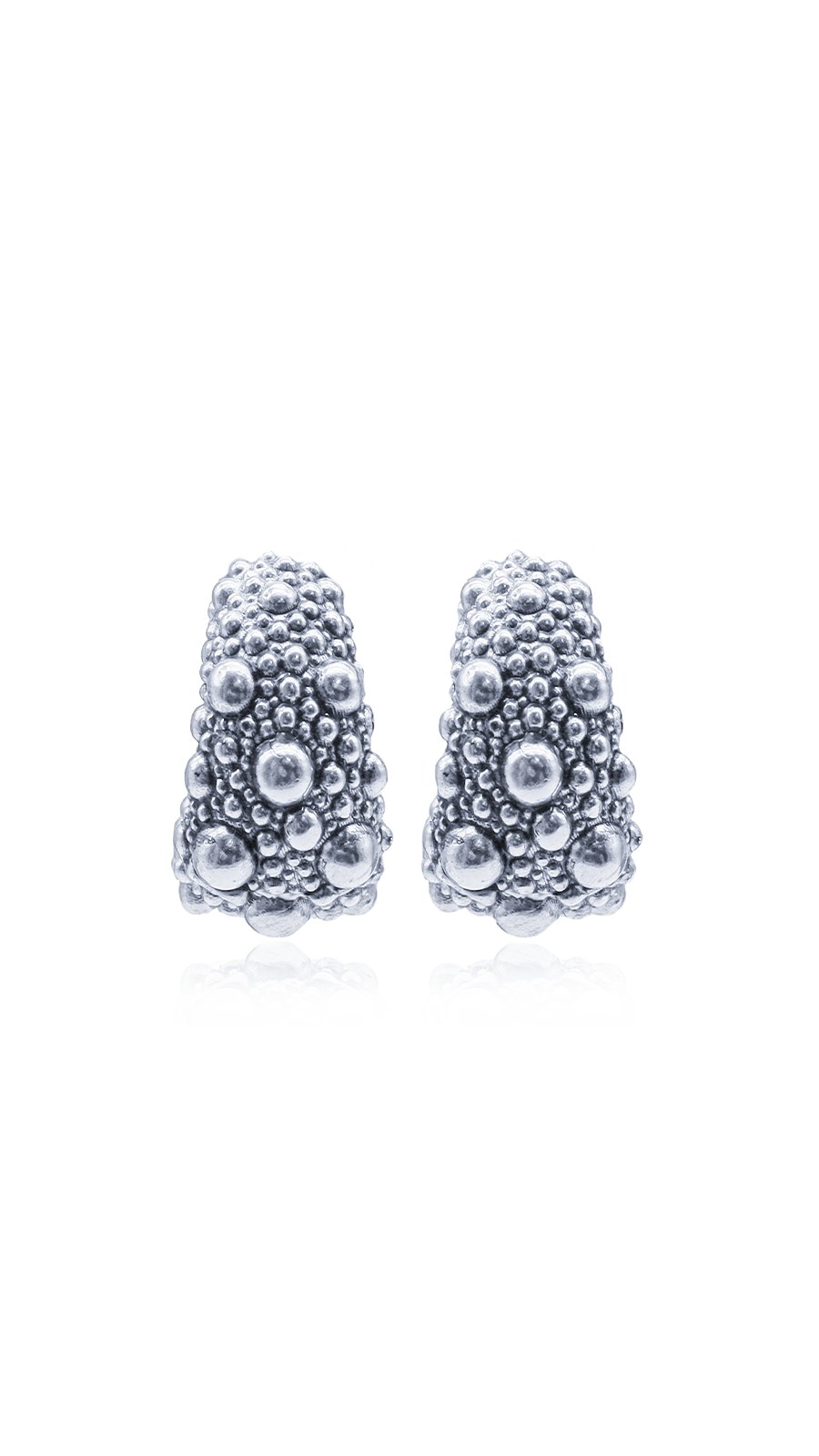 TITANIS KÜPE, cesur ve sıra dışı tasarımıyla güçlü bir duruş sergiliyor. Yarım halka formu, irili ufaklı patlak yuvarlak formlu güverselerle bezeli, agresif ve iddialı bir görünüm sunuyor. Her bir detayında enerjisini hissettiren bu küpe, sert dokusuyla klasik halka küpe anlayışını baştan yaratıyor.