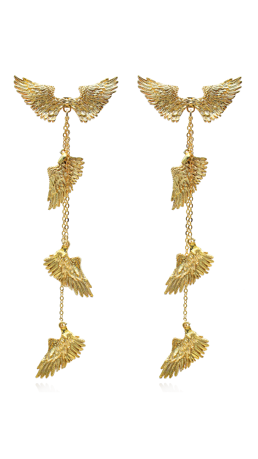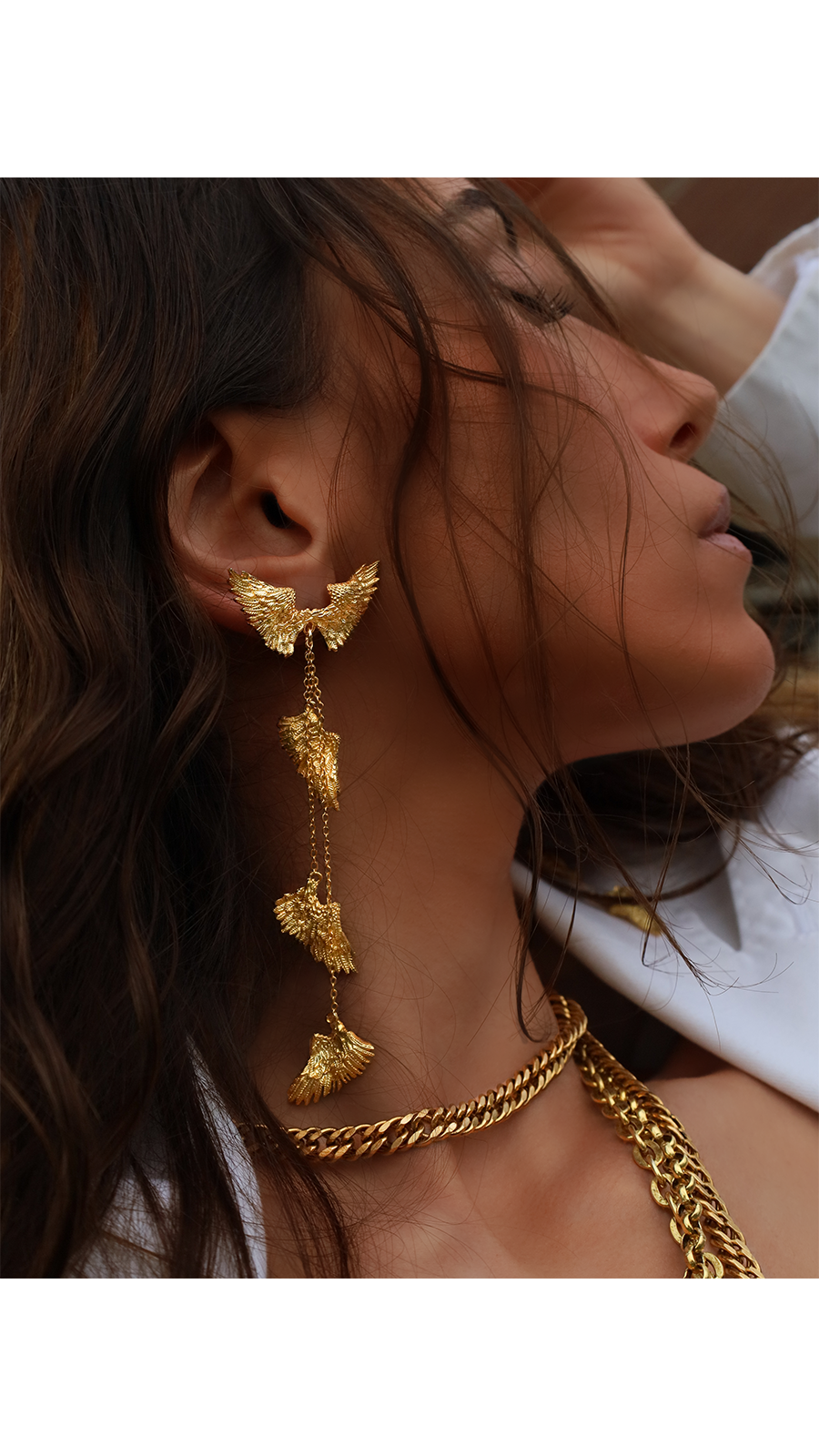 Volare Sallantılı Küpe, gökyüzüne olan özlemi, özgürlüğün en saf haliyle simgeleyen bir tasarıma sahip. Antik çağlardan beri insanın hayal gücünü kanatlandıran meleklerin, onların cesareti ve saf güzelliği, Mehtap Hacısalihoğlu'nun elinden çıkarak altın ışıltısıyla hayat bulmuş. Her bir kanat, ince bir zincirle bağlanarak asil bir dans sergilerken, hareket ettiğinde göz kamaştırıcı bir zarafet yansıtır. VOLARE SALLANTILI KÜPE, klasik ve çağdaş çizgilerin birleştiği, Bayemeyc imzasını taşıyan bir tasarım olup, giyenine adeta bir güç ve ışık katar. Giyildiğinde, melek kanatlarının her sallantısında, özgürlük ve hafifliğin meltemini hissedebilirsiniz. VOLARE SALLANTILI KÜPE, kullananına yalnızca bir aksesuar olmanın ötesinde, bir duruş ve anlam katmak için tasarlandı.