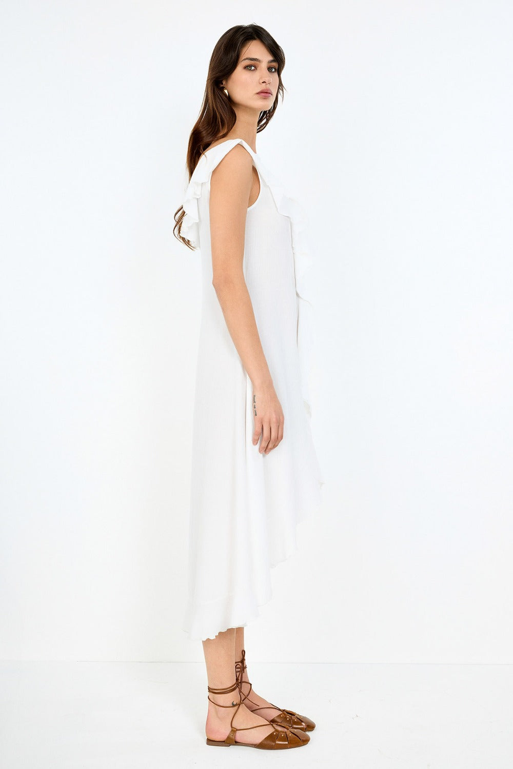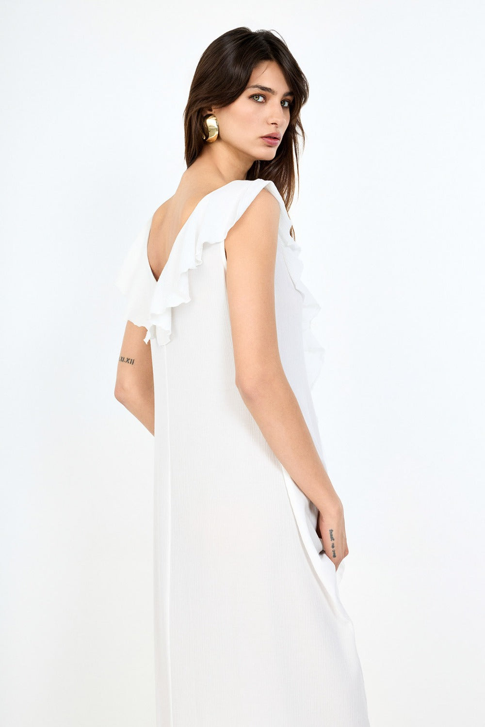 Crinkle dokuma kumaşı, kendine has kırışık yüzeyiyle modern bir görünüm sunarken, öndeki bağcık detayı ve zarif volan kesimi ile feminen bir stil ortaya çıkarıyor.