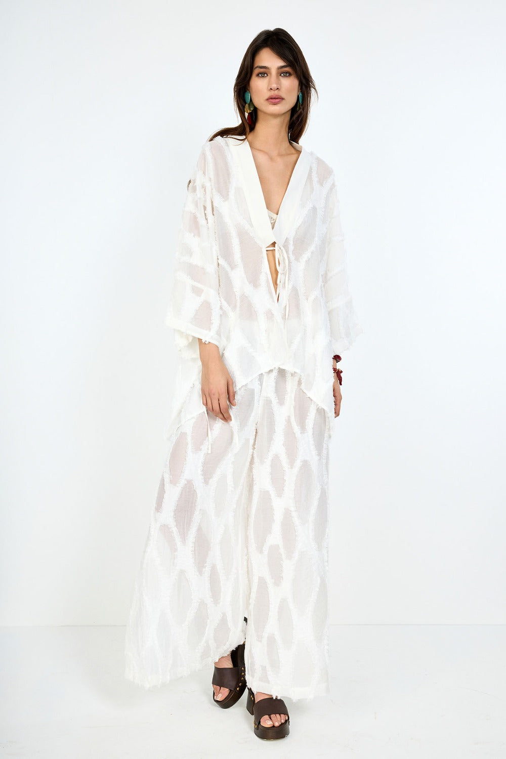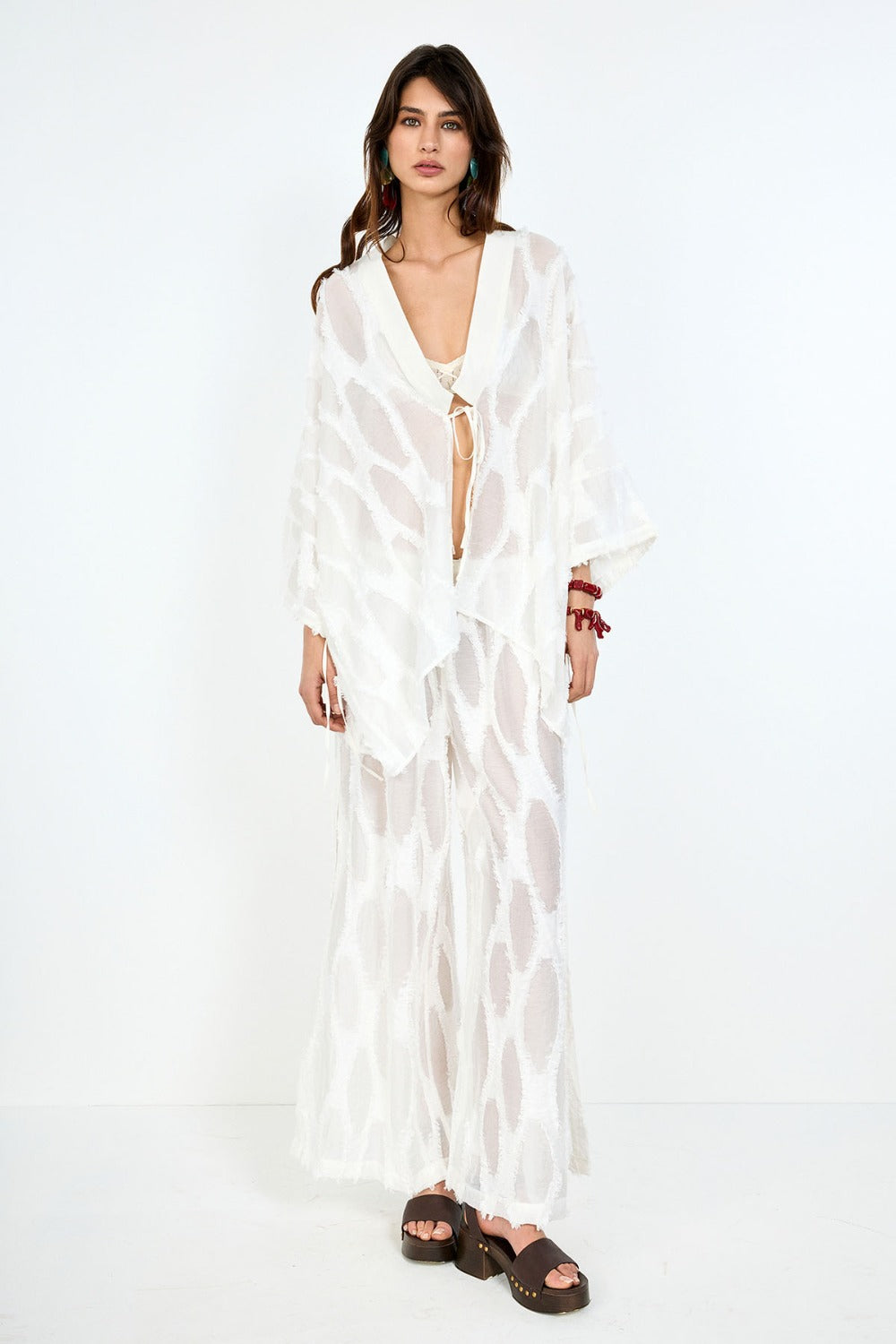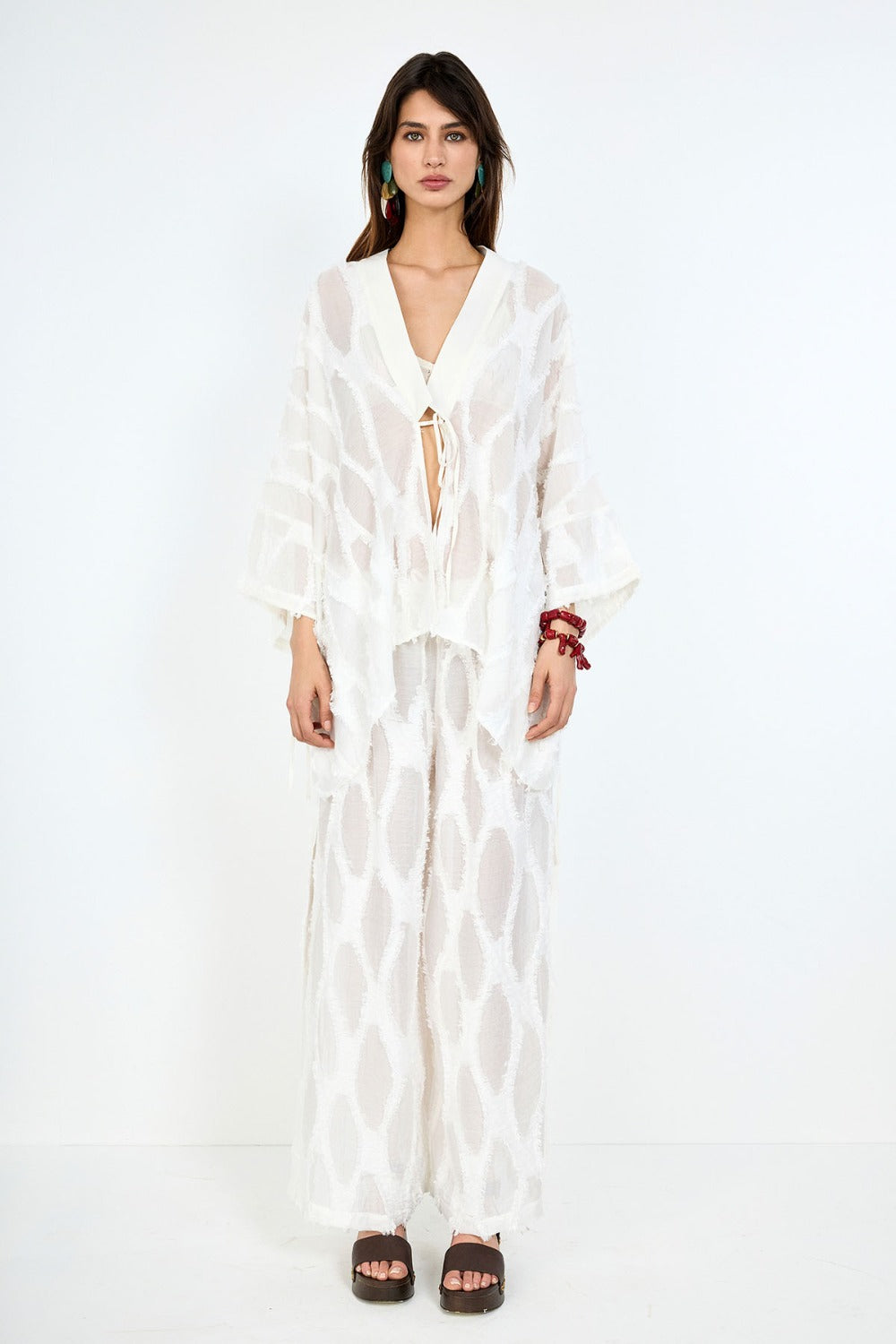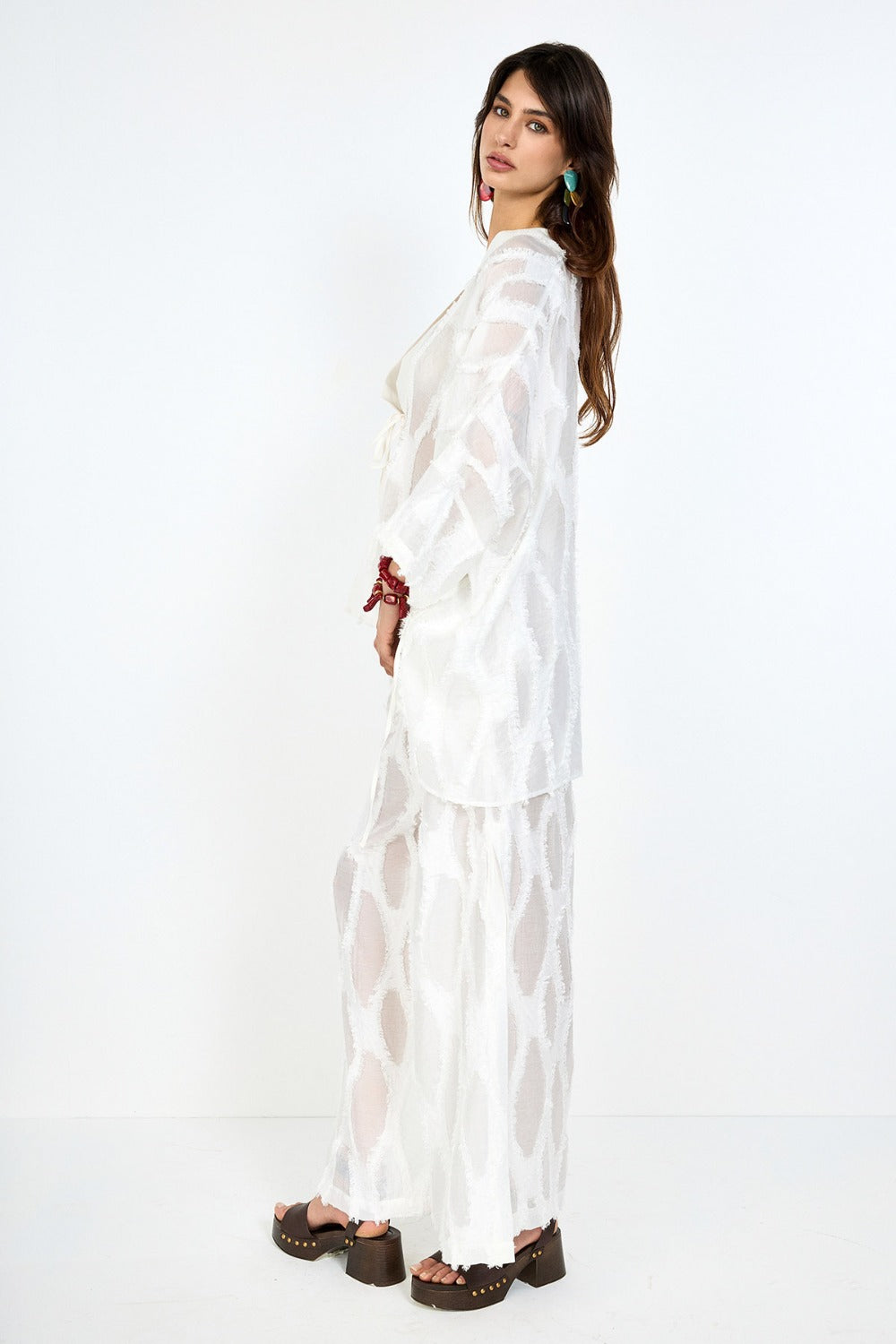 Minimalist çizgilerle Akdeniz ruhunu bir araya getiren Boneqa Beyaz Jakarlı Pantolon, yaz stilinizin sofistike tamamlayıcısı olmaya aday. Jakar dokulu özel kumaşı, hafif yapısı ve modern kesimiyle hem şehir hayatında hem tatilde konforla şıklığı bir araya getiriyor.