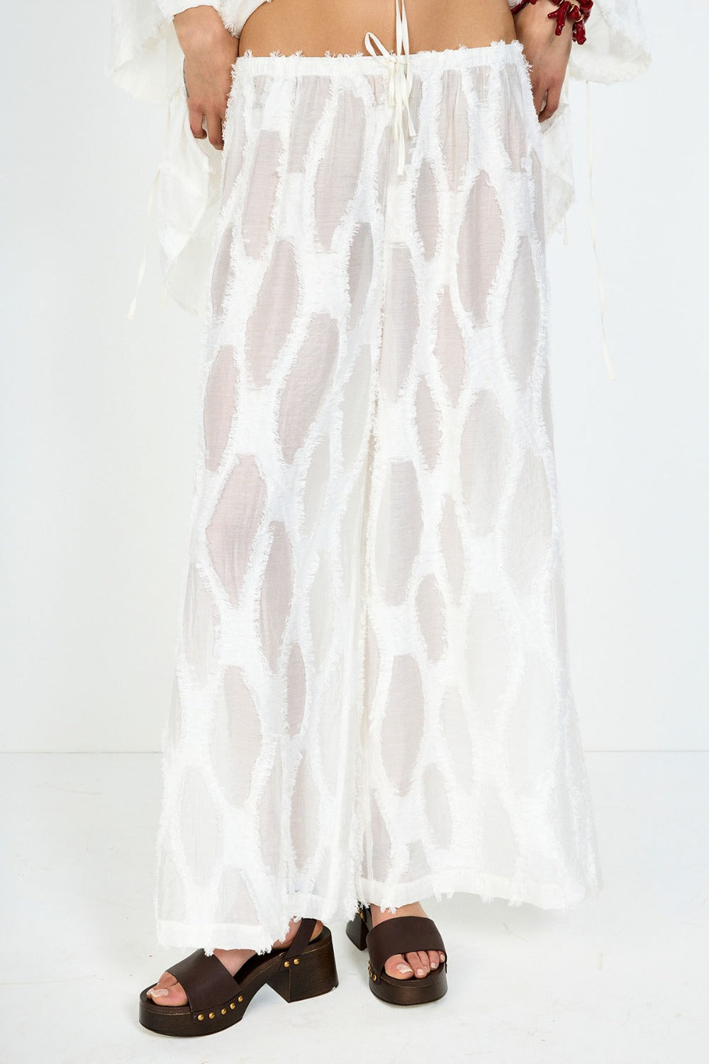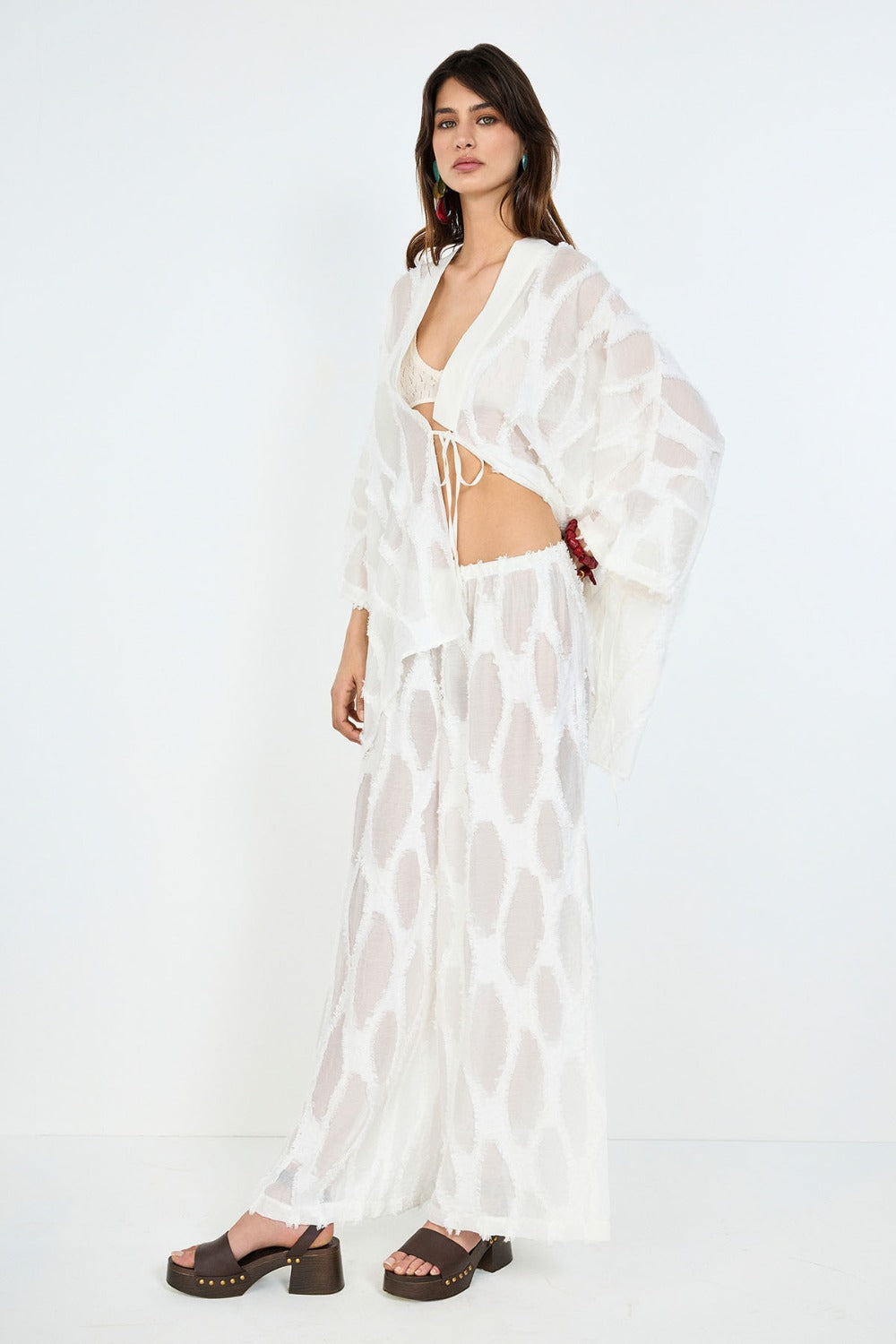 Geniş paça tasarımı ve beldeki bağlama detayı sayesinde dinamik ve zarif bir siluet sunan bu pantolon, viskon karışımlı yapısıyla gün boyu ferah kalmanızı sağlıyor. Üstelik terletmeyen, cilt dostu dokusu sayesinde plajdan akşam yemeğine kadar birçok farklı ortamda güvenle tercih edebilirsiniz.