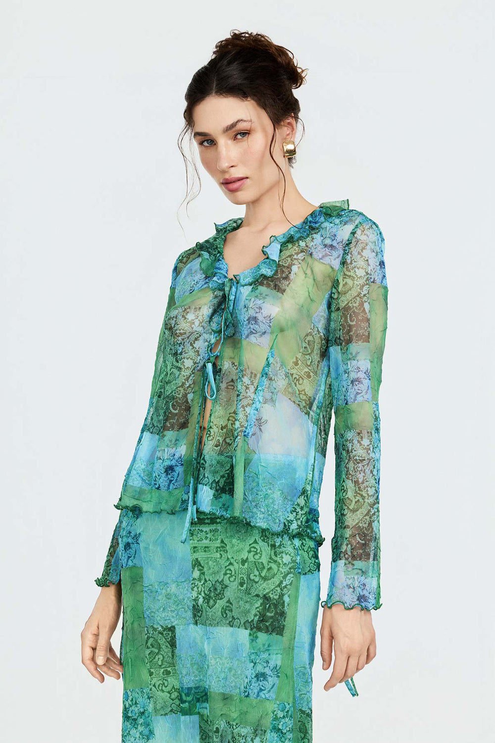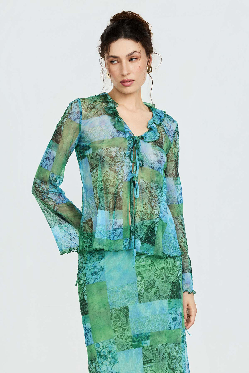 Kollarındaki ve ön kısmındaki bağlama detayları, bu topa sadece estetik bir dokunuş değil, aynı zamanda esnek ve konforlu bir kullanım sunuyor. Uçuşan tül dokusu, hafifliğiyle yaz aylarında ferahlık sağlarken; özgün deseni ile her kombine stil sahibi bir enerji katıyor.