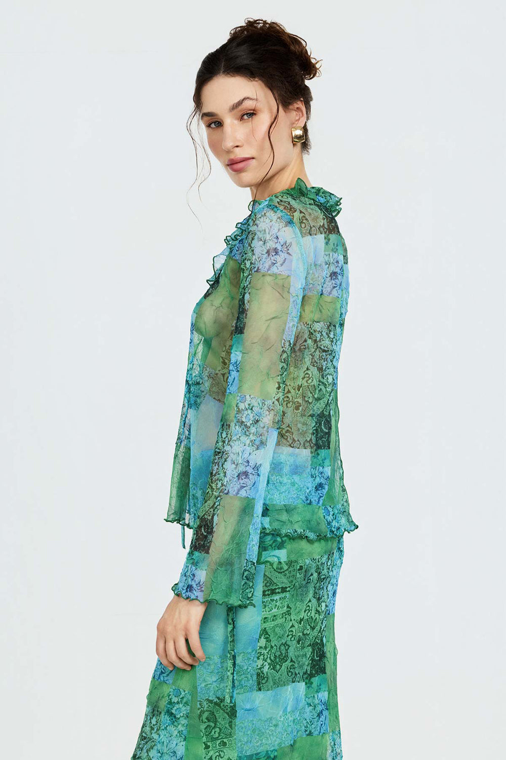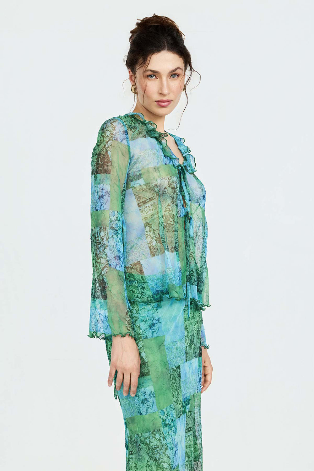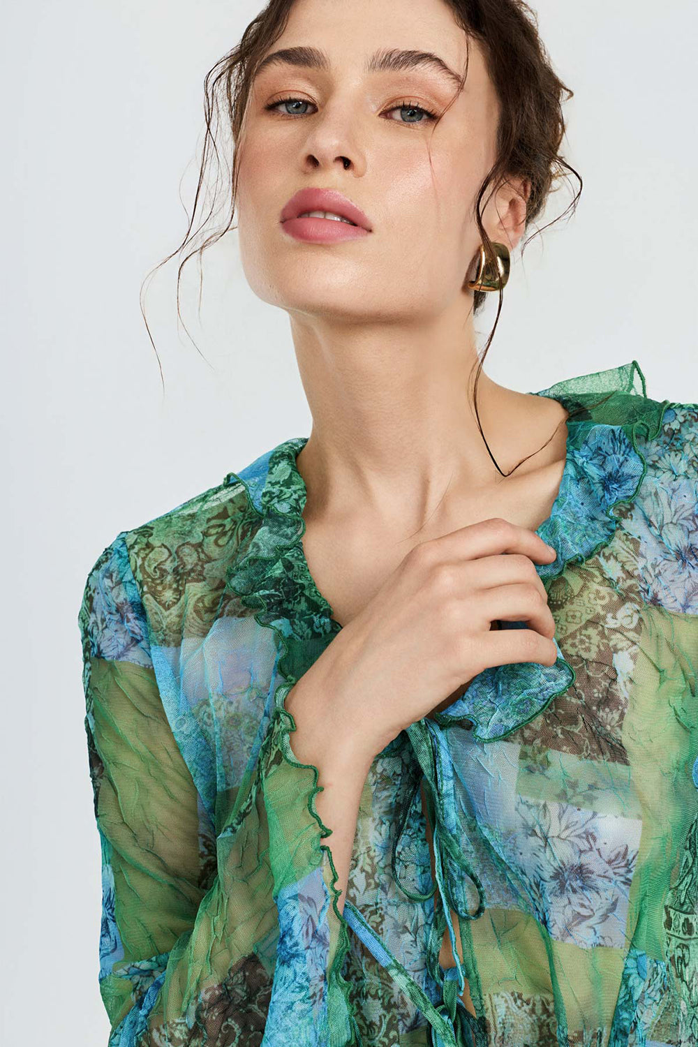 Boneqa’nın İlkbahar/Yaz koleksiyonuna özel olarak tasarlanan Desenli Bağ Detaylı Tül Top, kendinden kırışık dokusu ve markaya özgü desenleriyle fark yaratan, sofistike bir parça.