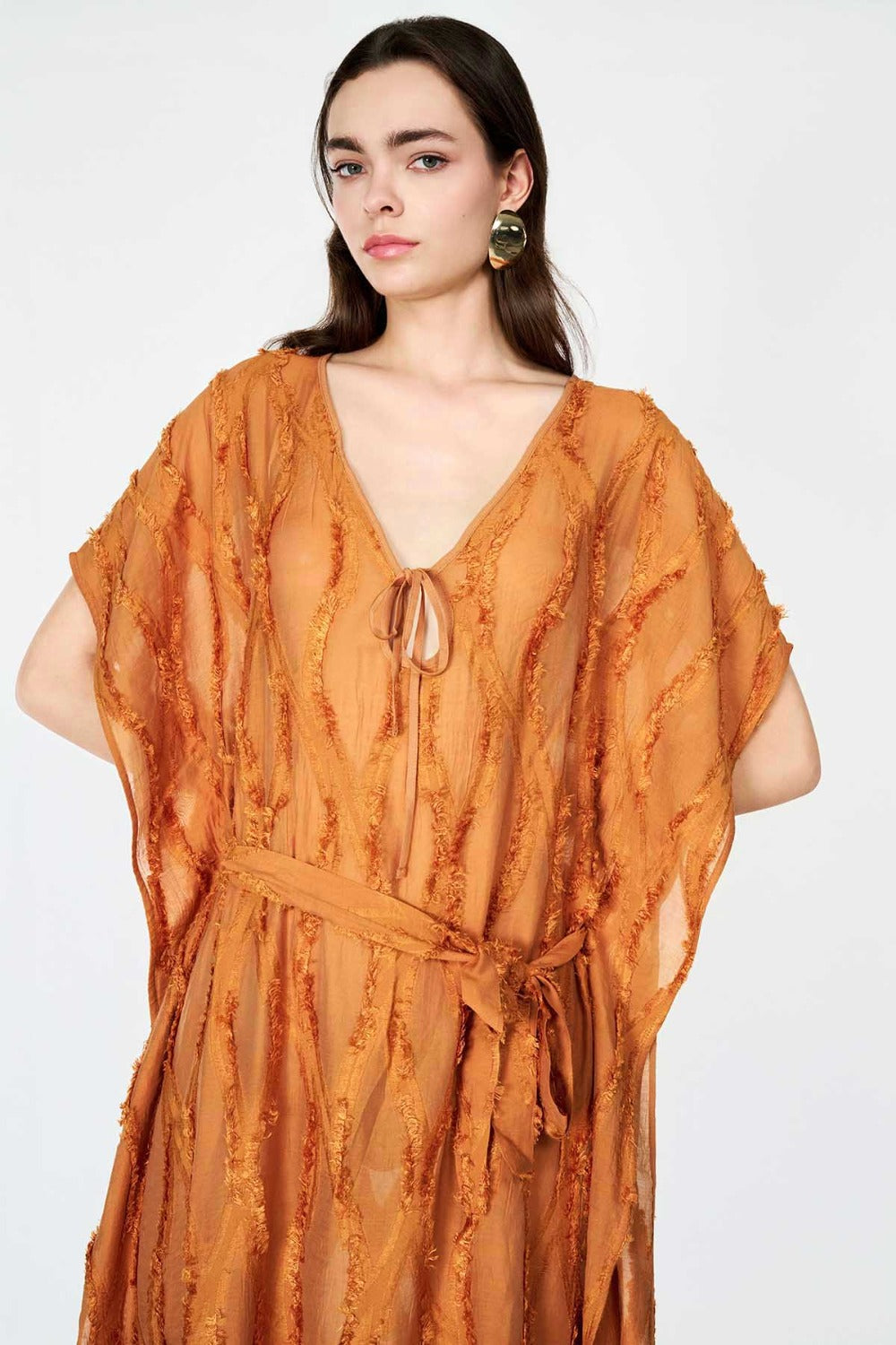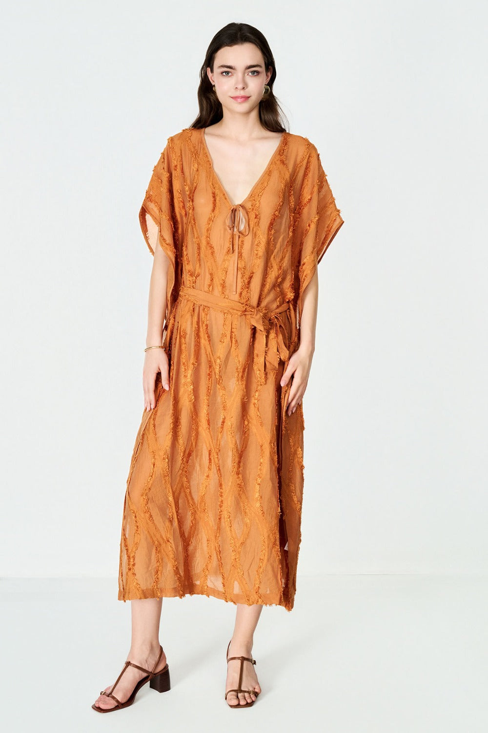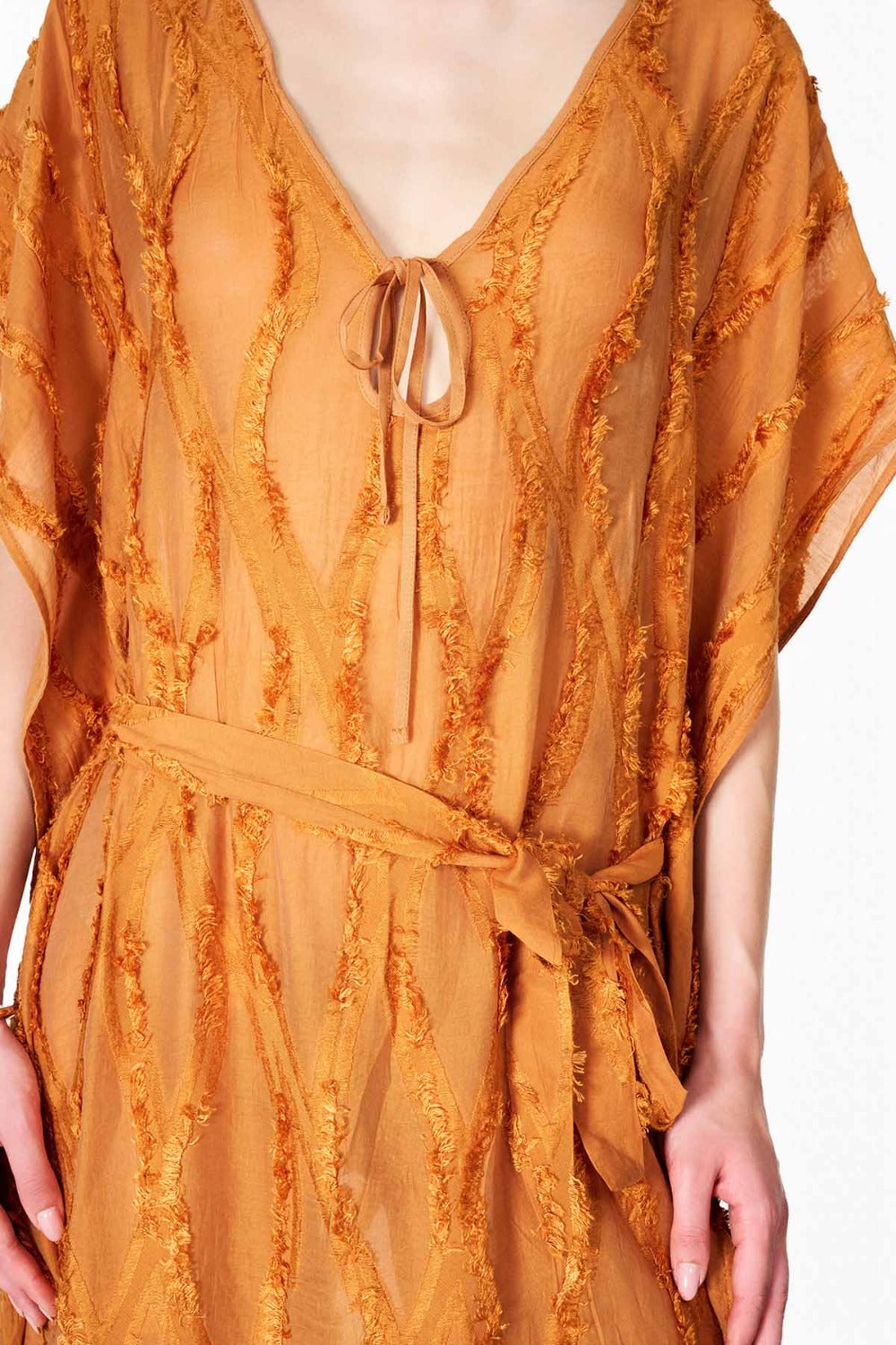 Boneqa’nın Design koleksiyonuna özel bu Tarçın Jakarlı kadın elbise, hem plaj şıklığını hem de yaz akşamlarının rahat zarafetini bir arada sunuyor. Derin V yakası, alçak kol oyukları ve yüksek yan yırtmaçları sayesinde bikini üzerine giymek için ideal bir tunik olmasının yanı sıra; şehirde veya tatil sonrası akşam etkinliklerinde de rahatlıkla kullanılabilir.