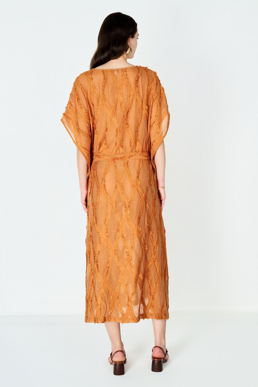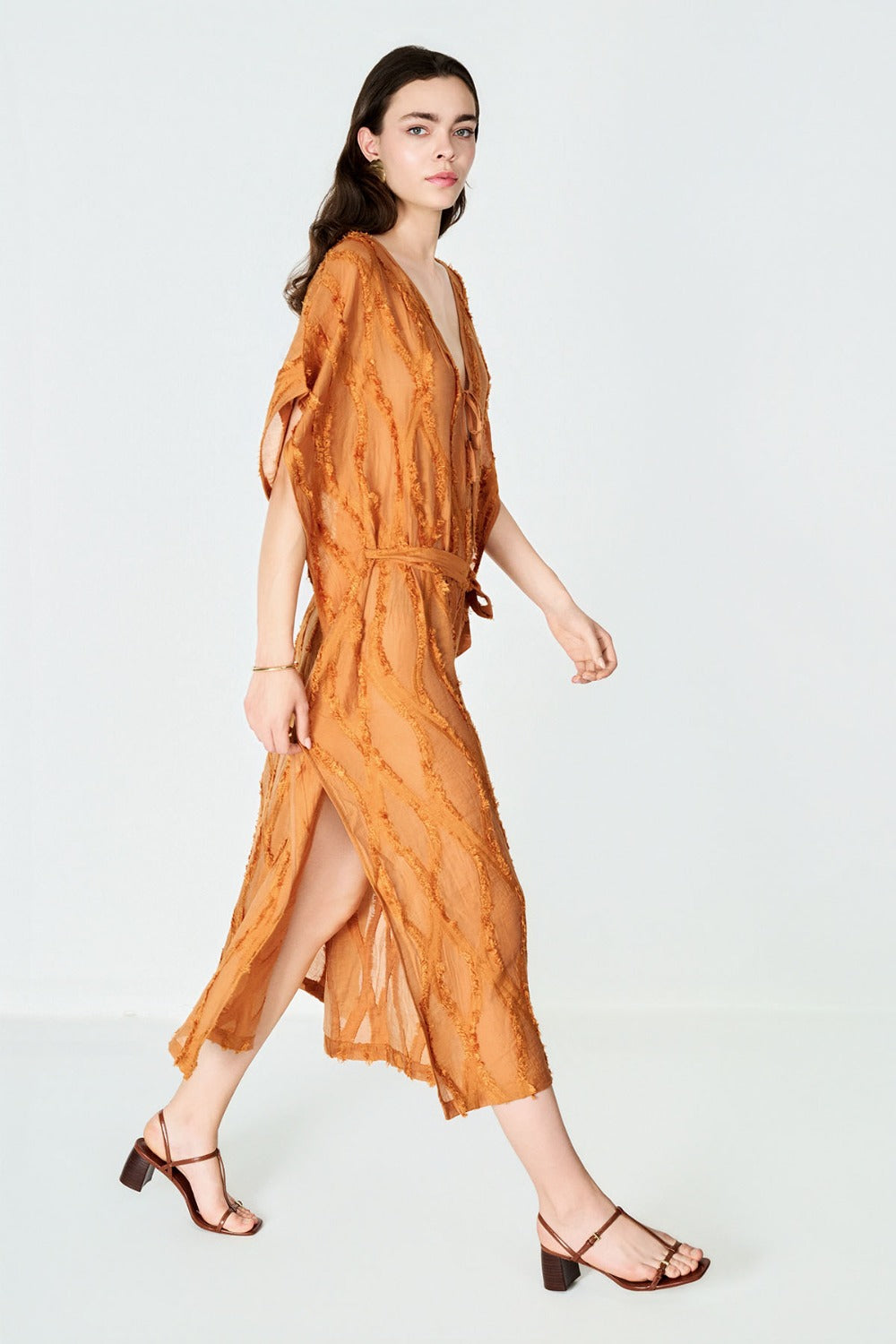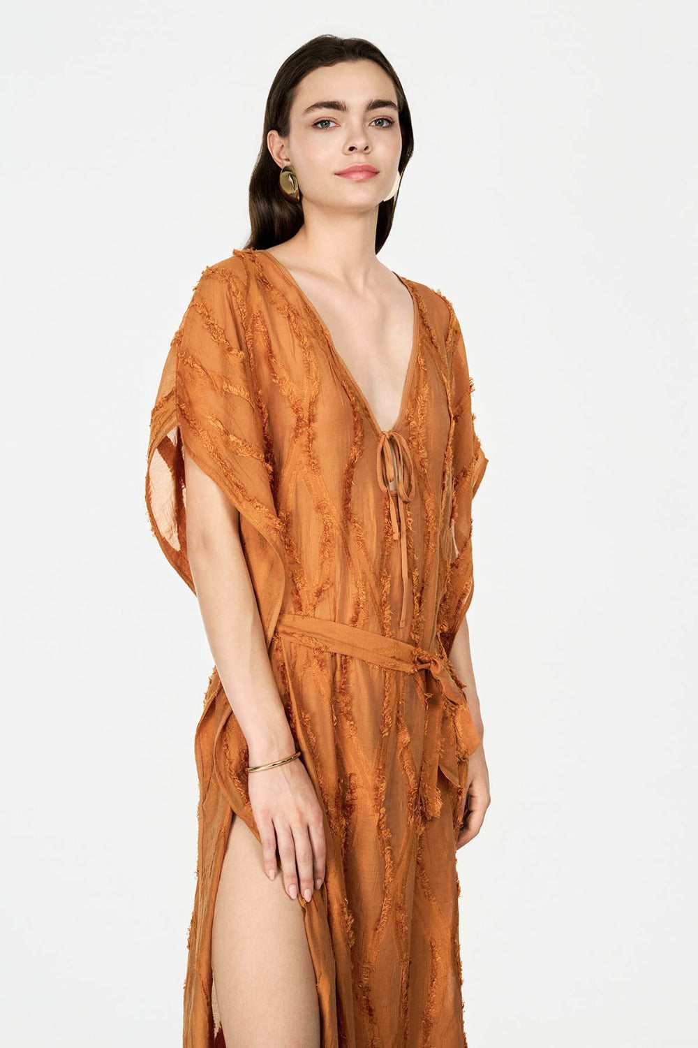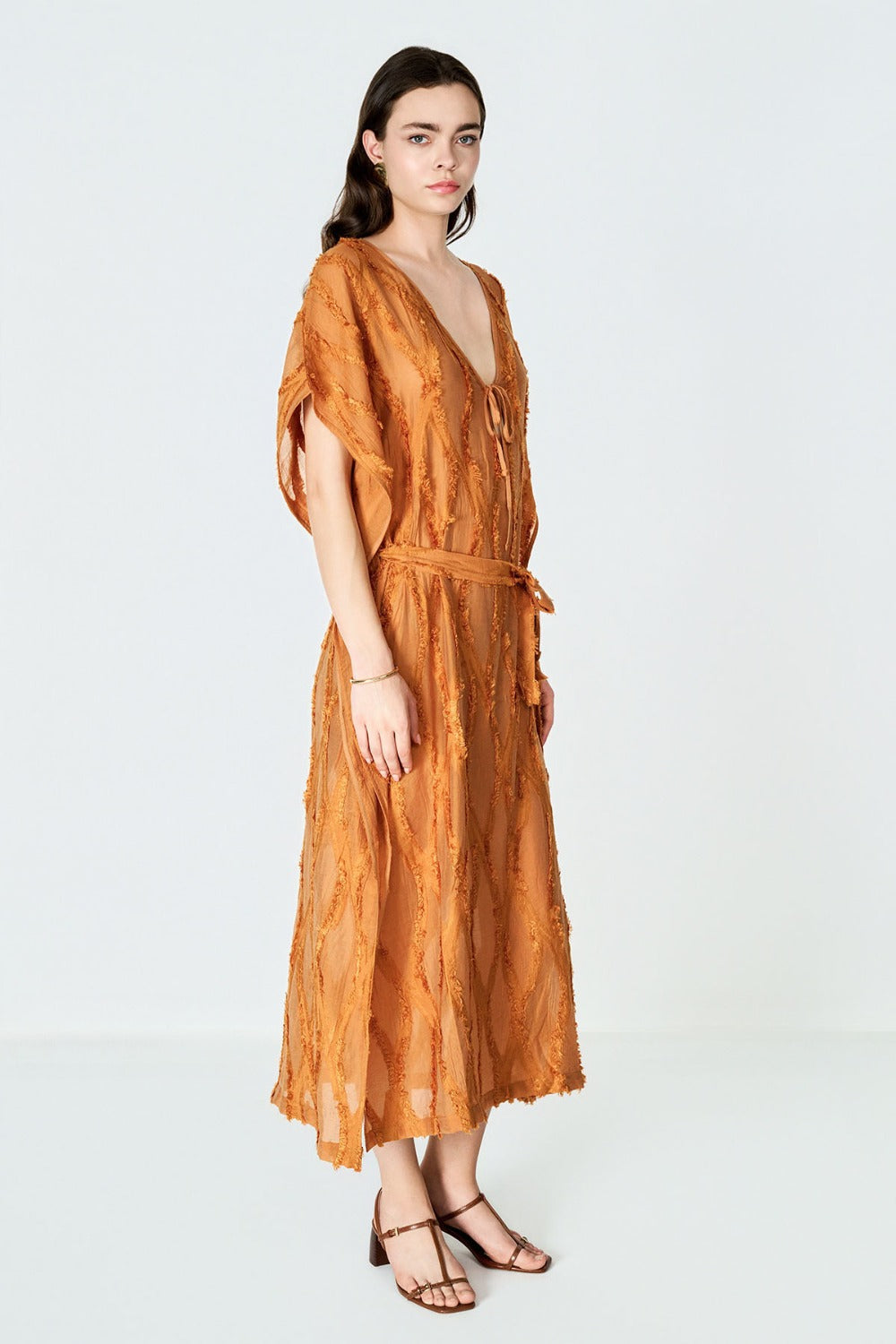Boneqa’nın Design koleksiyonuna özel bu Tarçın Jakarlı kadın elbise, hem plaj şıklığını hem de yaz akşamlarının rahat zarafetini bir arada sunuyor. Derin V yakası, alçak kol oyukları ve yüksek yan yırtmaçları sayesinde bikini üzerine giymek için ideal bir tunik olmasının yanı sıra; şehirde veya tatil sonrası akşam etkinliklerinde de rahatlıkla kullanılabilir.