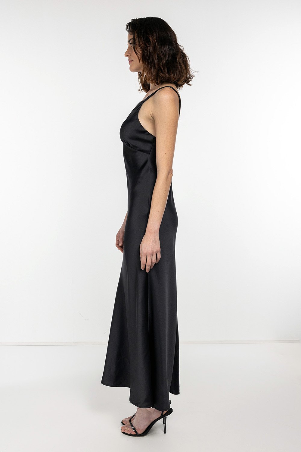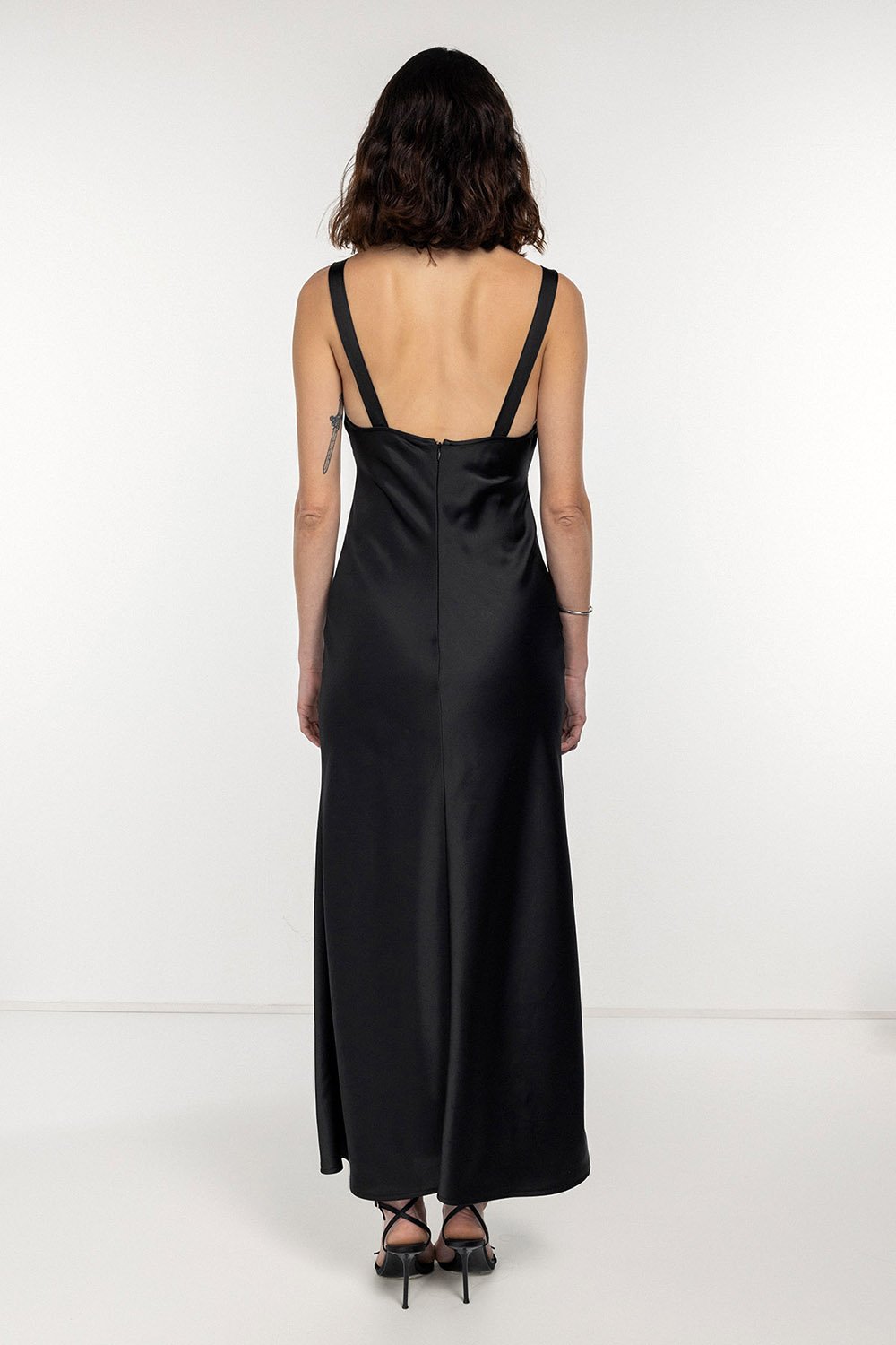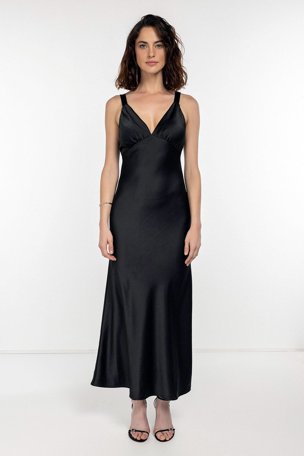 Göğüsteki büzgüler, roba kalın askı detayı, etek kısmındaki volanlı kullanım saten kumaş tercihi ile tasarımda uyumlu bir birliktelik yakalıyor.