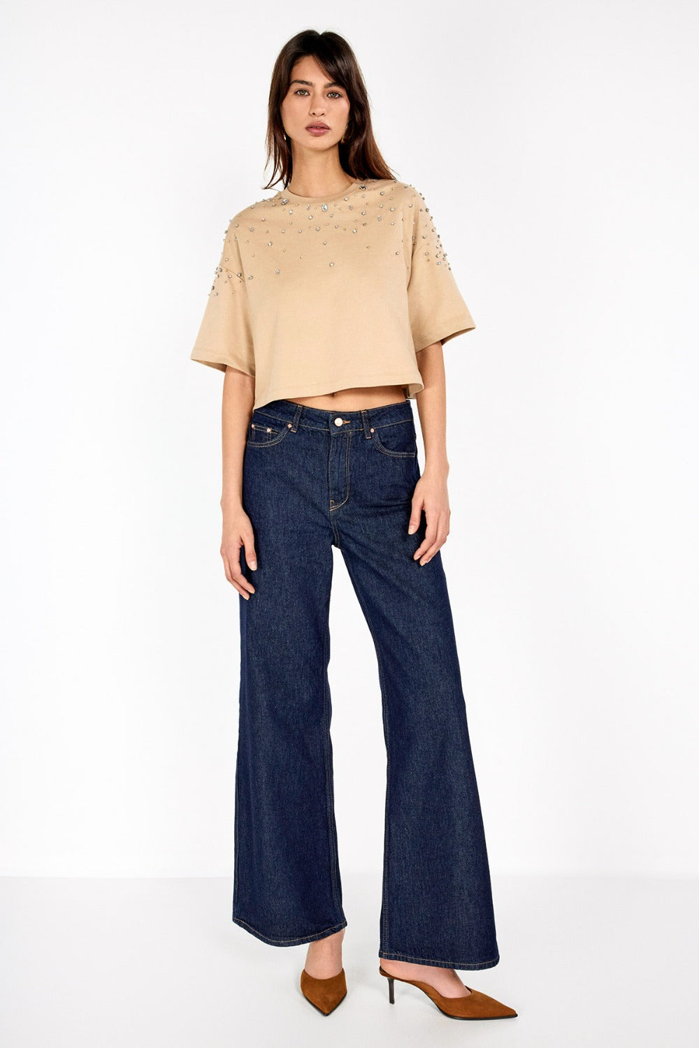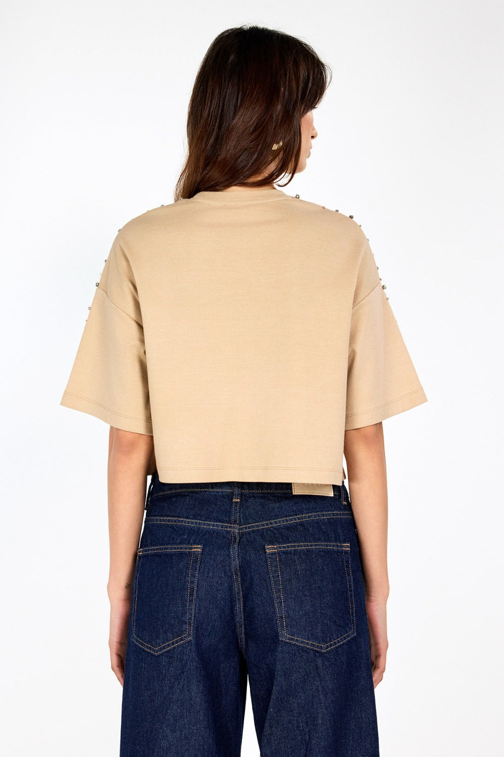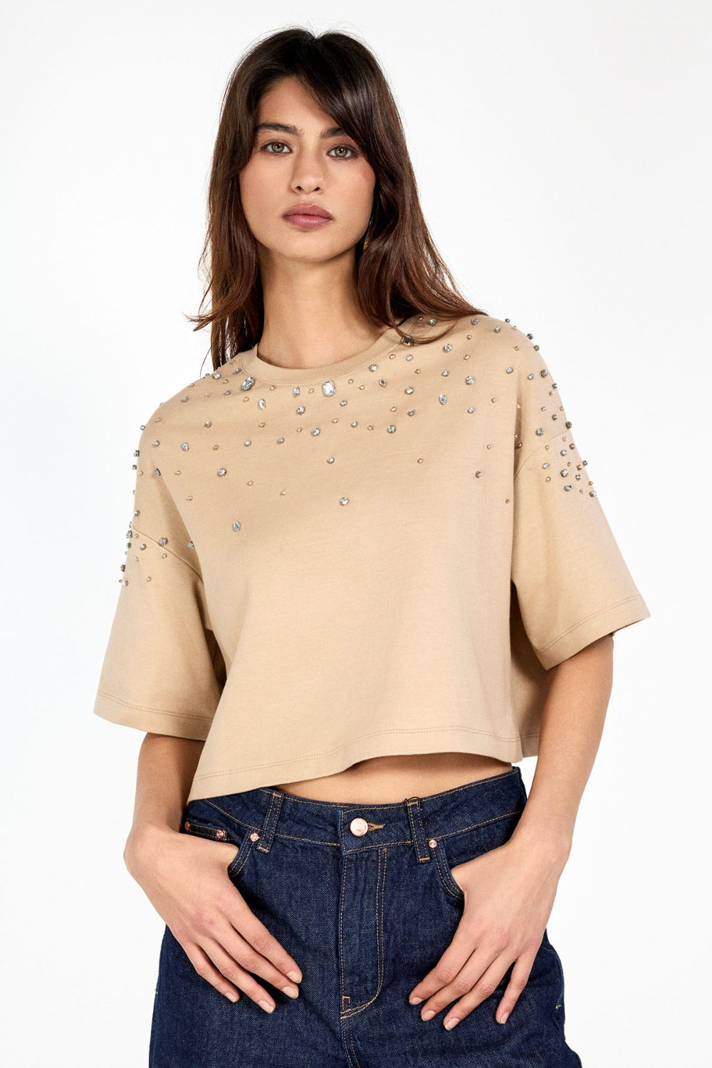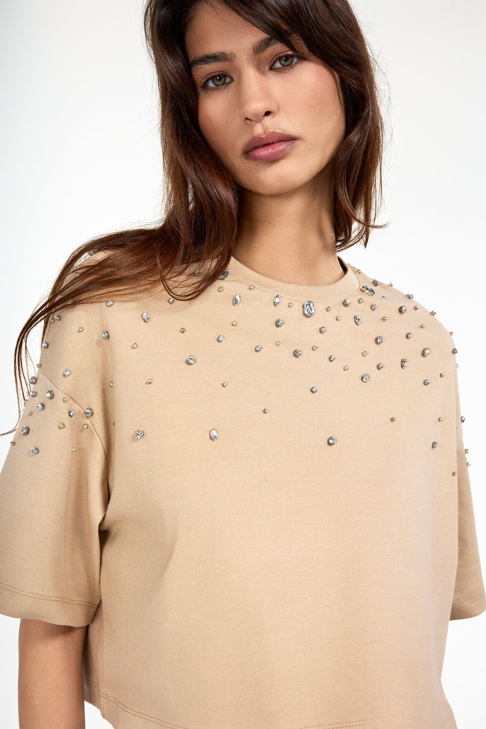 Boneqa’nın zarif ışıltısı, pamuk rahatlığıyla buluşuyor. %100 pamuk içeriğiyle gün boyu konfor sunan bu tişört, krem tonunun sakin şıklığını taş detaylarının göz alıcı dokunuşlarıyla tamamlıyor. Gövde ve kol kısmında yer alan taşların aşağıya doğru dağılan tasarımı, sade görünümü sofistike bir stile dönüştürüyor.